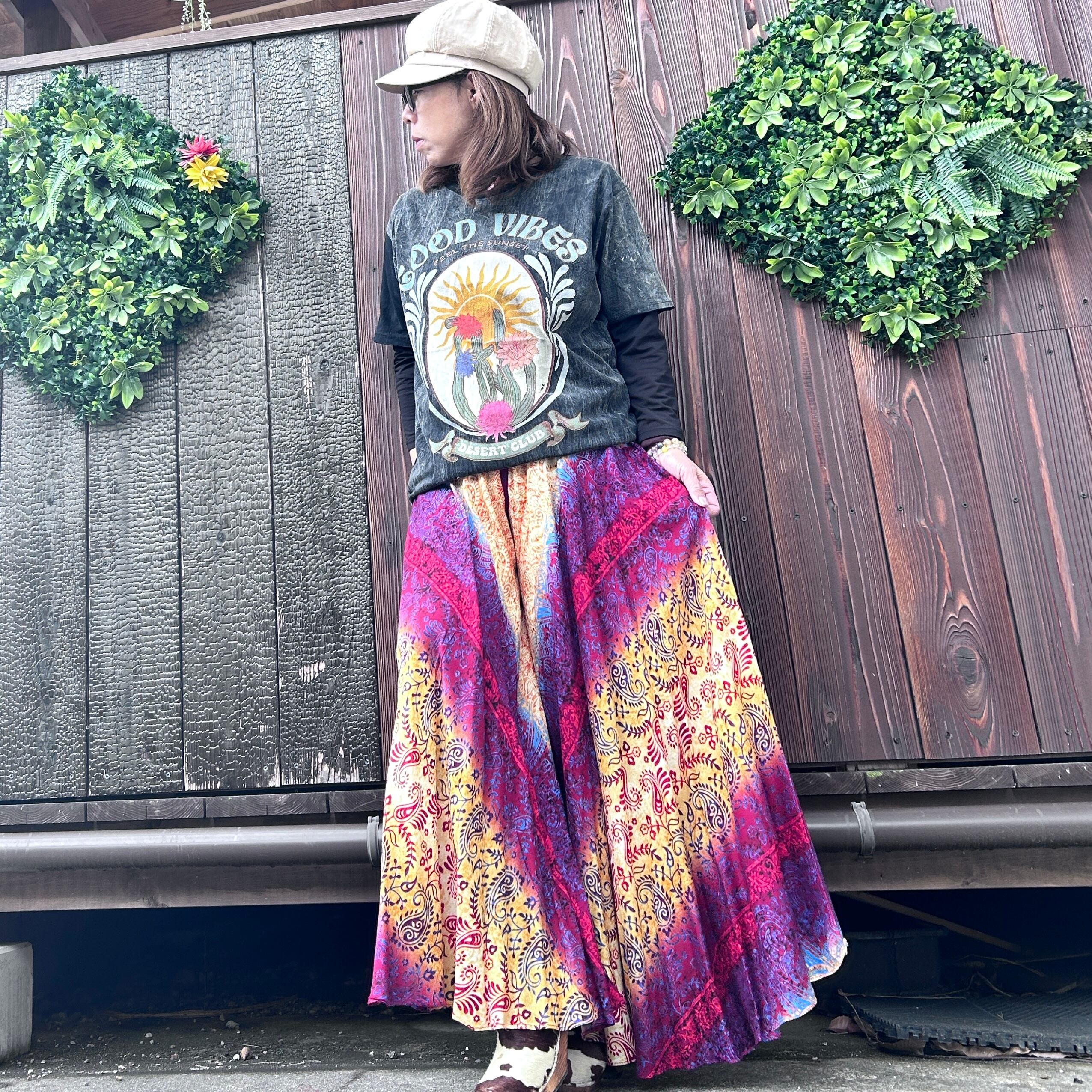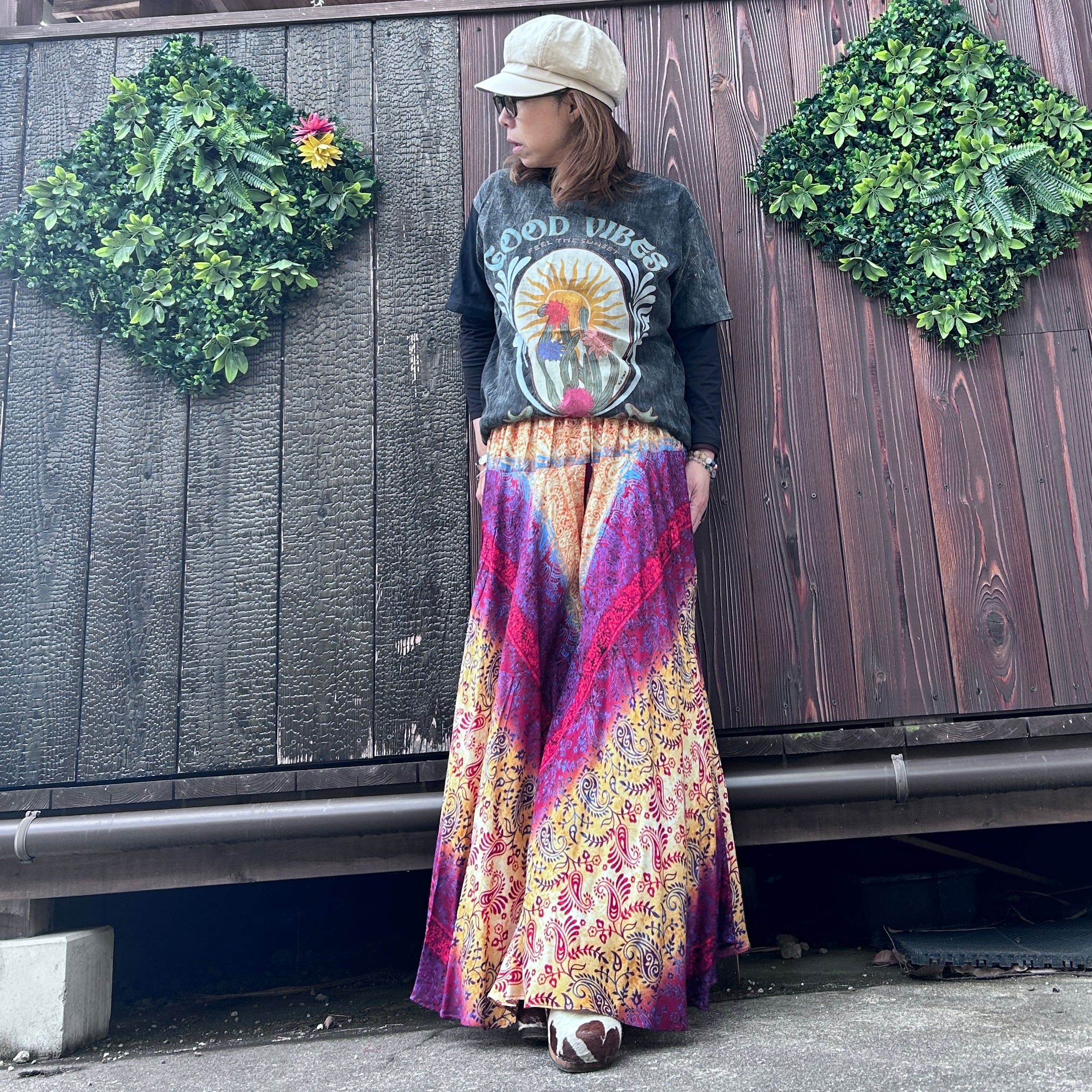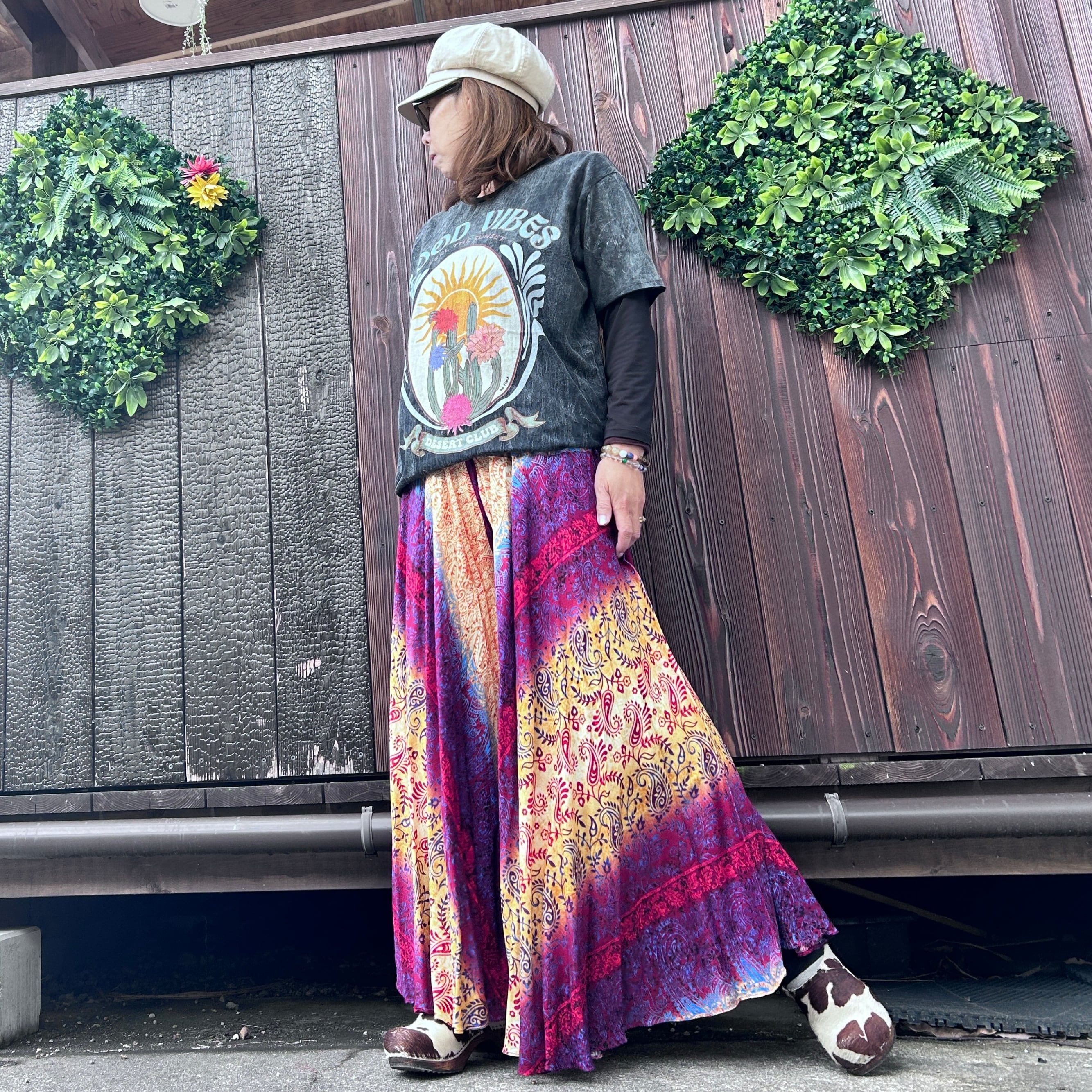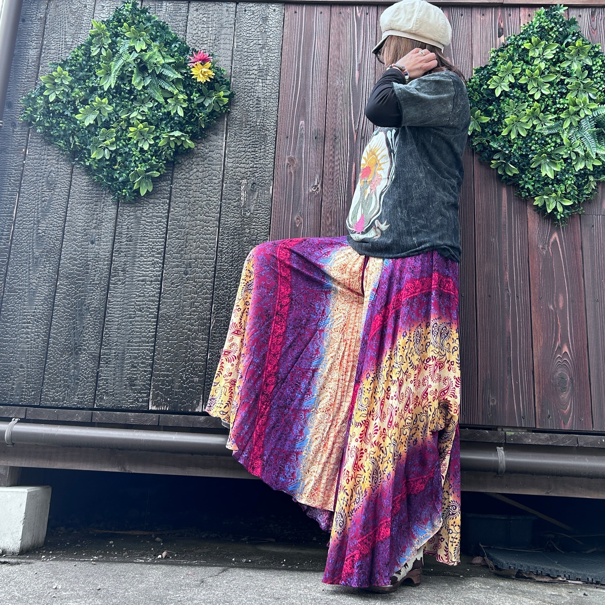 生地をたっぷり使った、ワイドなフレアパンツ。一見スカートに見え、生地も普通のワイドパンツの2倍つかっていますので、涼しくて楽々です。