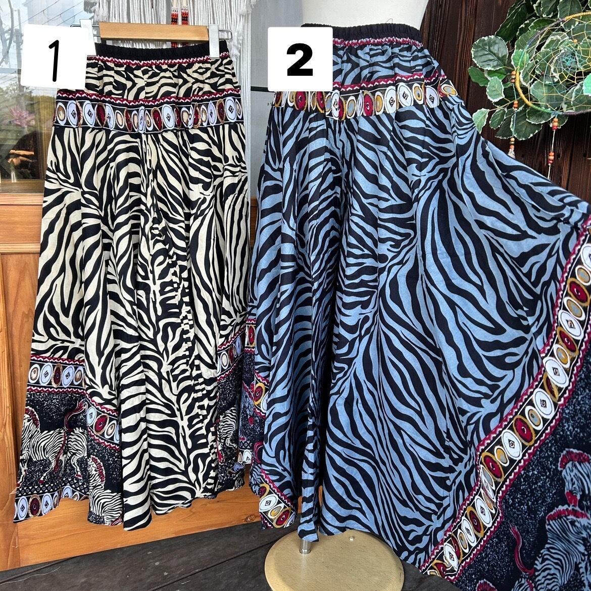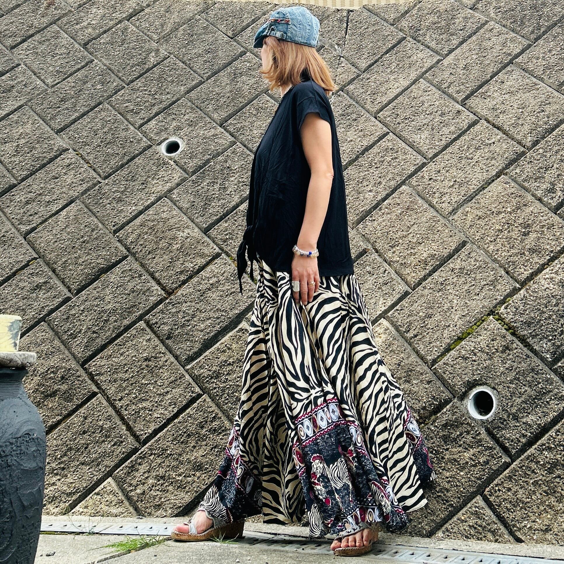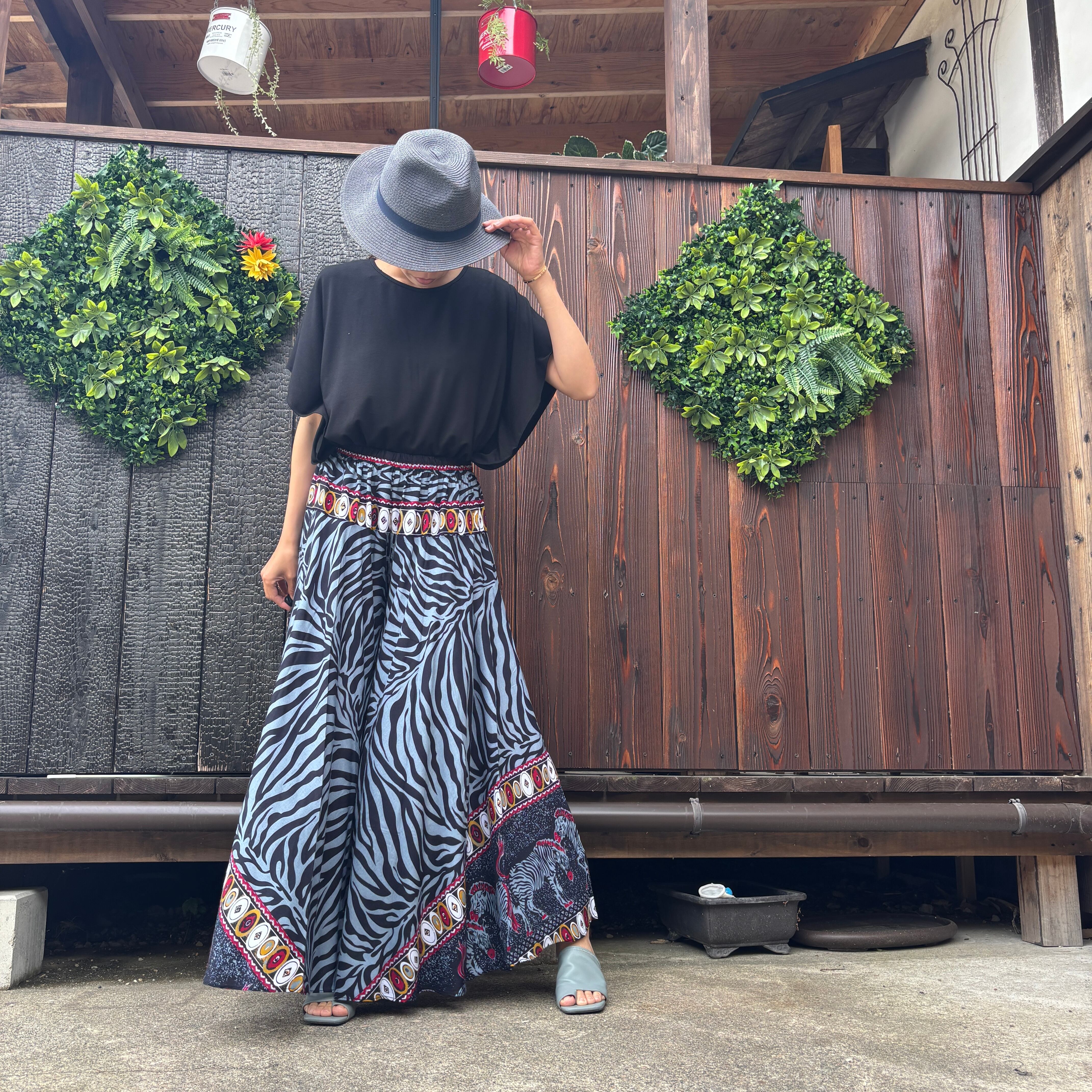 生地をたっぷり使った、ワイドなフレアパンツ。一見スカートに見え、生地も普通のワイドパンツの2倍つかっていますので、涼しくて楽々です。
