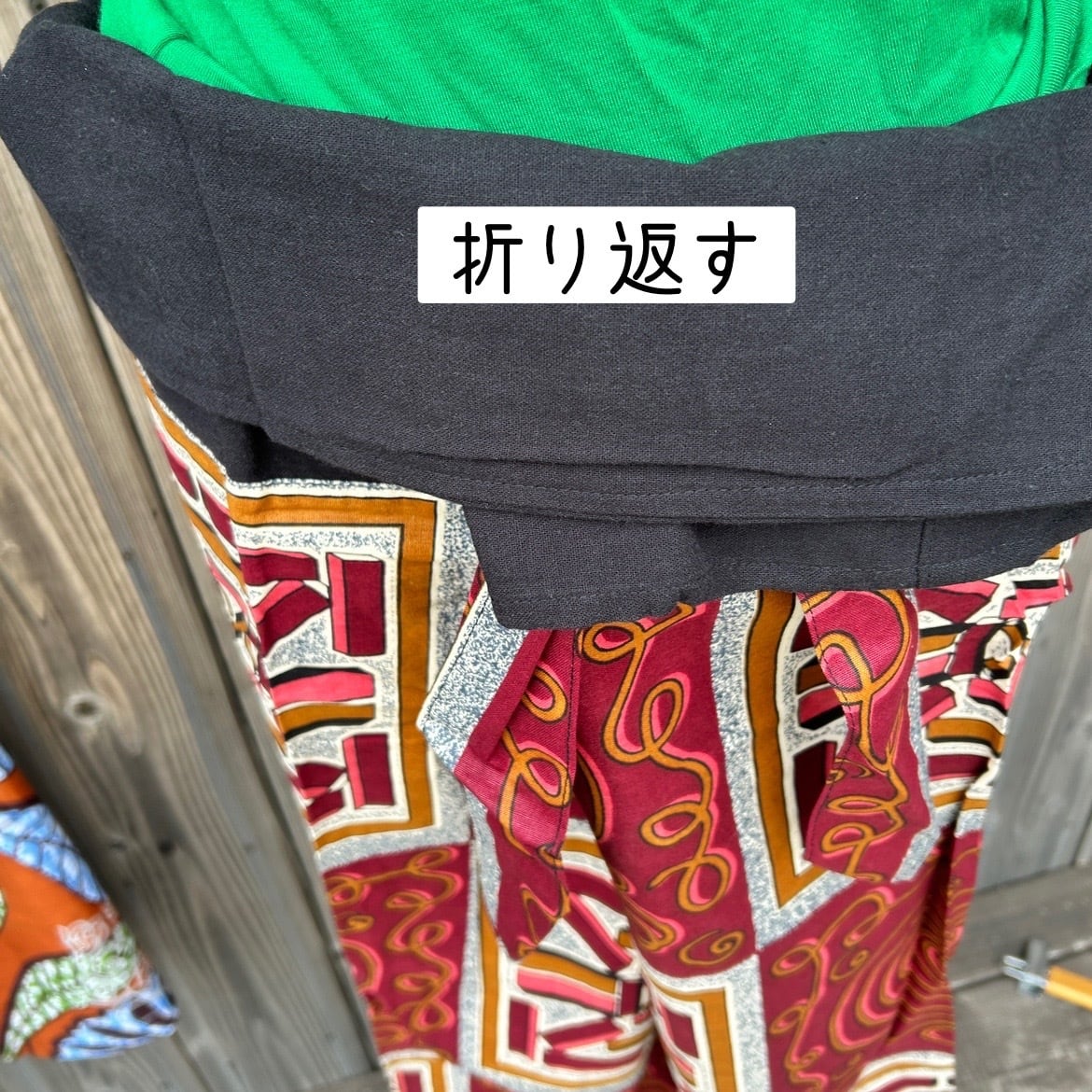 タイパンツは、紐付きの側を後ろにして履き、前で布を重ね、後ろの紐を前で結んで腰で履きます。その後、紐の上の布を折り返し、腰骨あたりまで少し下げます。_ ウエストでギャザーを寄せて履く方法もあります。重ね方や紐の位置は、自分の履きやすいように調整できます。