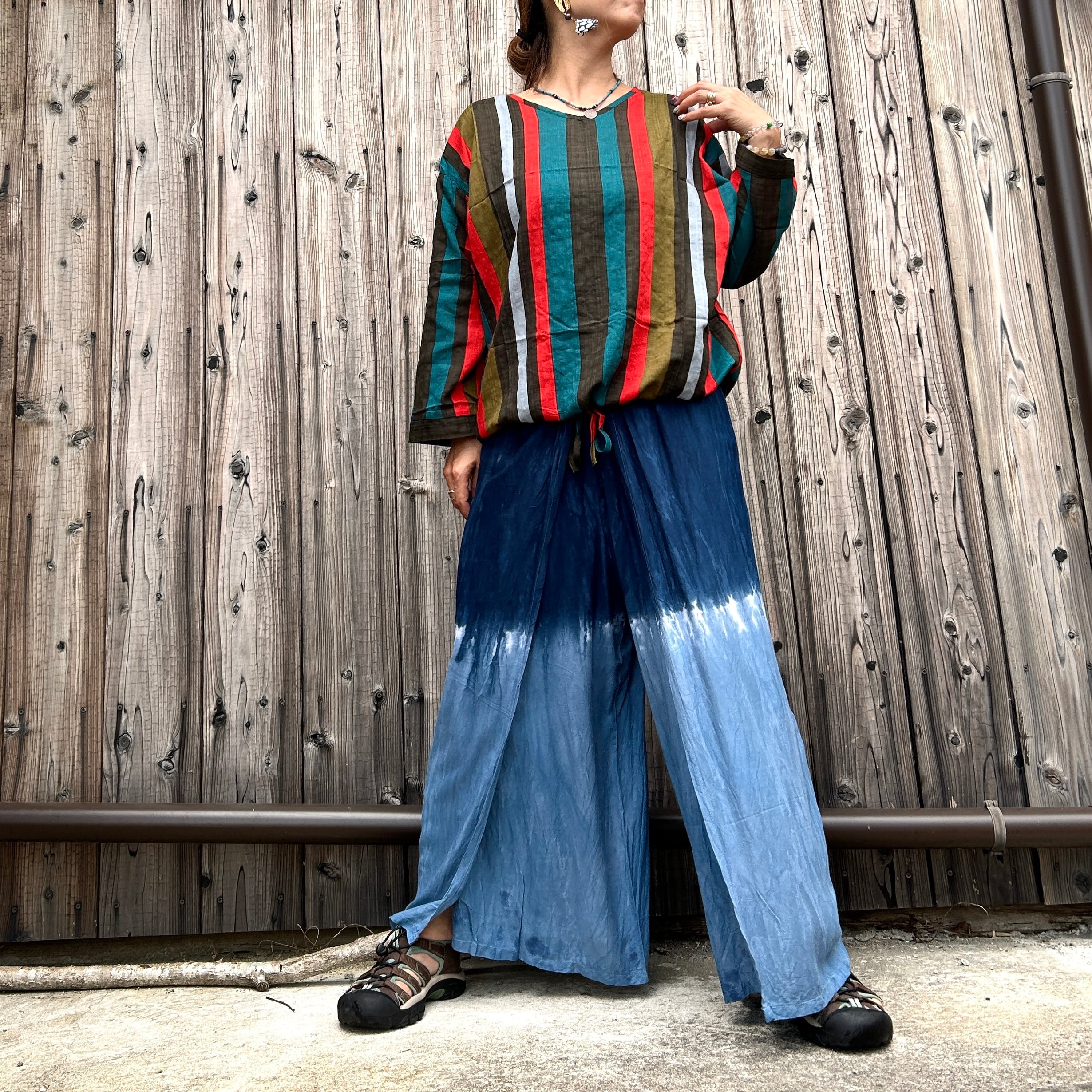左右それぞれのパンツが巻きスタイルになった個性あふれるデザイン。アジアンコーディネートの主役として楽しめそうです。