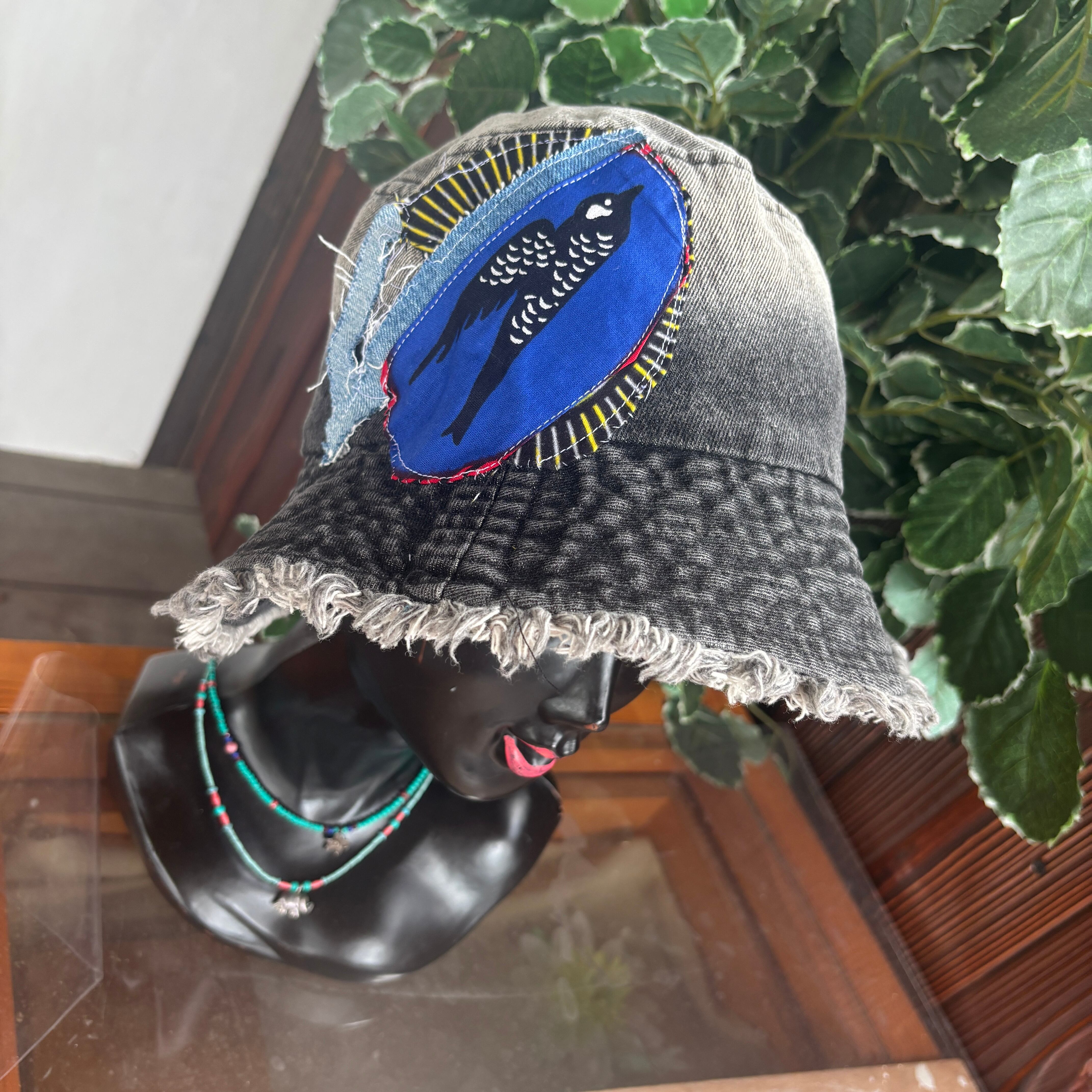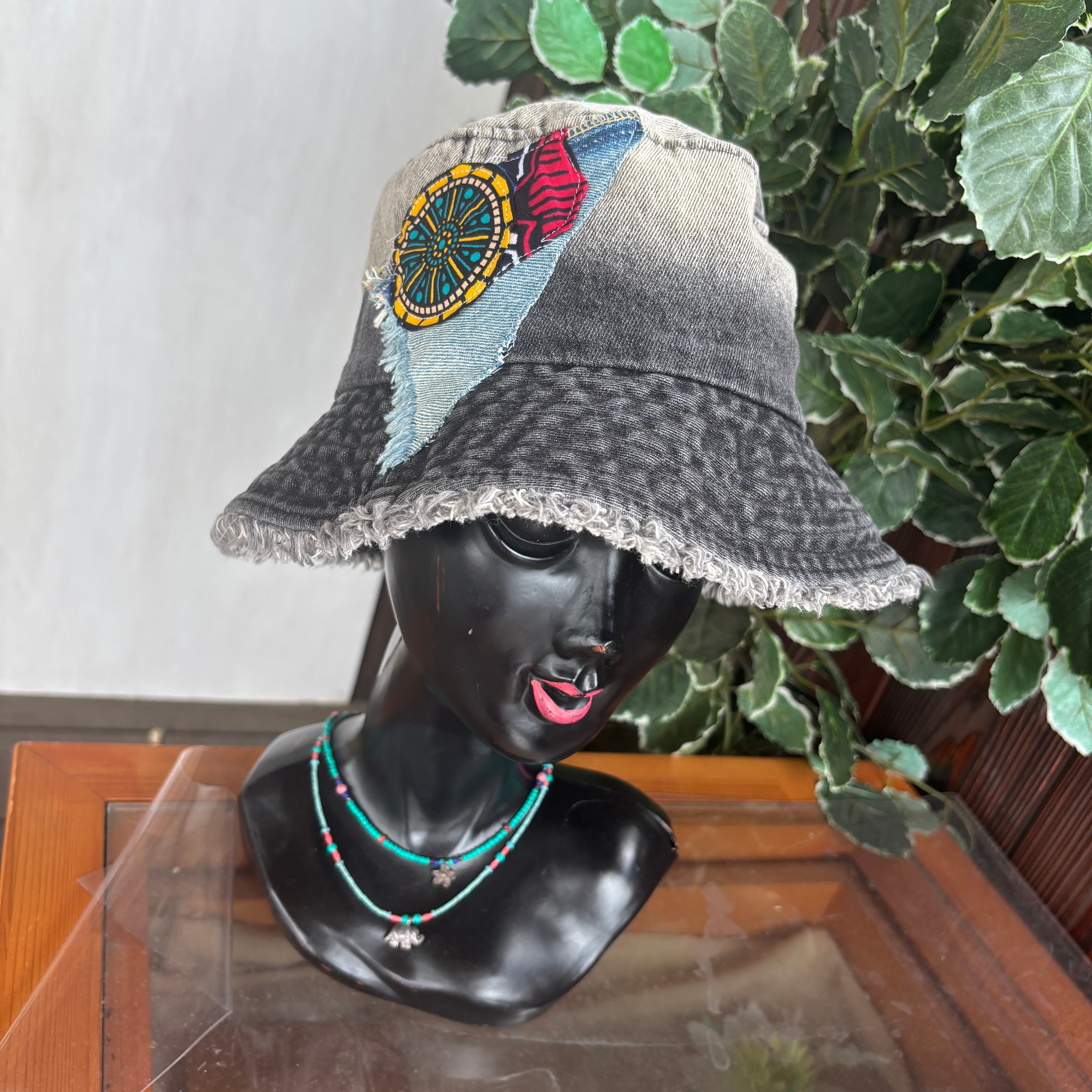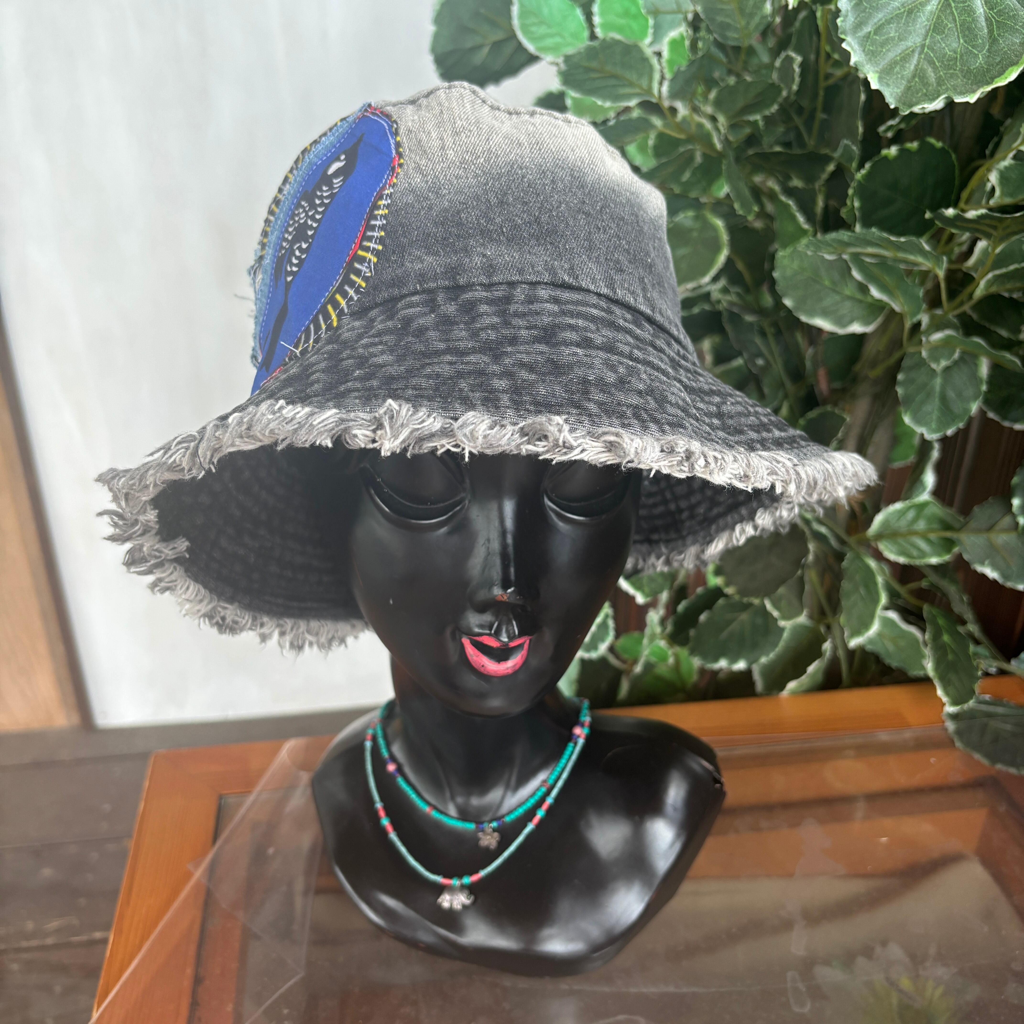 シンプルなデニムベースに1点もののアフリカン柄が目を引くおしゃれアイテムです。