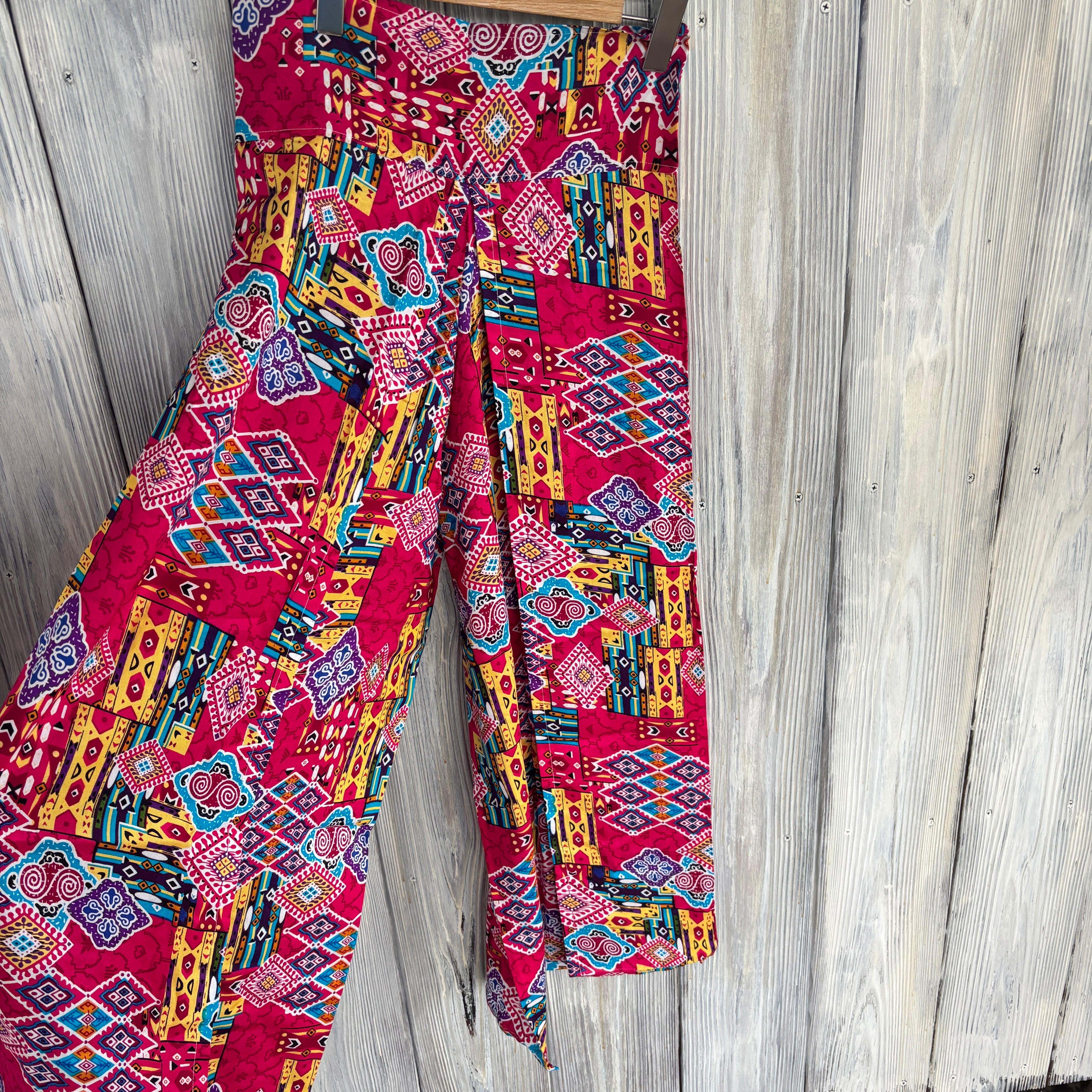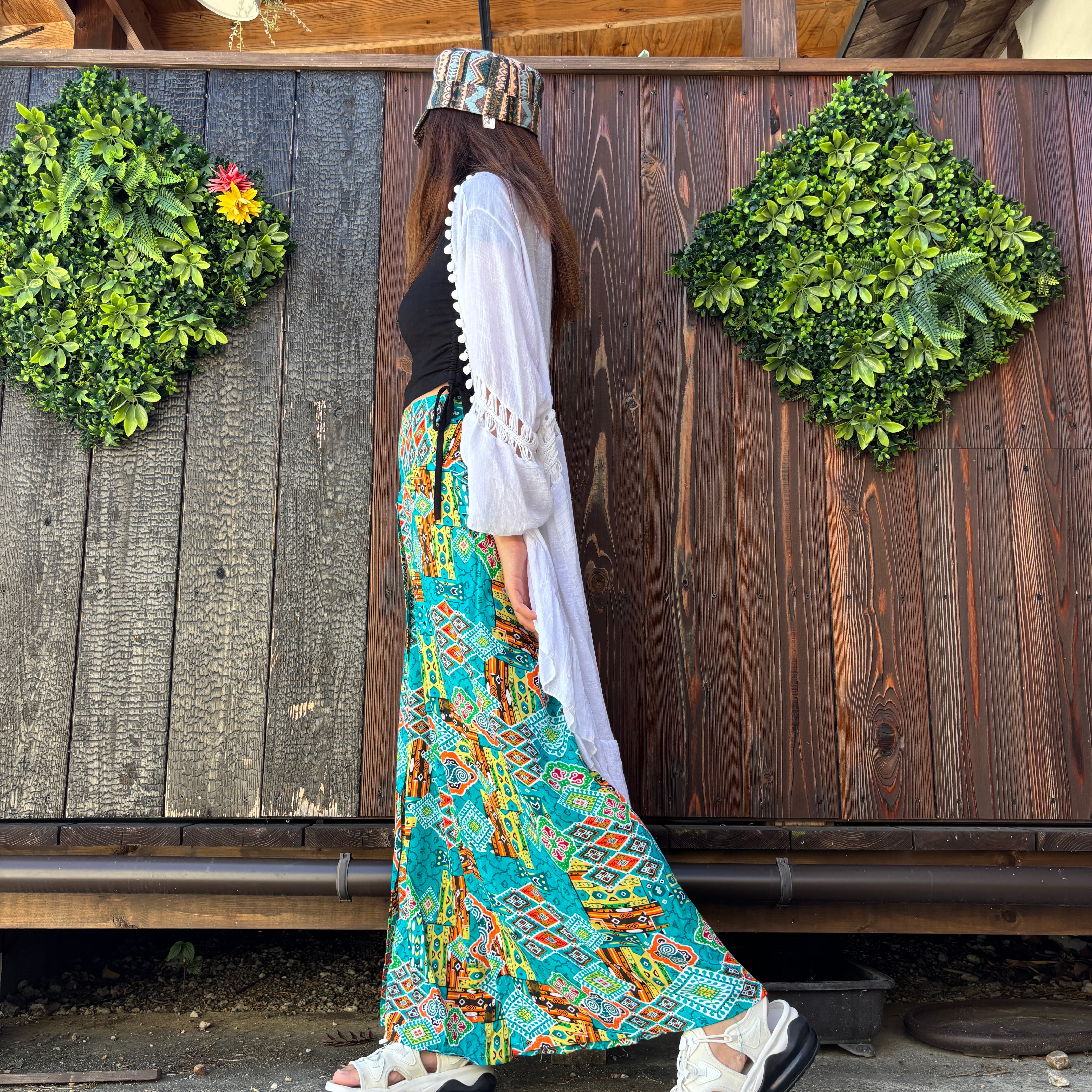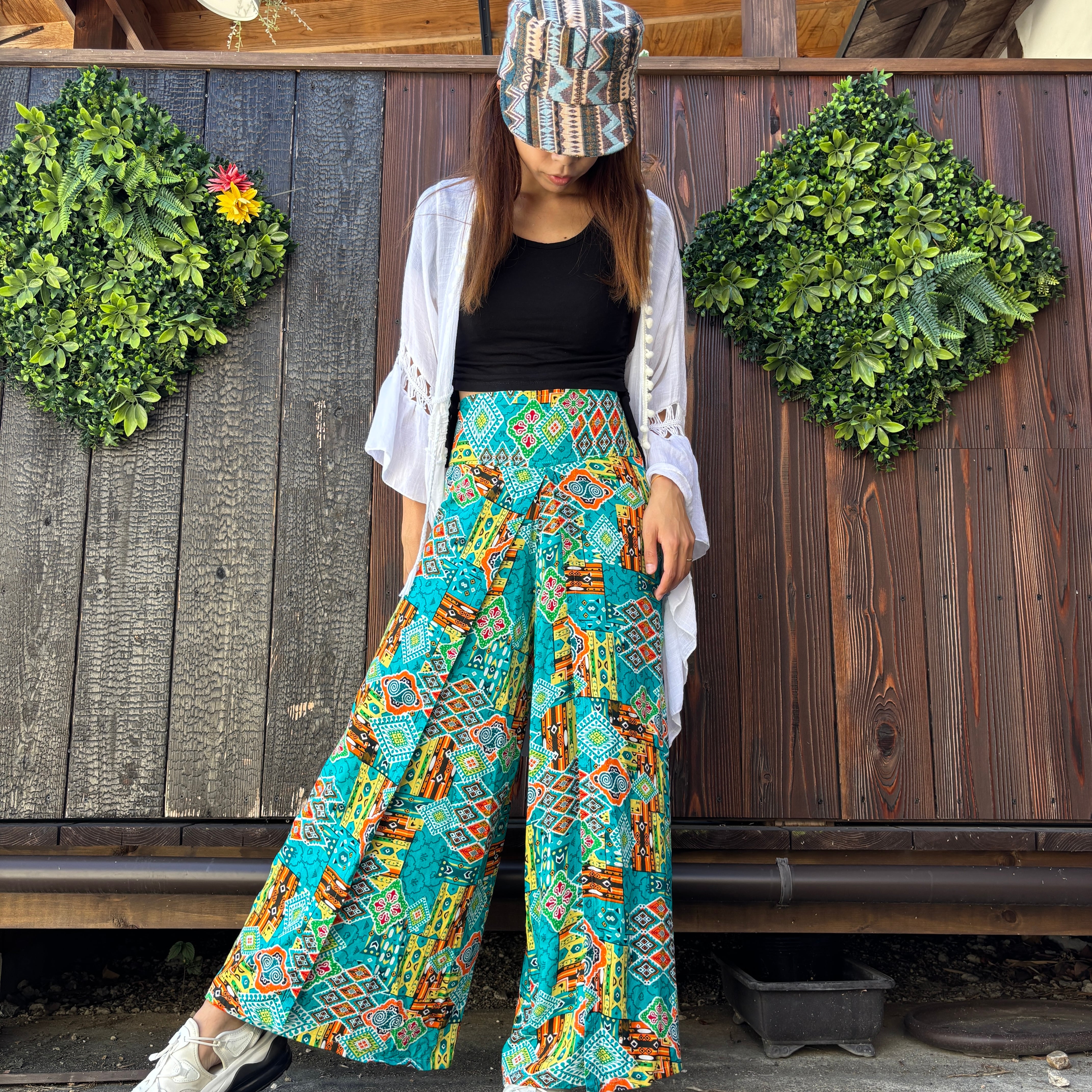 レーヨン生地で作られた柔らかく滑らかな肌触り。ウエストは背中側がゴムシャーリングになっていてゆったりしたはき心地です。左右それぞれのパンツが巻きスタイルになった個性あふれるデザイン。