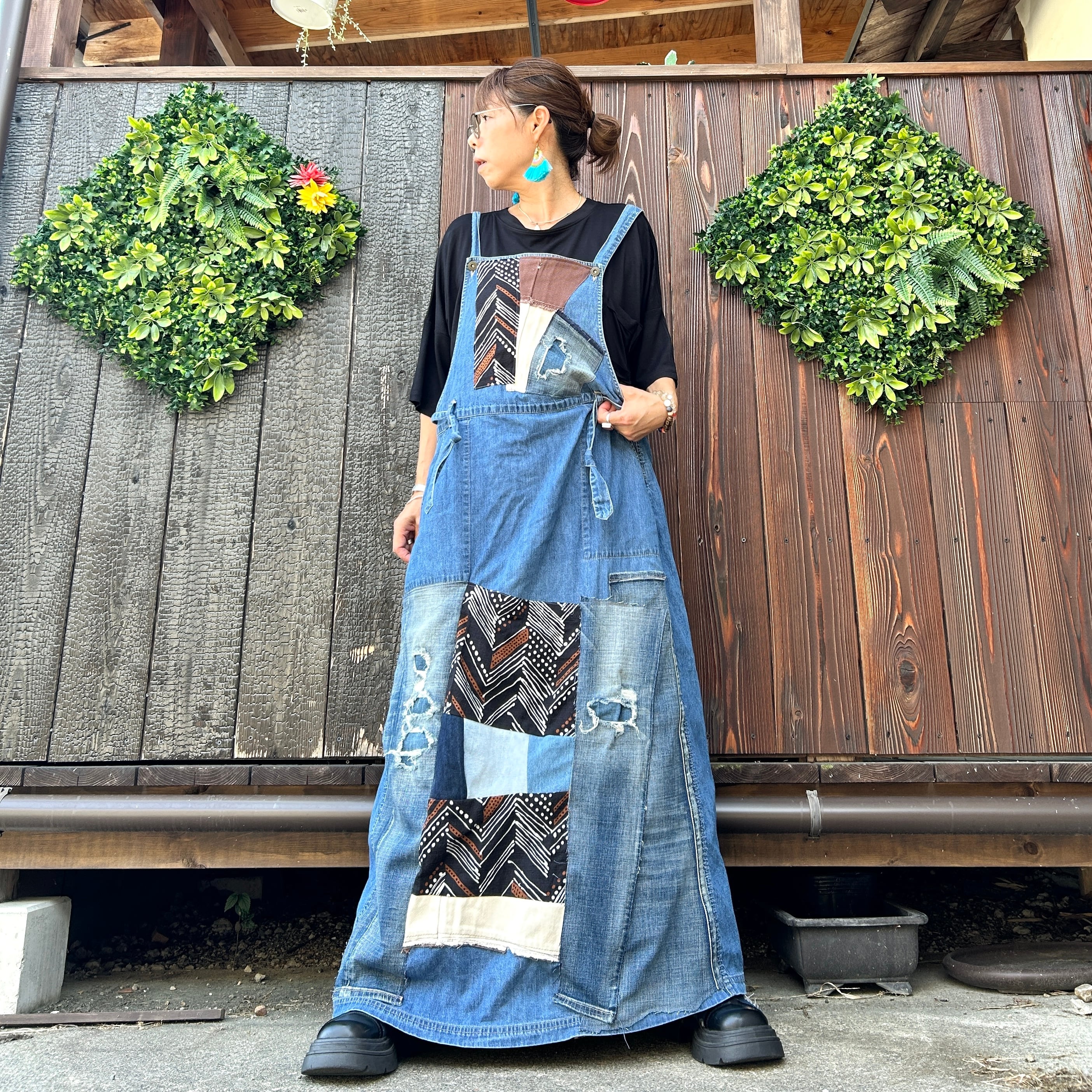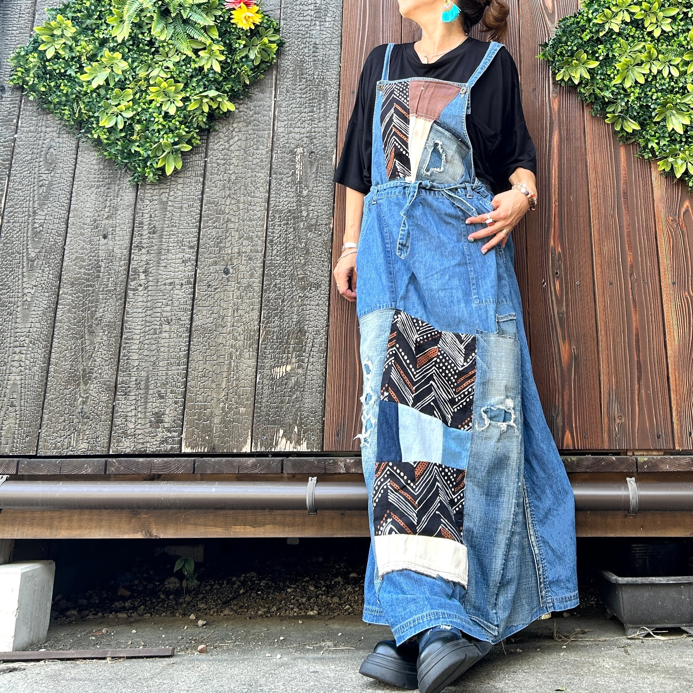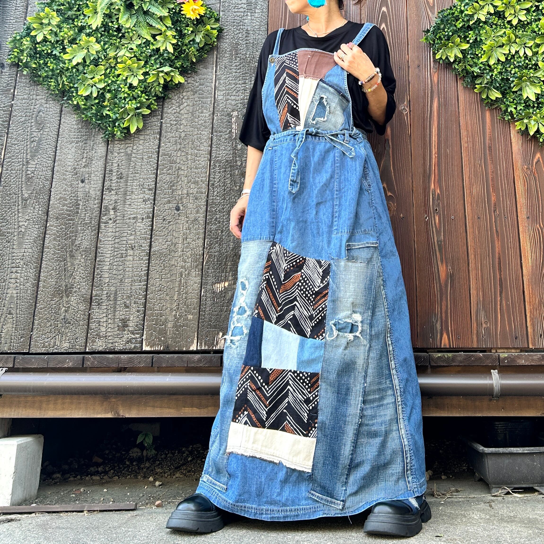 このアフリカンデニムジャンバースカートは、ユニークなパッチワークデザインが魅力的な一品です。