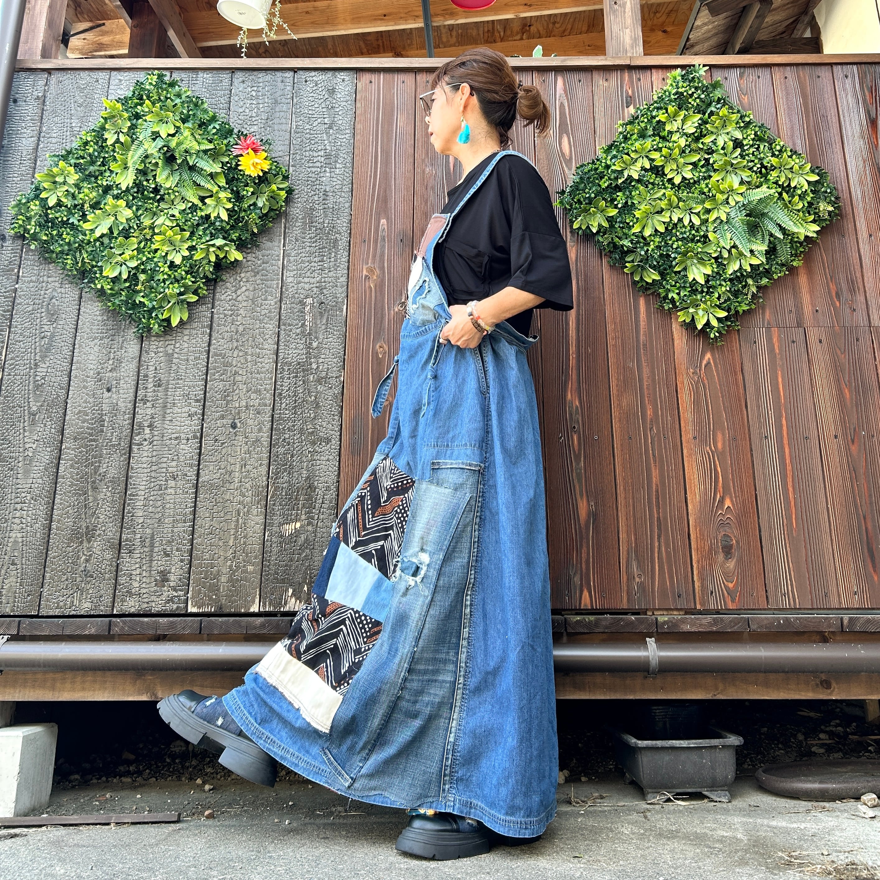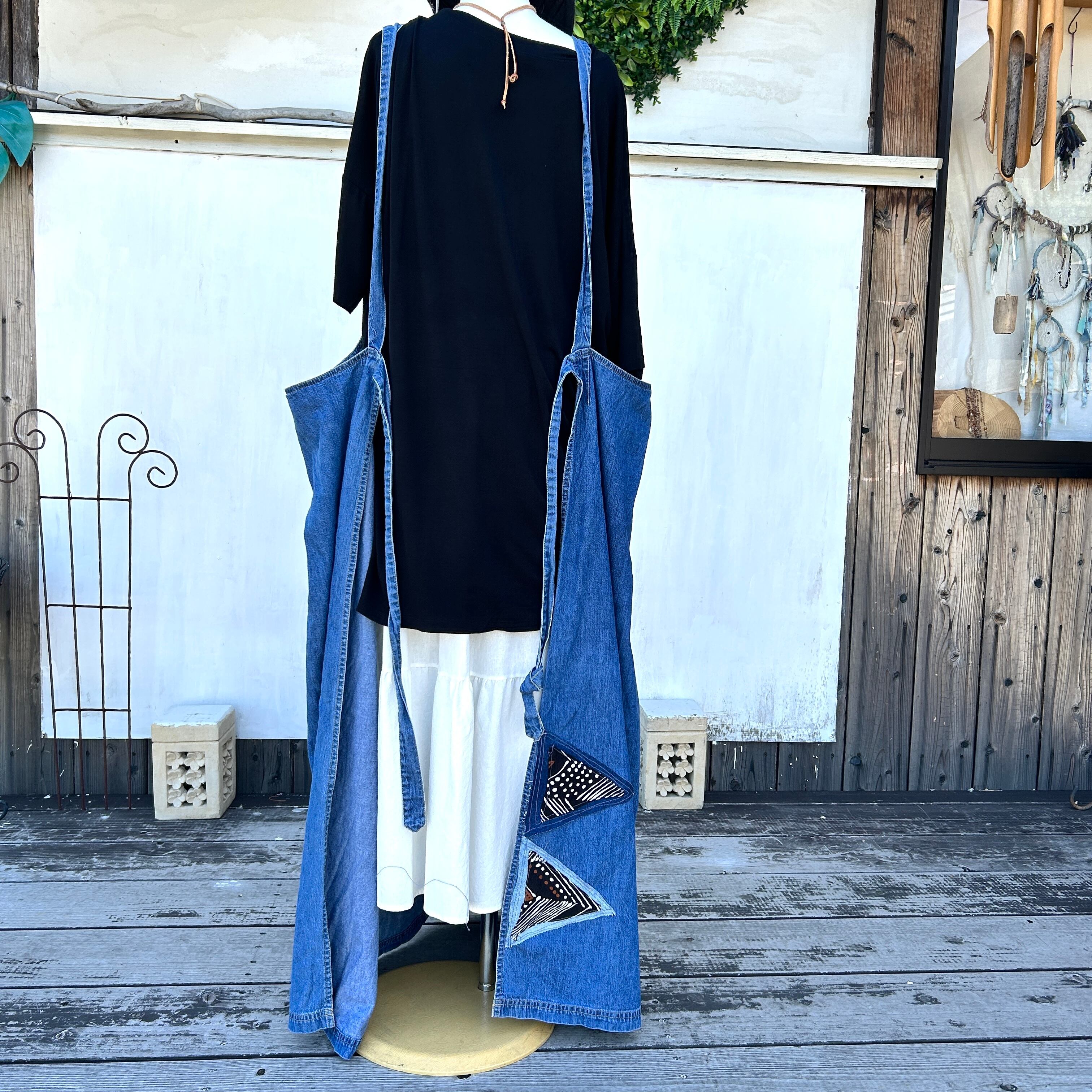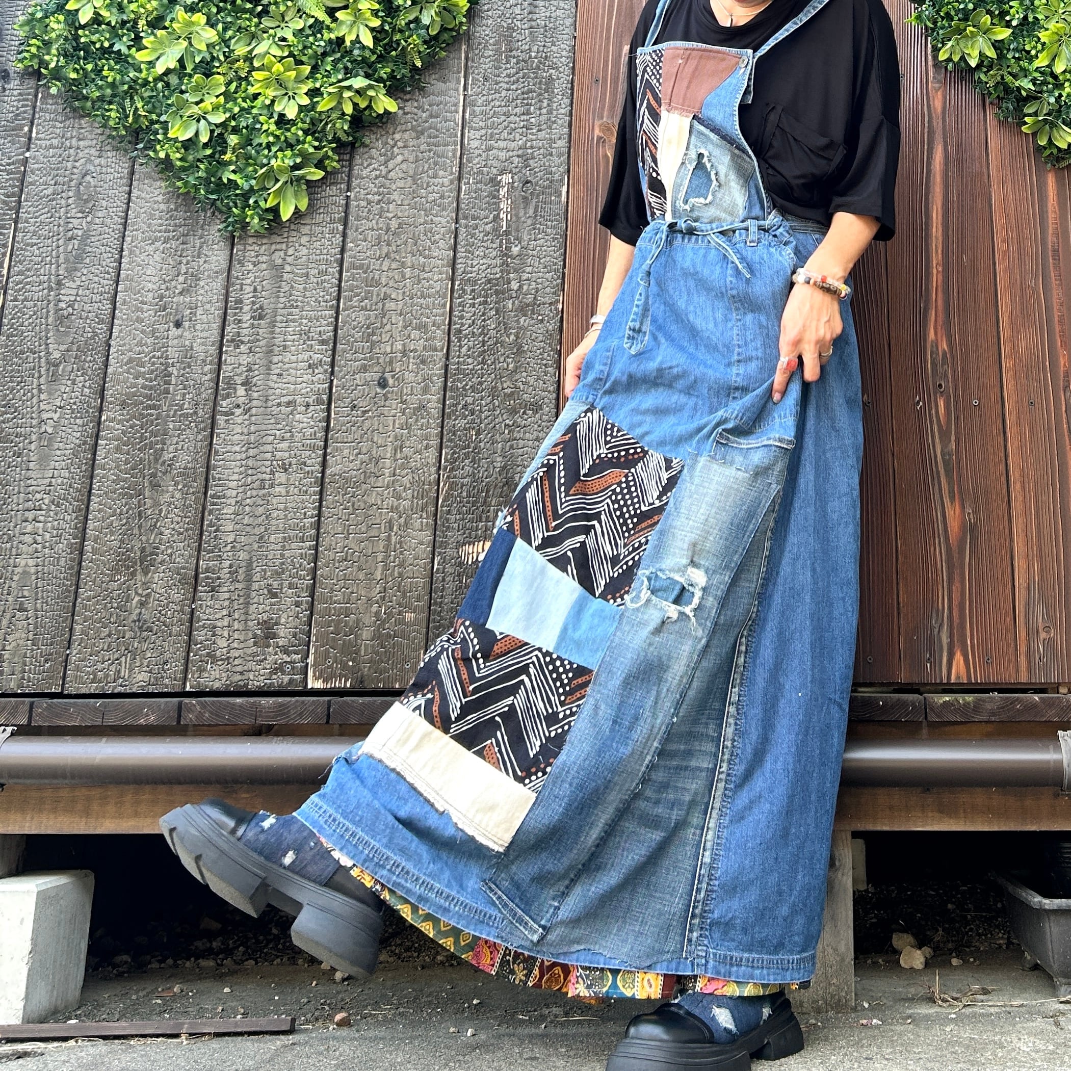 このアフリカンデニムジャンバースカートは、ユニークなパッチワークデザインが魅力的な一品です。