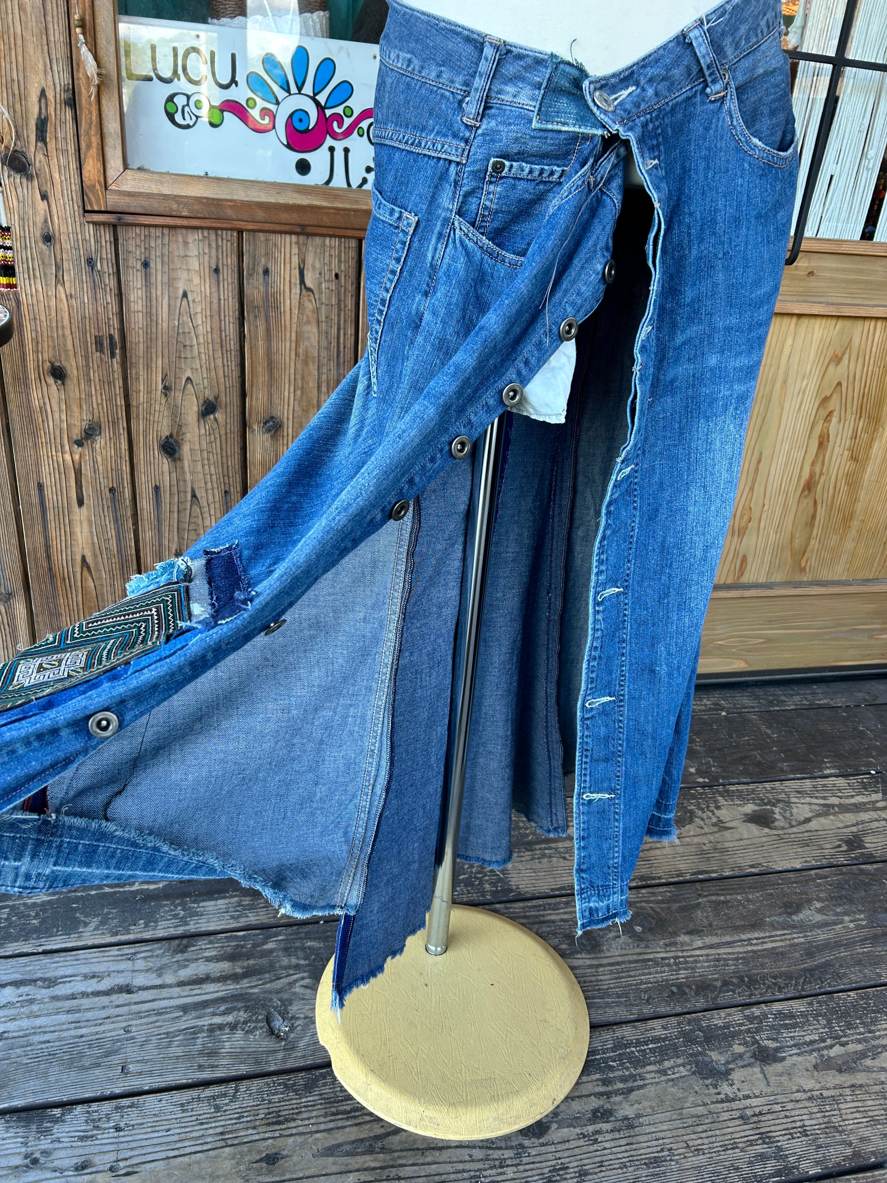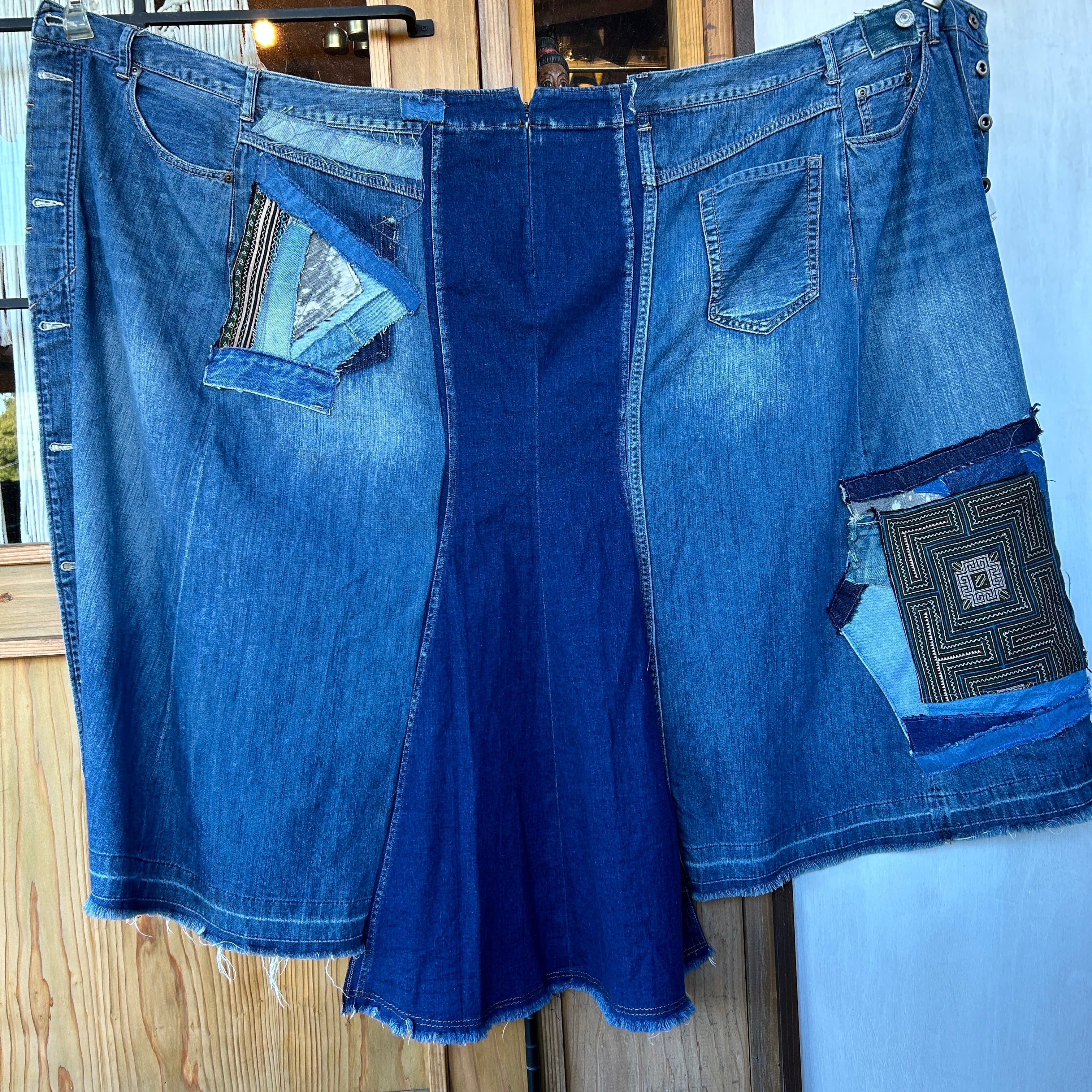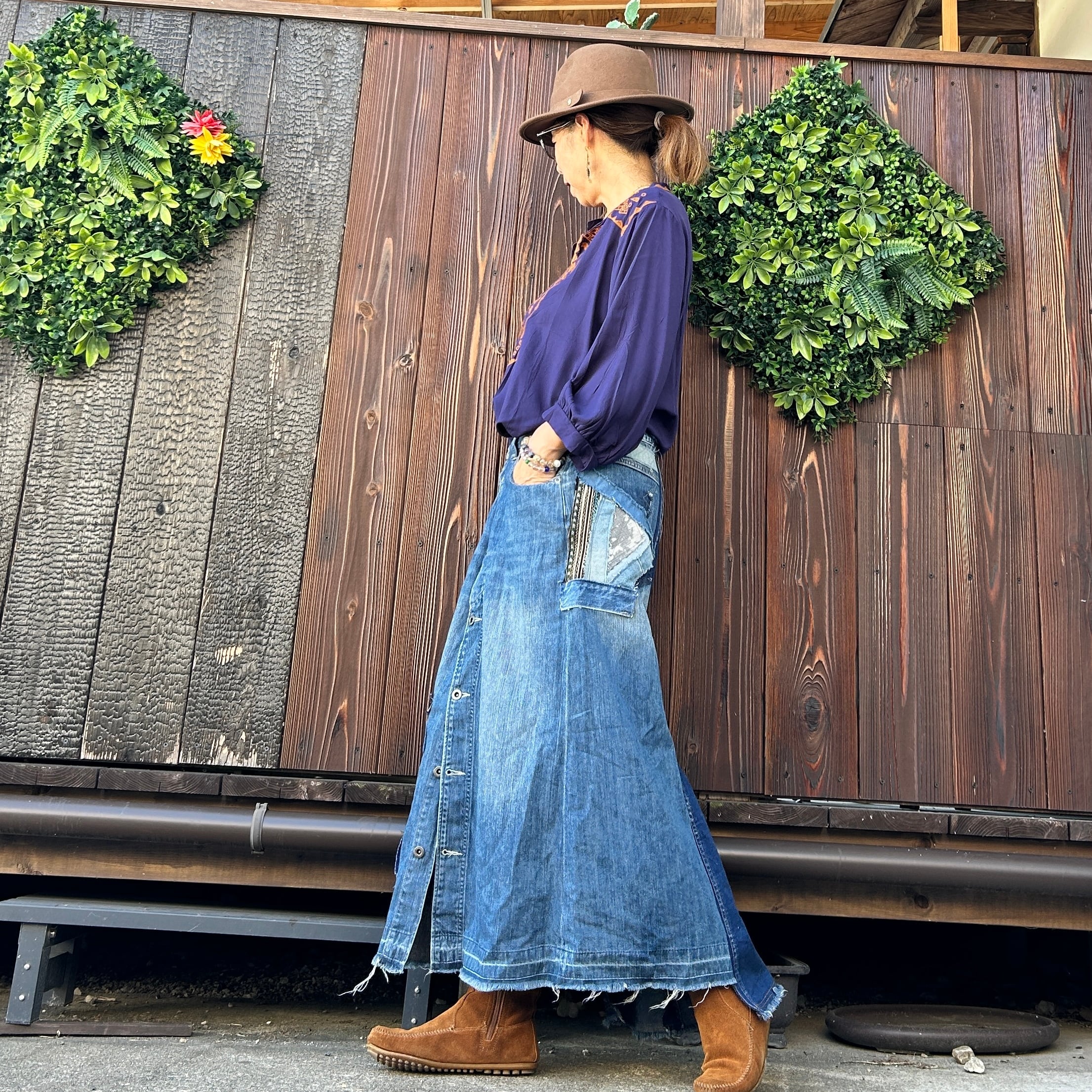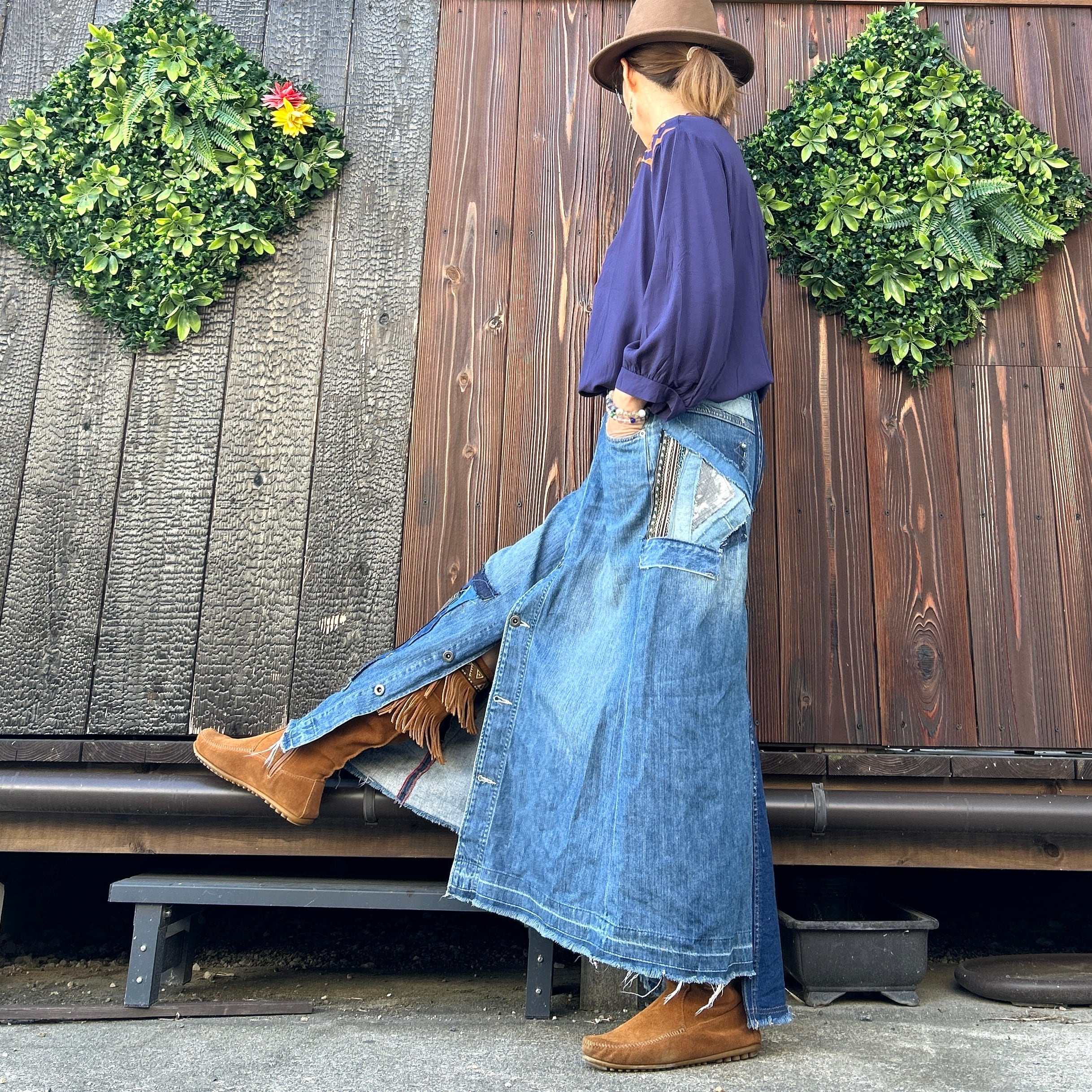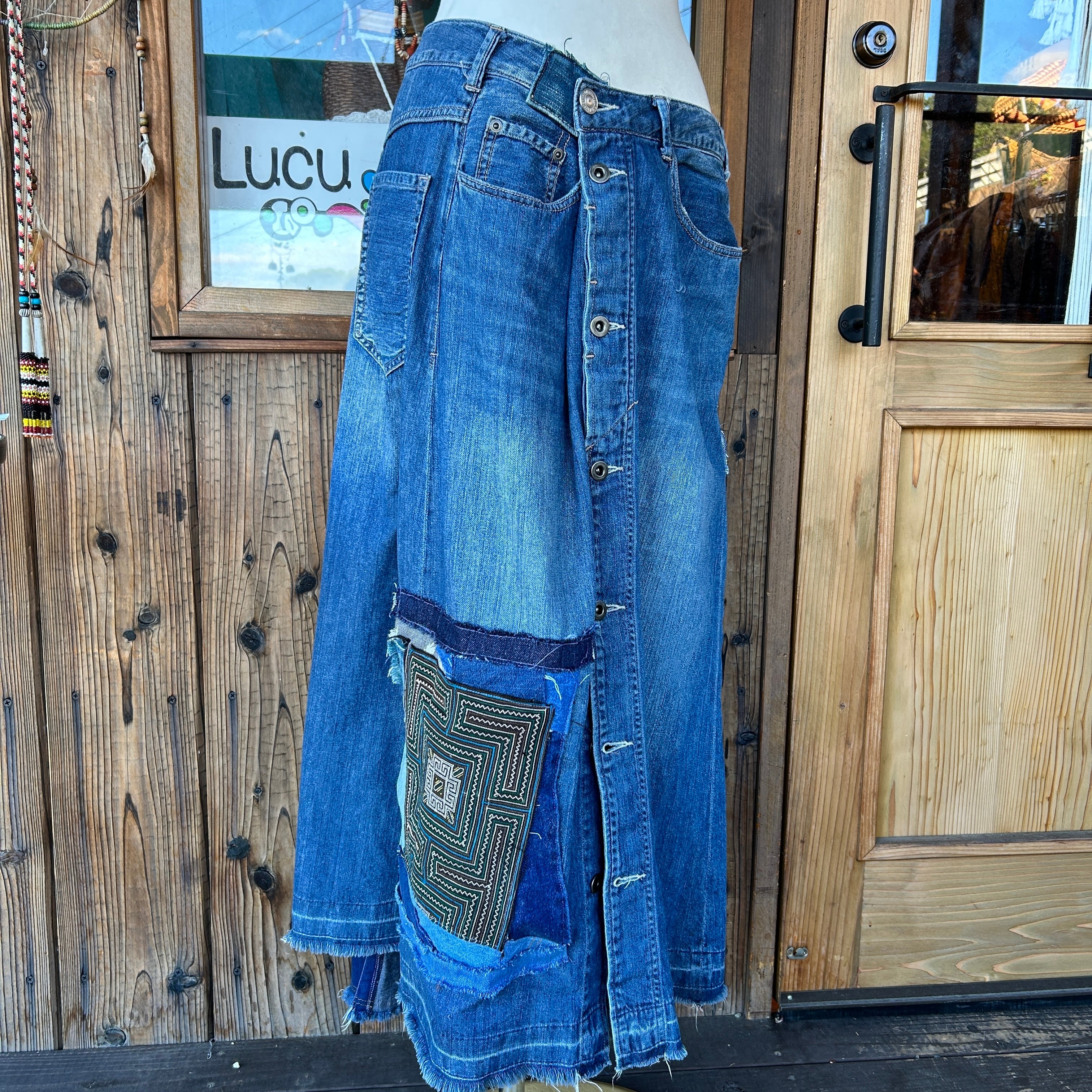 リメイクデニムを使用した、前ボタンスカートです。シンプルながらもお洒落で、コーディネートを引き立てるアイテムです。