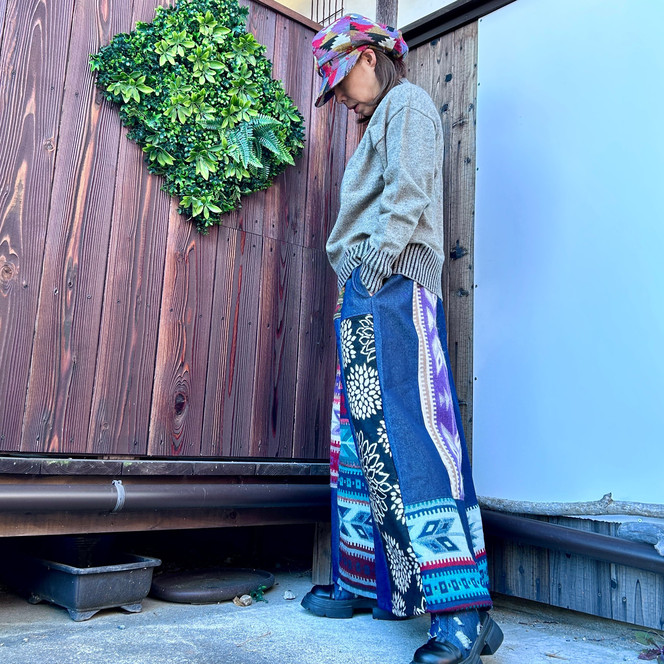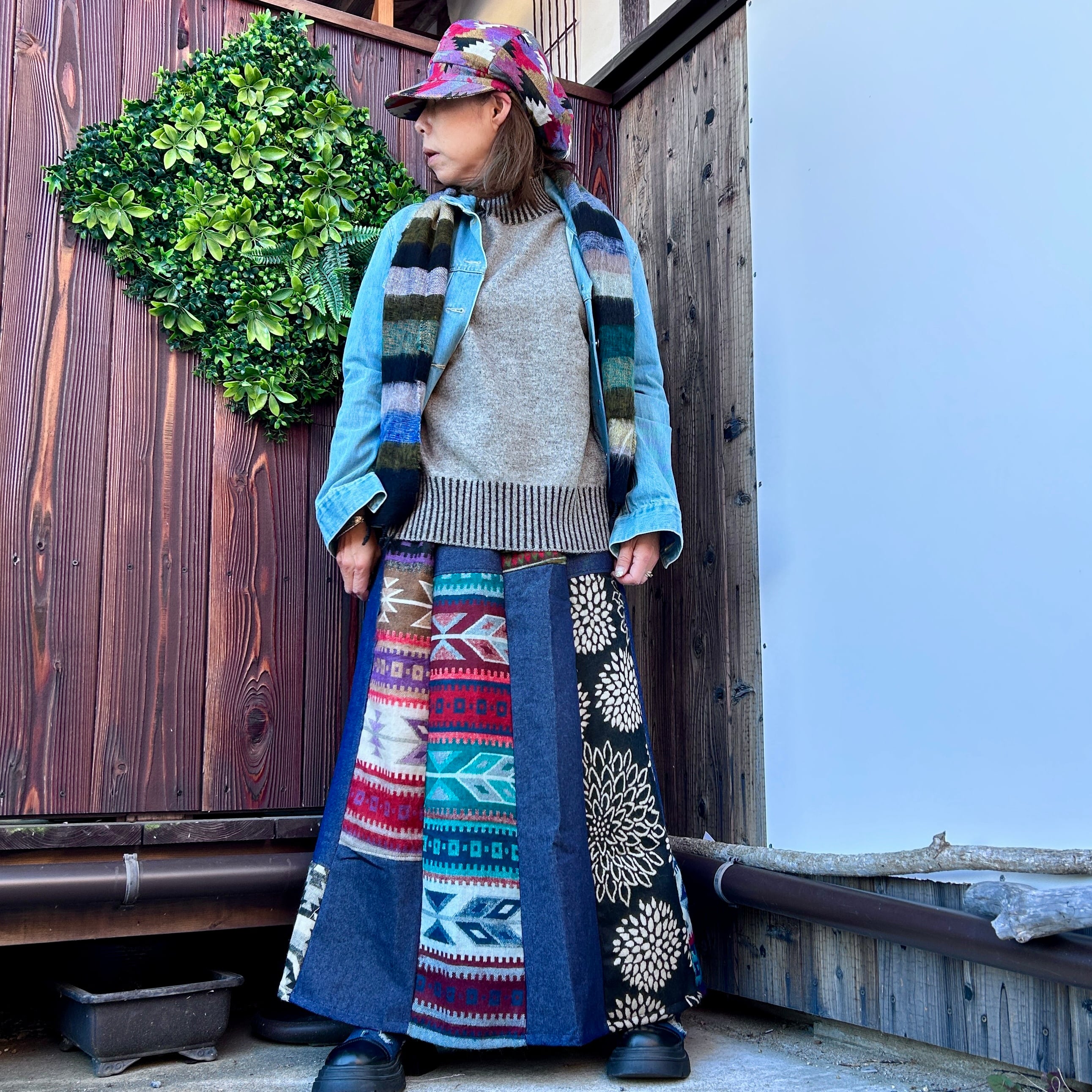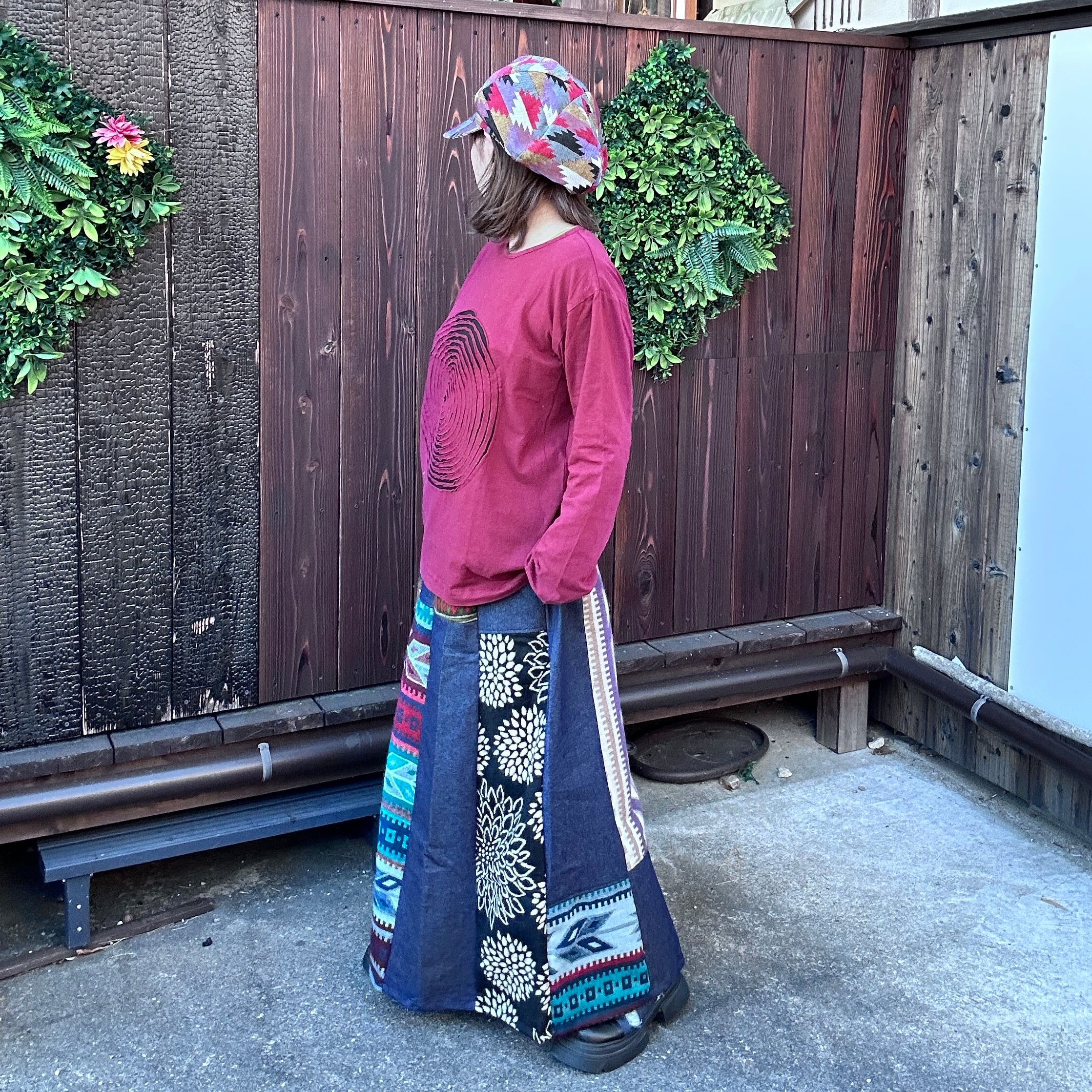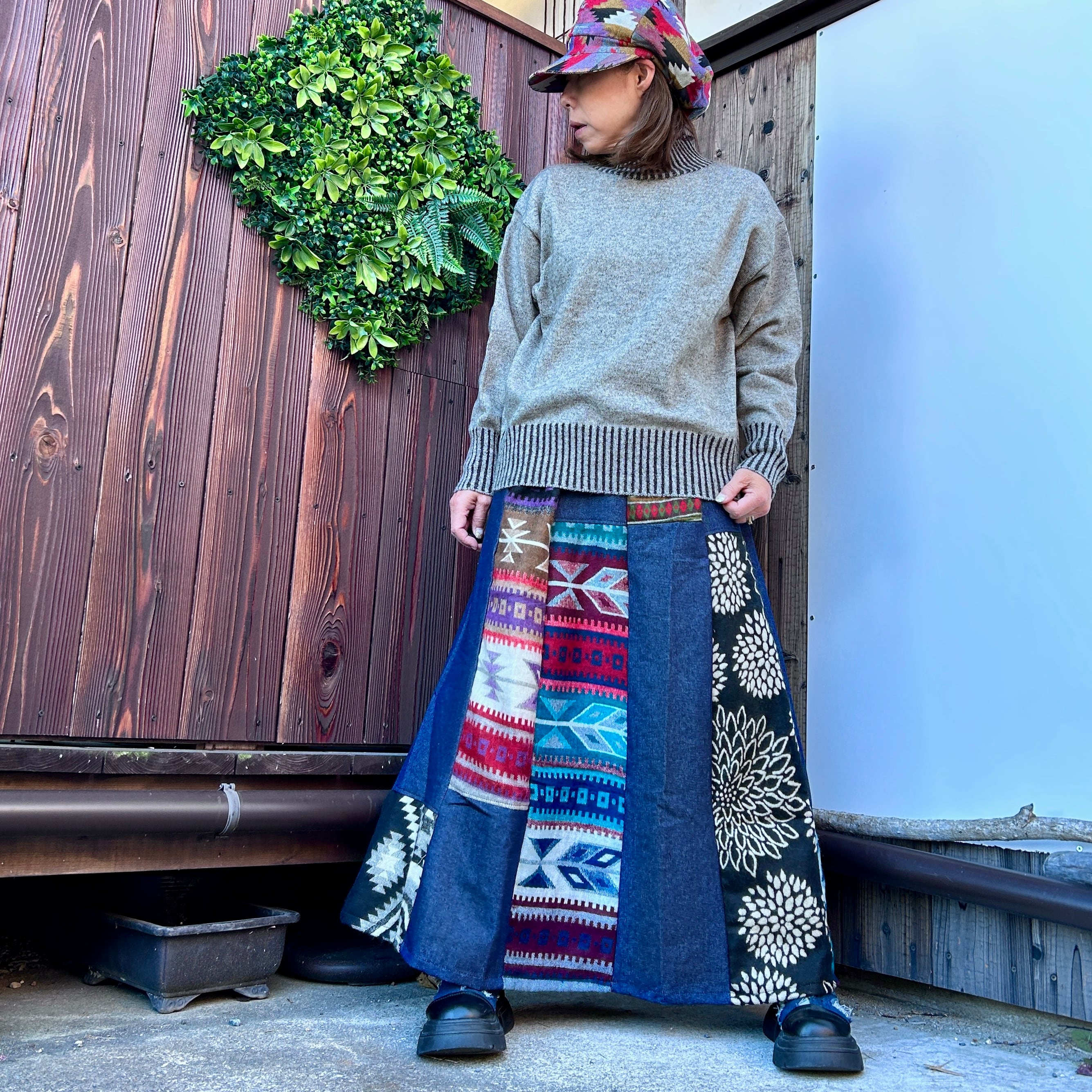 この秋冬シーズンにぴったりのロングスカートは、デニムとエスニック柄のパッチワークが特徴です