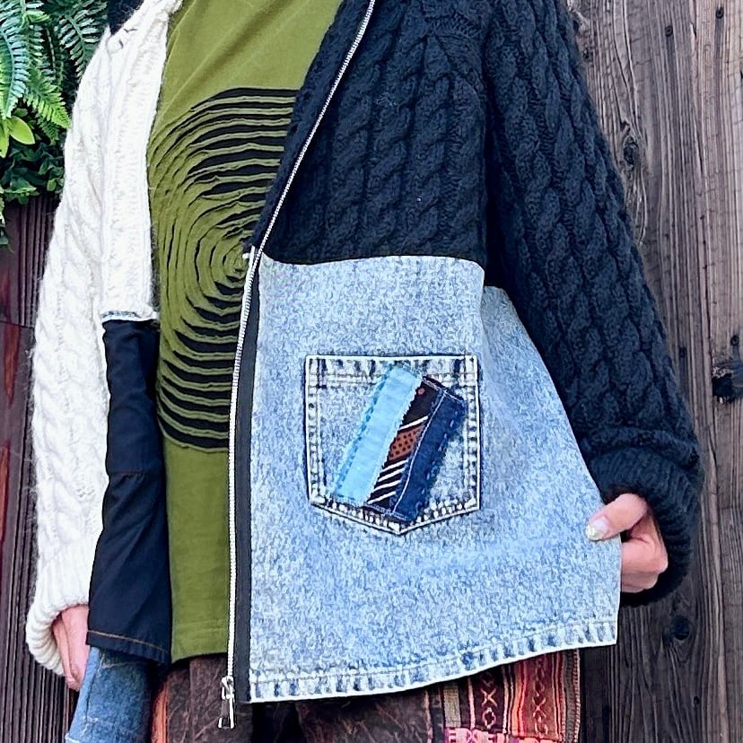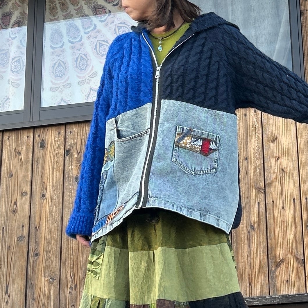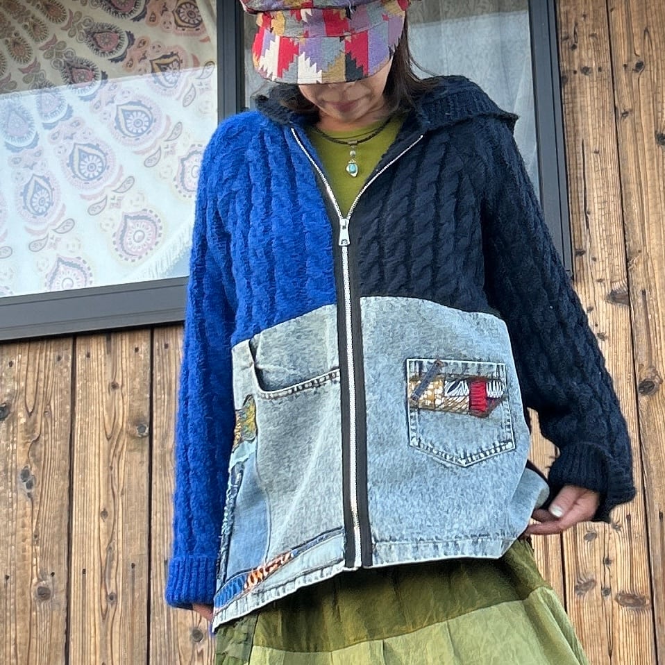 手作りのため、ニットやデニムの風合いや仕上がりには若干の個体差がございます。これも異素材ニットアフリカンの魅力としてお楽しみいただければ幸いです。