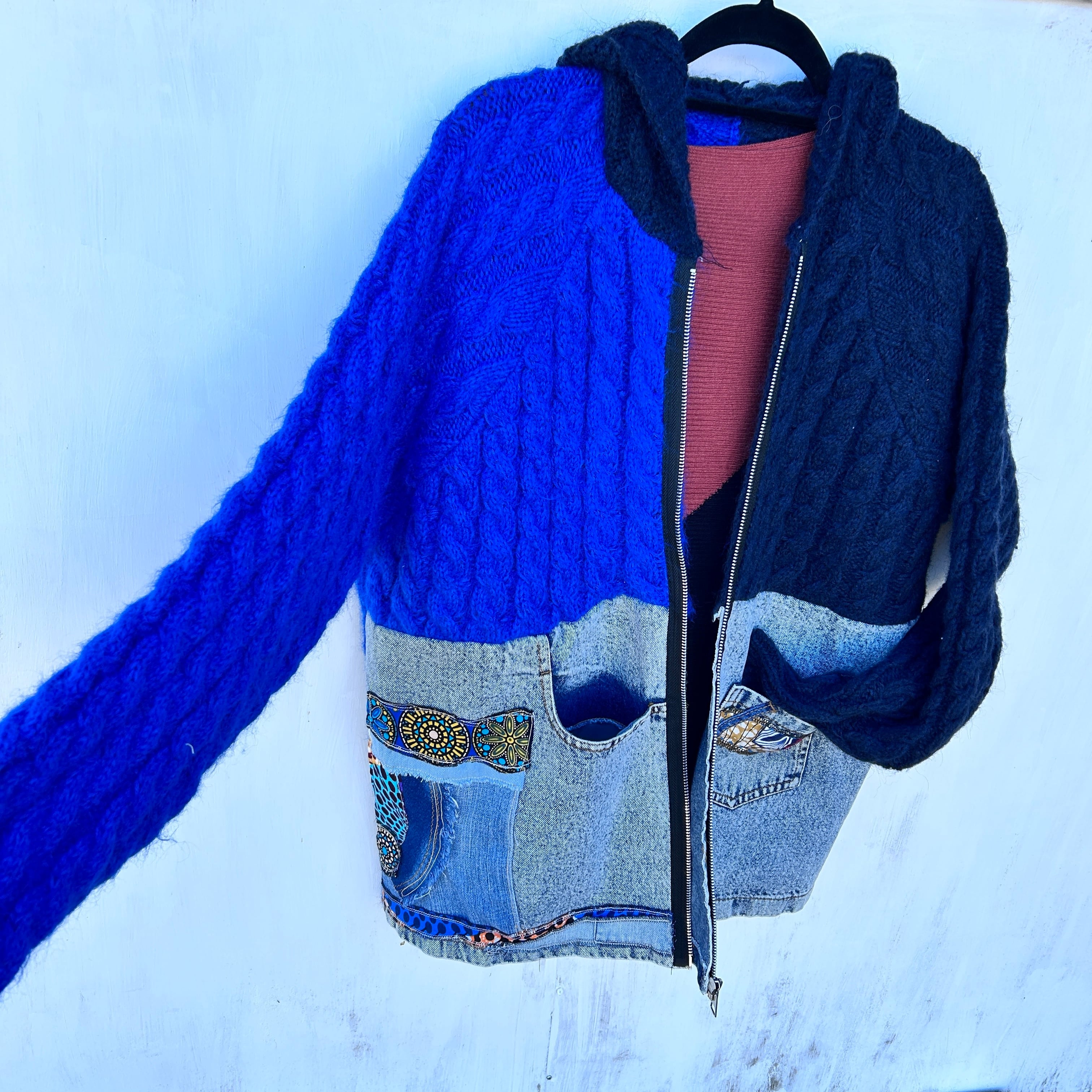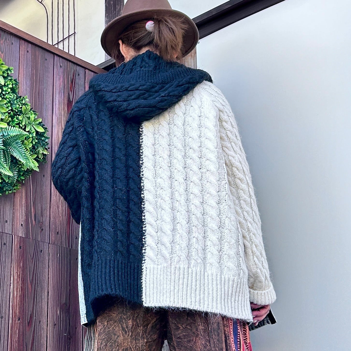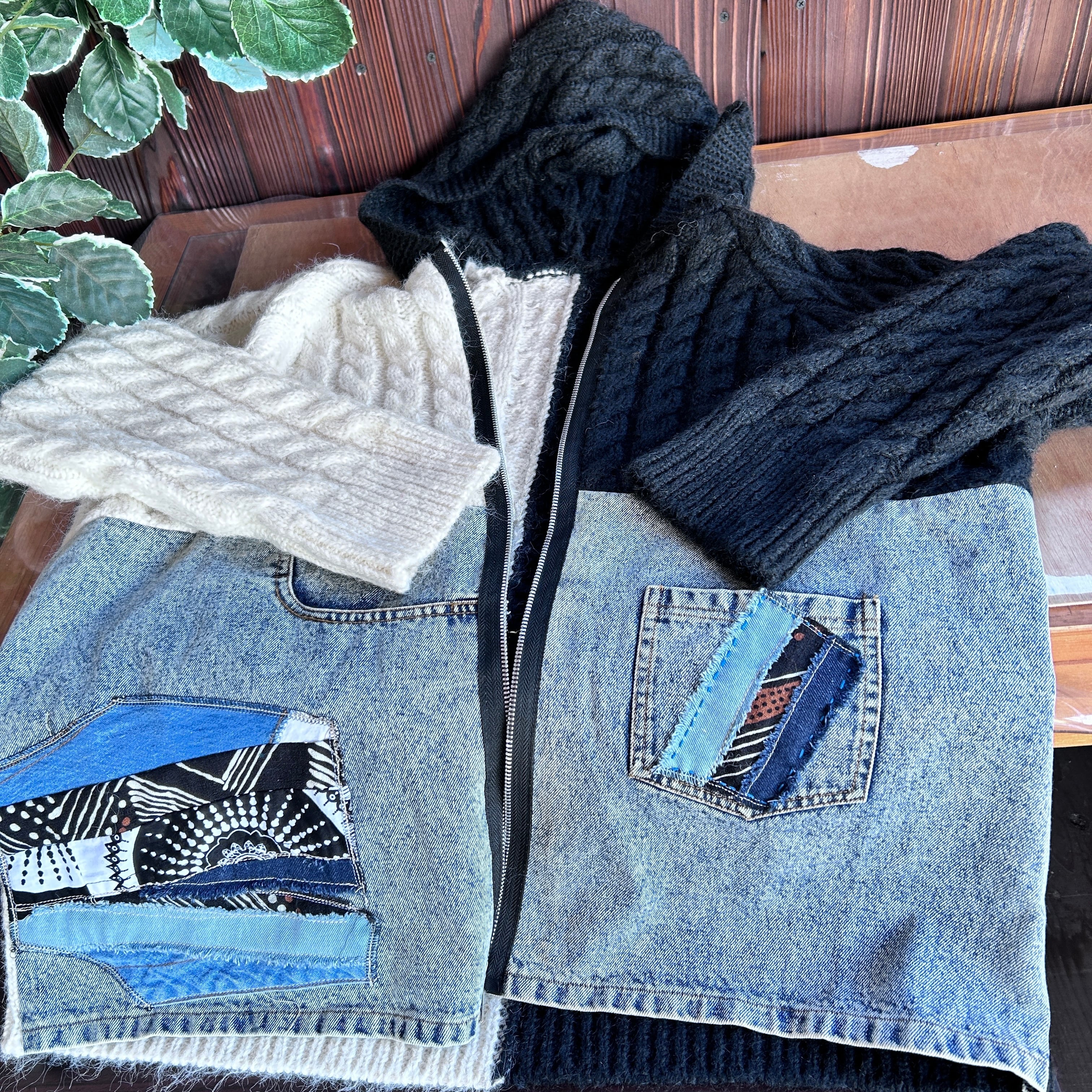 手作りのため、ニットやデニムの風合いや仕上がりには若干の個体差がございます。これも異素材ニットアフリカンの魅力としてお楽しみいただければ幸いです。