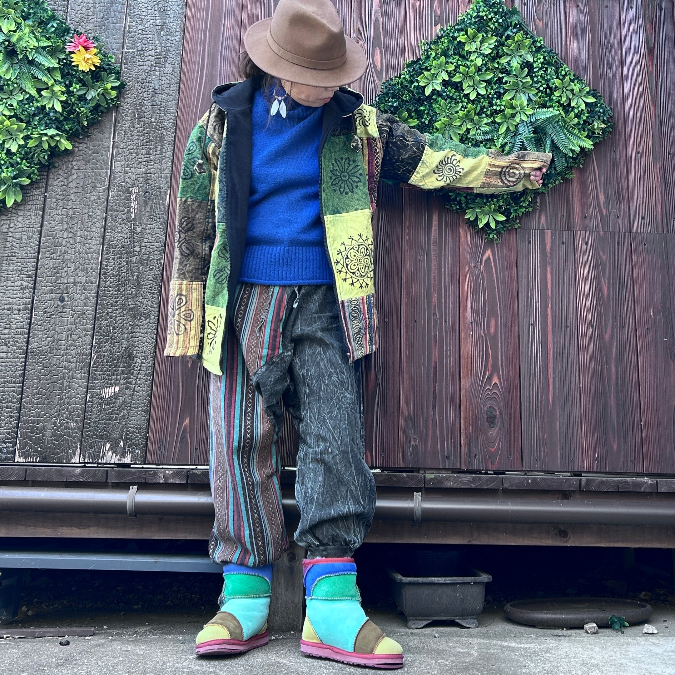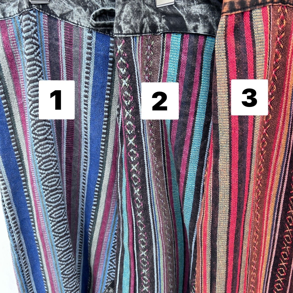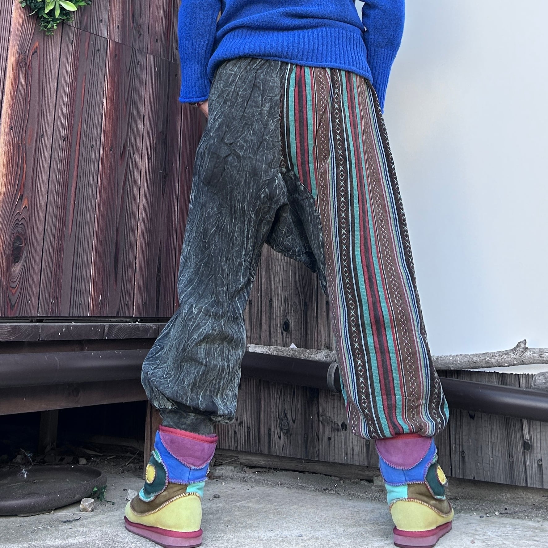 手作りのため、切り替え部分のデザインや仕上がりには若干の個体差があります。この独自の風合いも、ネパール切り替えサルエルの魅力としてお楽しみいただければ幸いです。