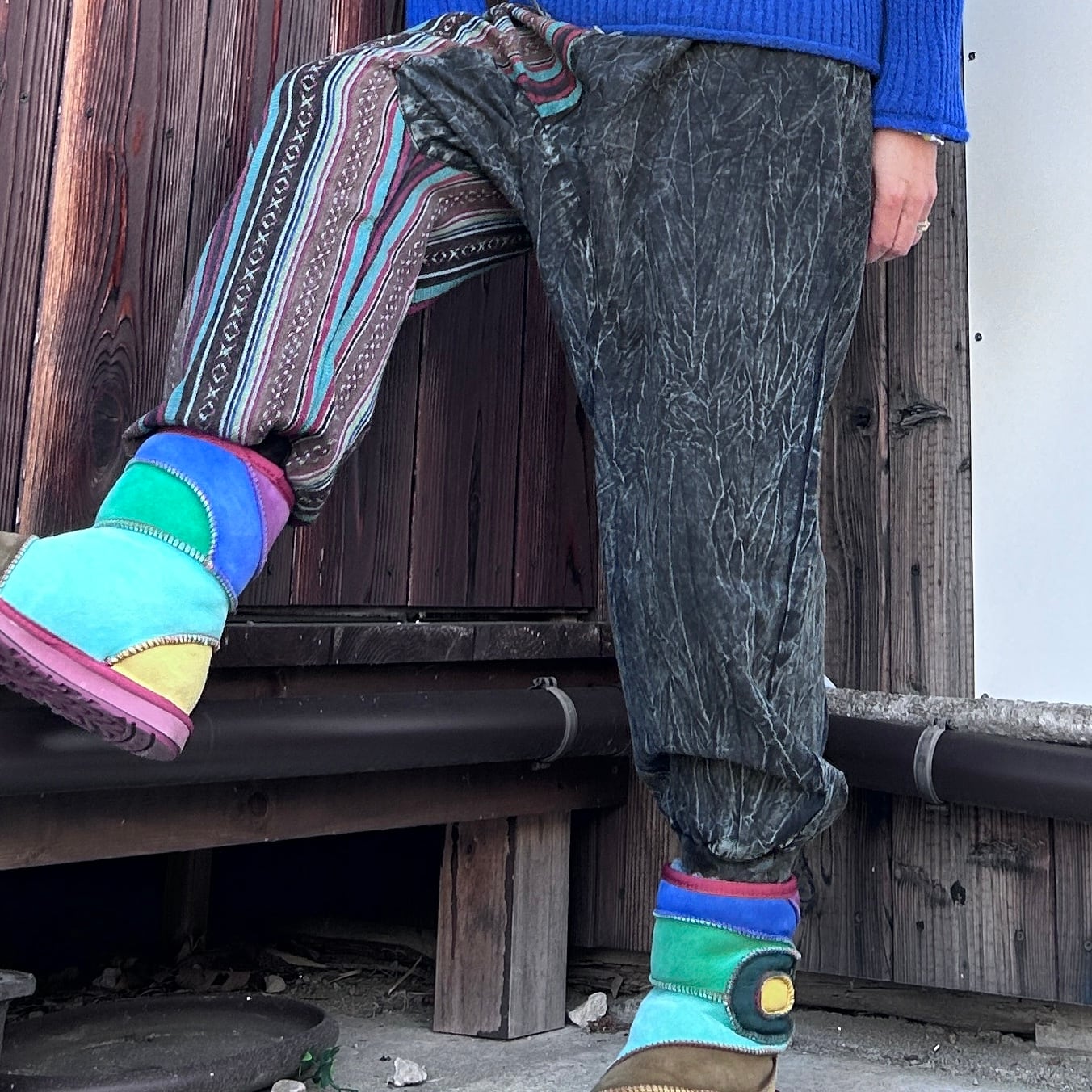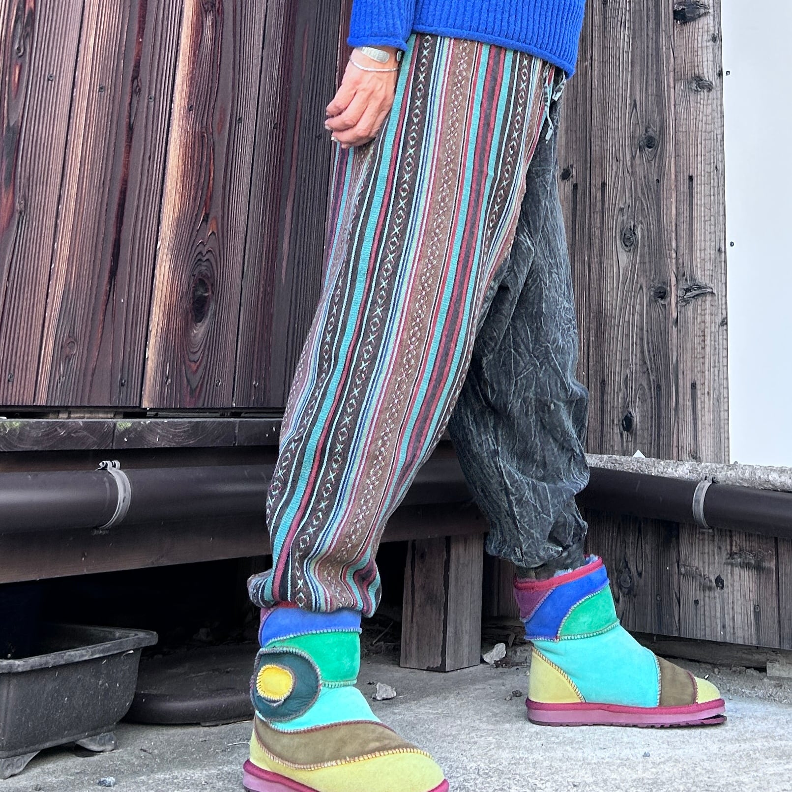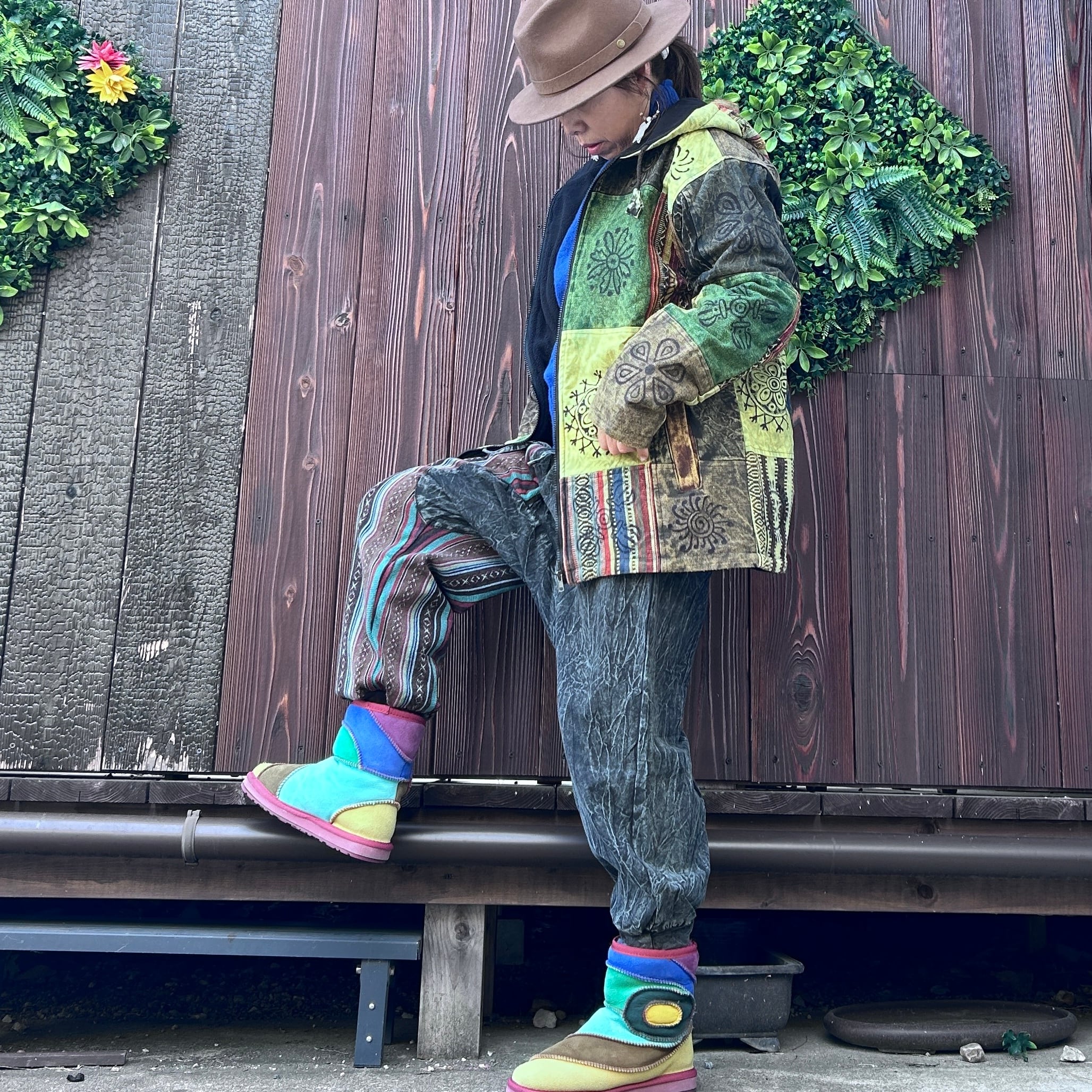 手作りのため、切り替え部分のデザインや仕上がりには若干の個体差があります。この独自の風合いも、ネパール切り替えサルエルの魅力としてお楽しみいただければ幸いです。