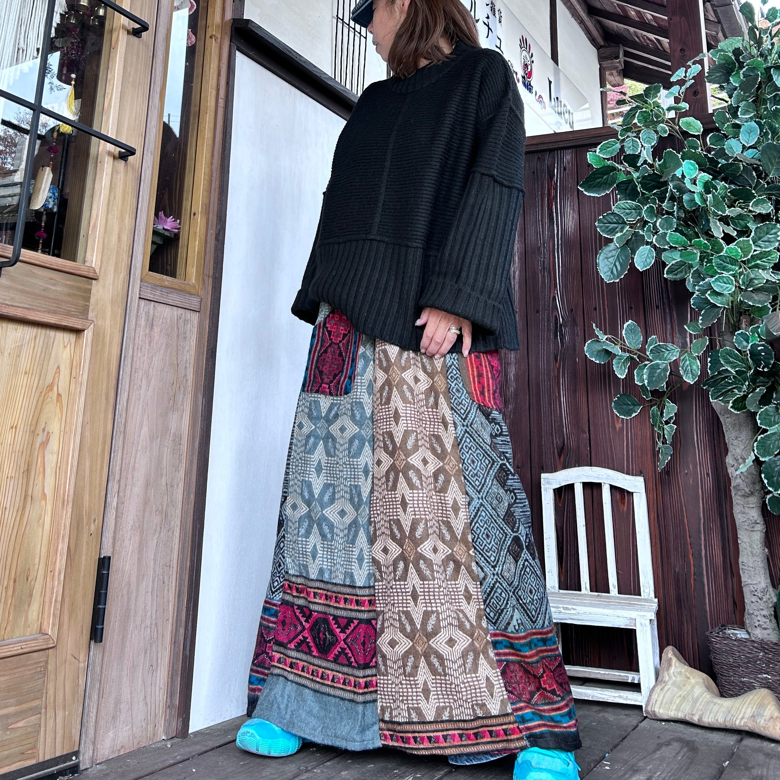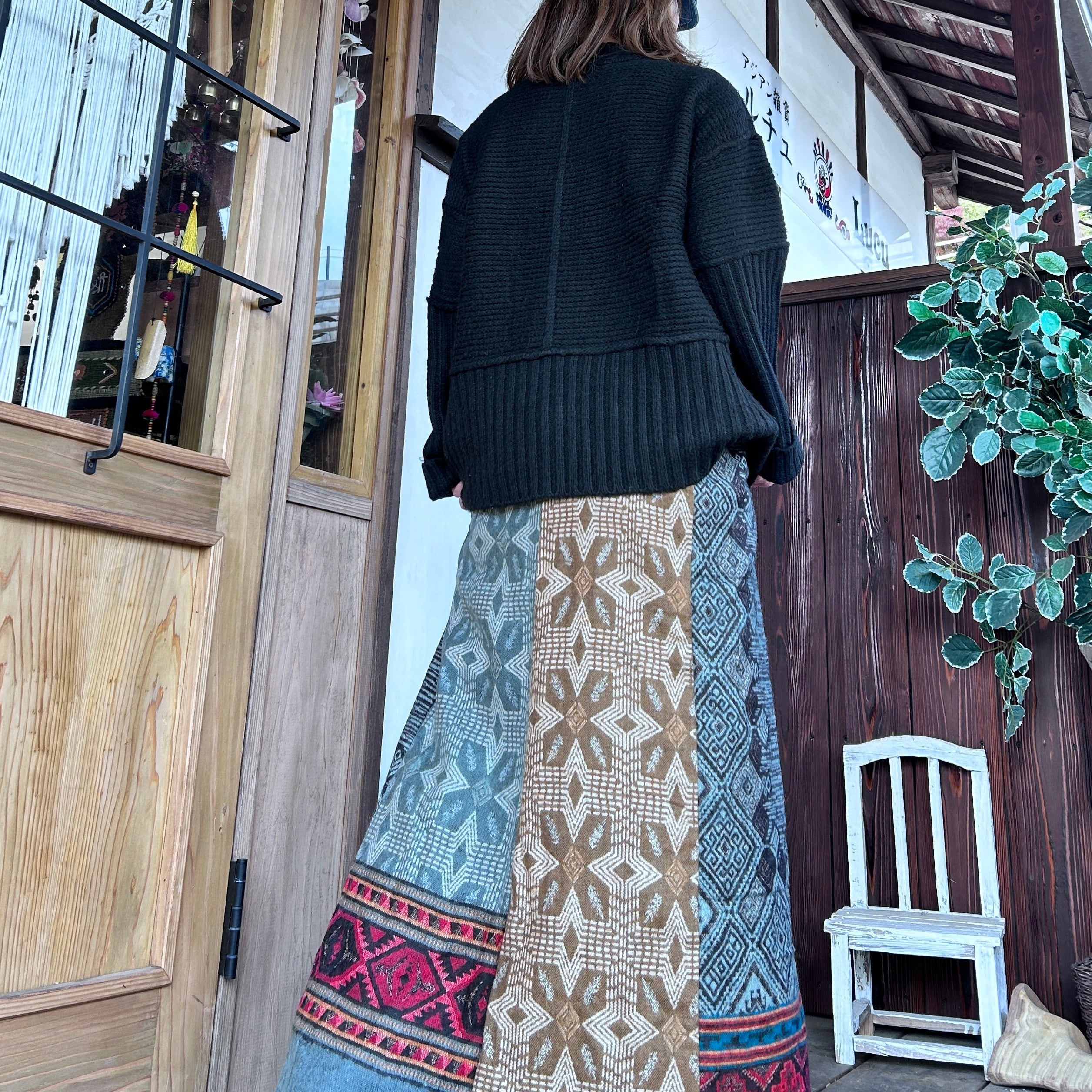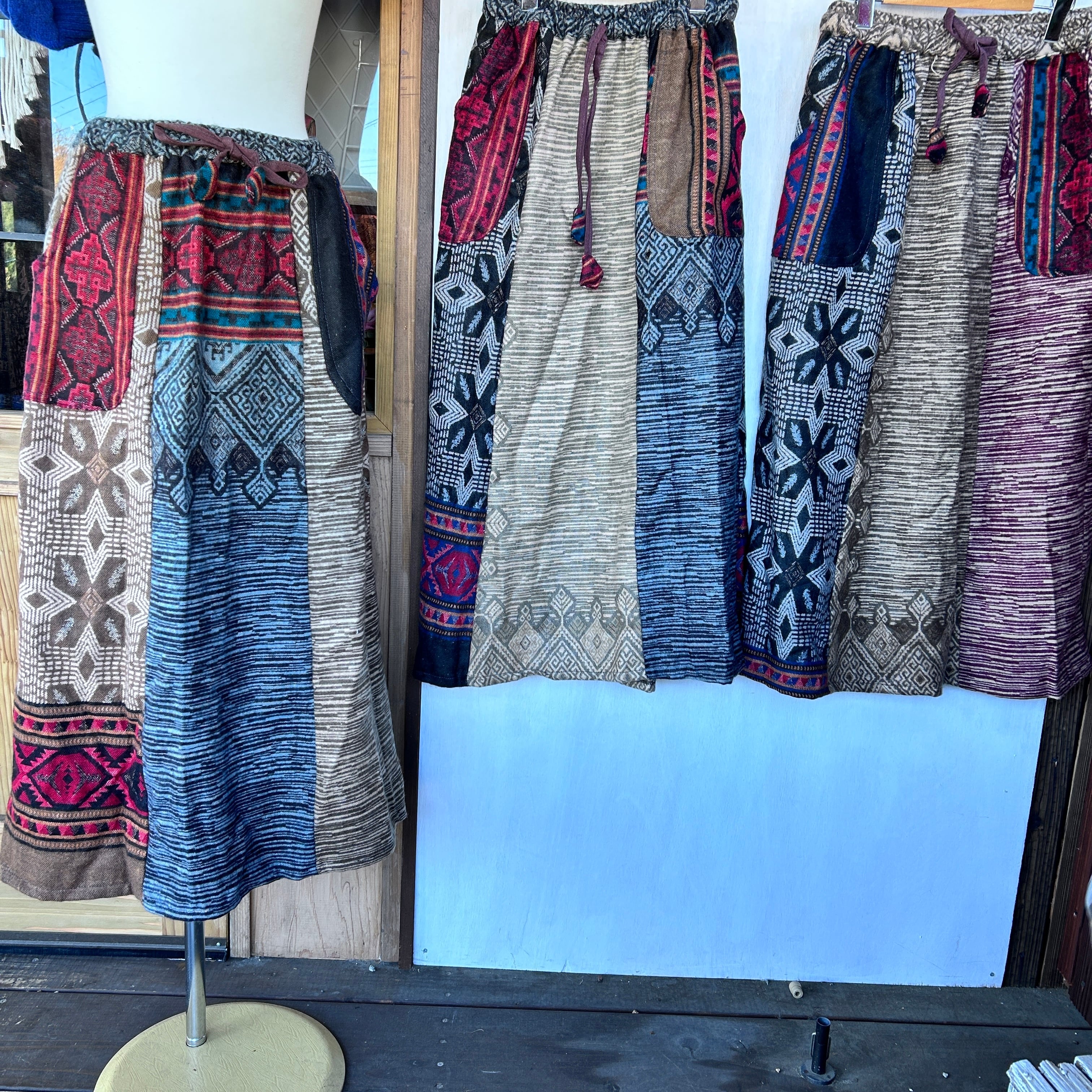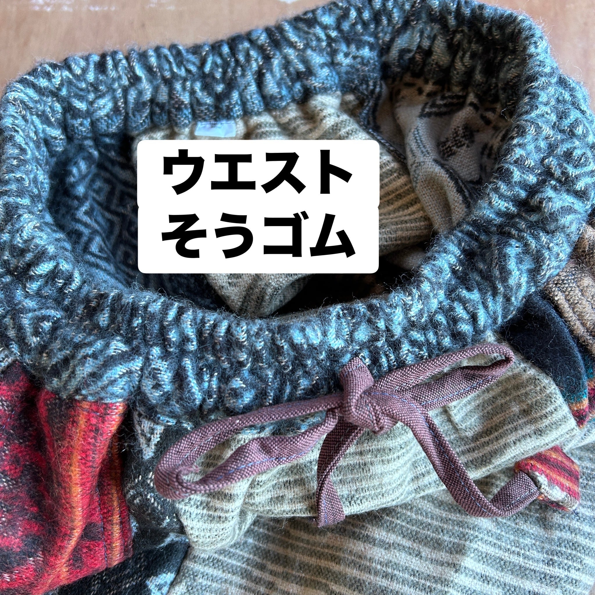 暖かさが魅力のヤク切り替えスカート。豪華なヤクウールの使用で、優れた保温性を備えています。パッチワークデザインがアクセントとなり、他にはない個性的なスタイリングが楽しめます。ウエスト部分は伸縮性のあるゴムと紐の2ウェイタイプ