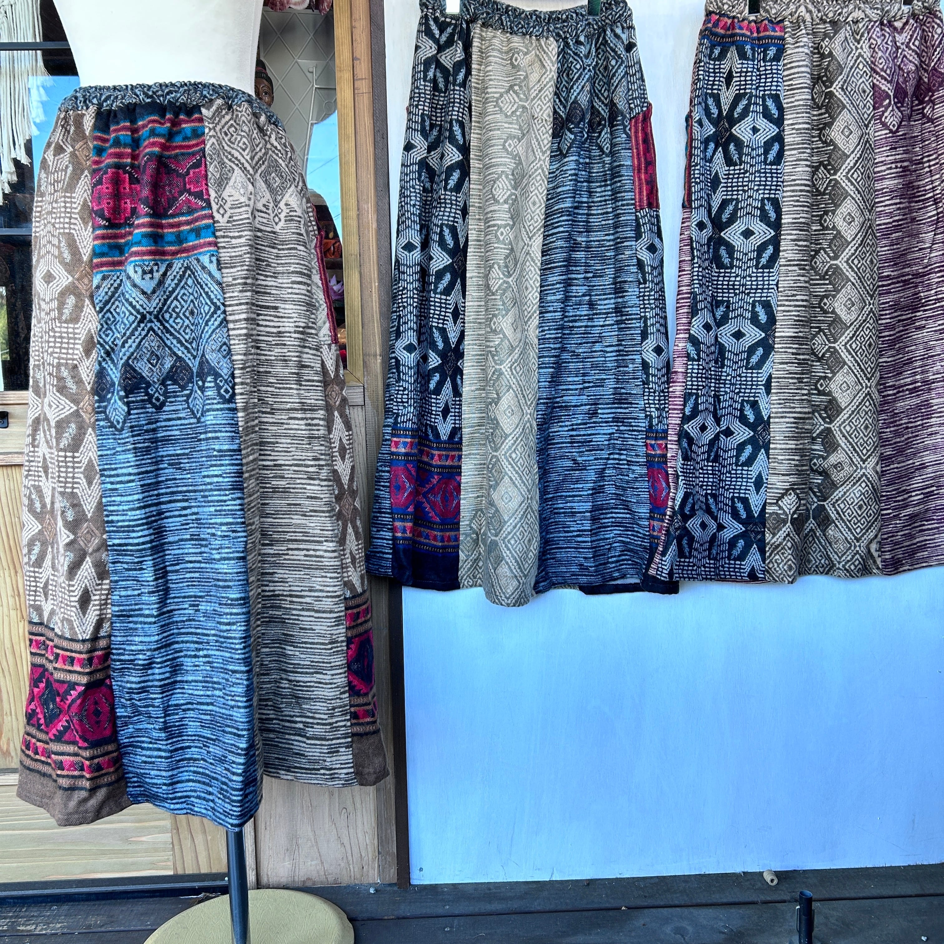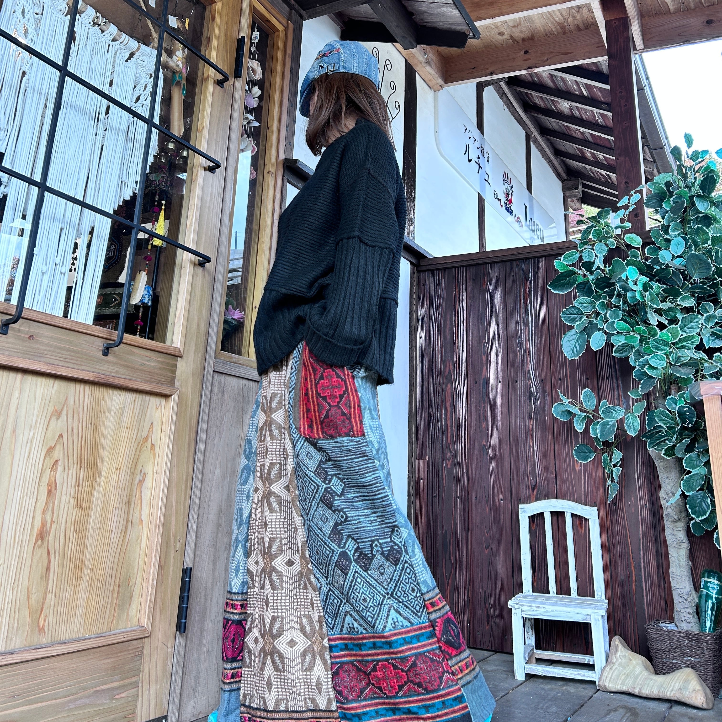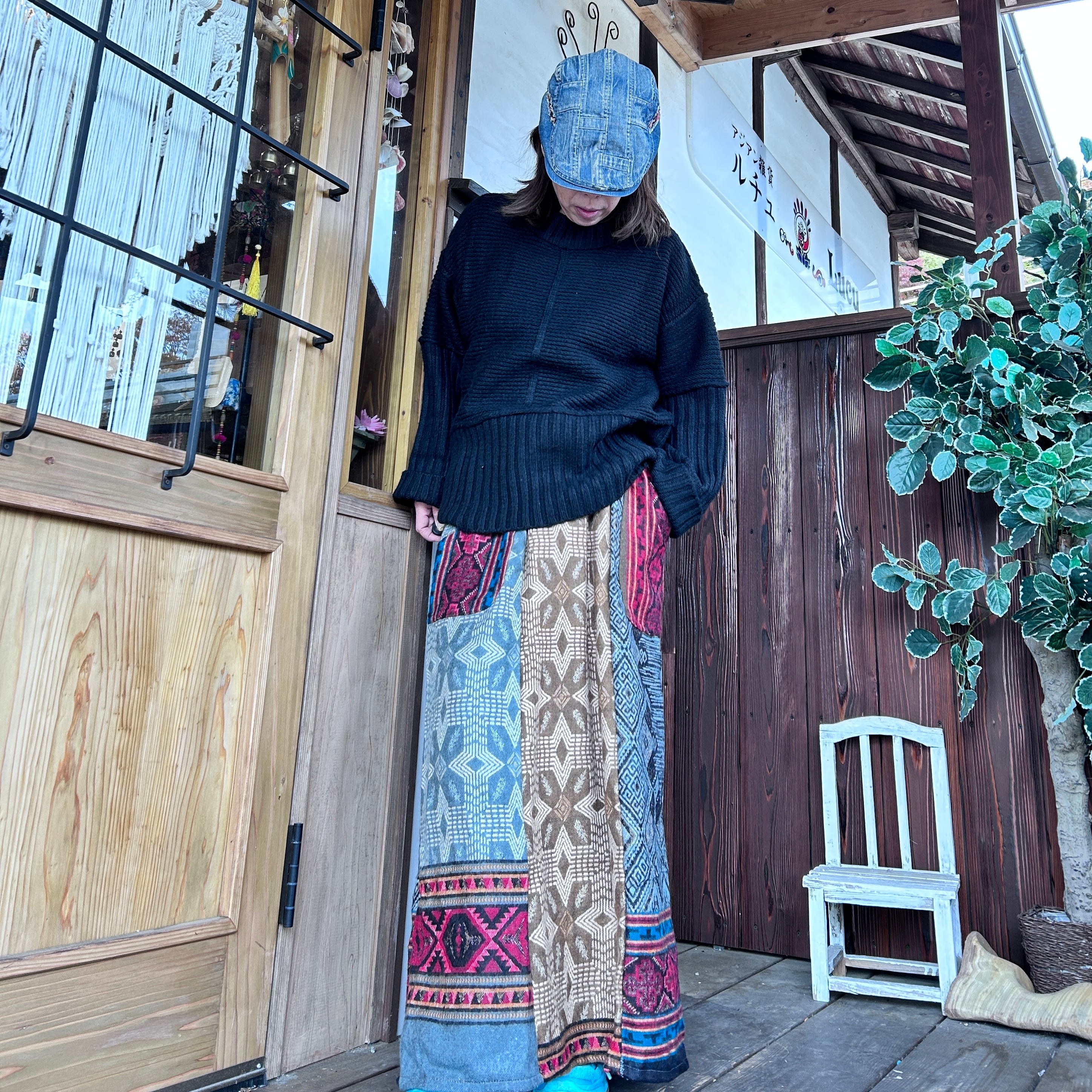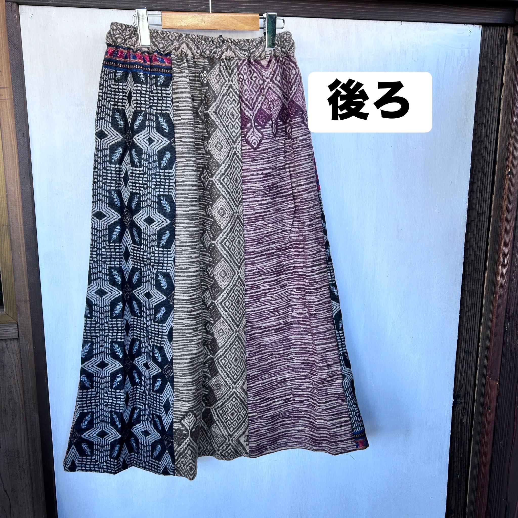 暖かさが魅力のヤク切り替えスカート。豪華なヤクウールの使用で、優れた保温性を備えています。パッチワークデザインがアクセントとなり、他にはない個性的なスタイリングが楽しめます。ウエスト部分は伸縮性のあるゴムと紐の2ウェイタイプ