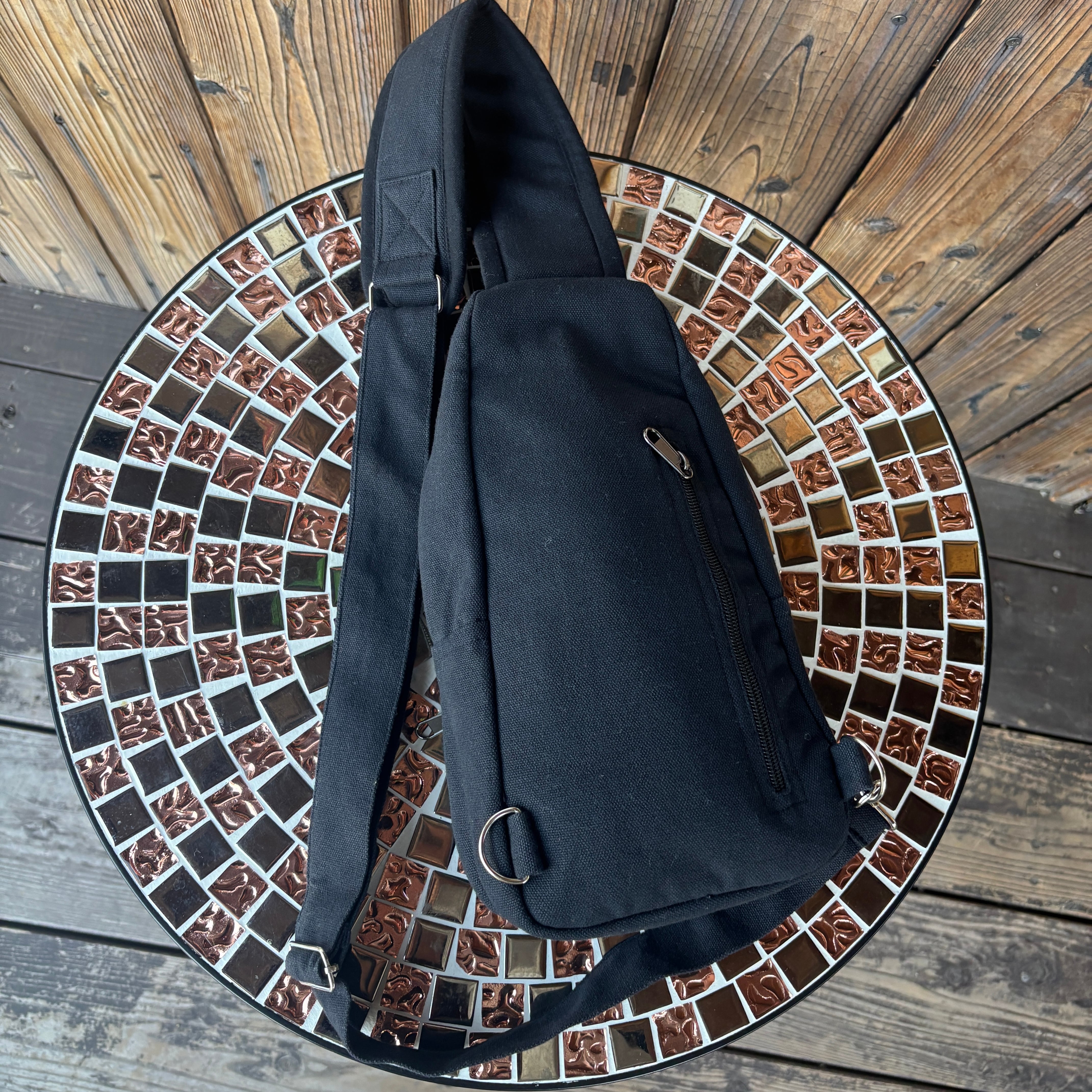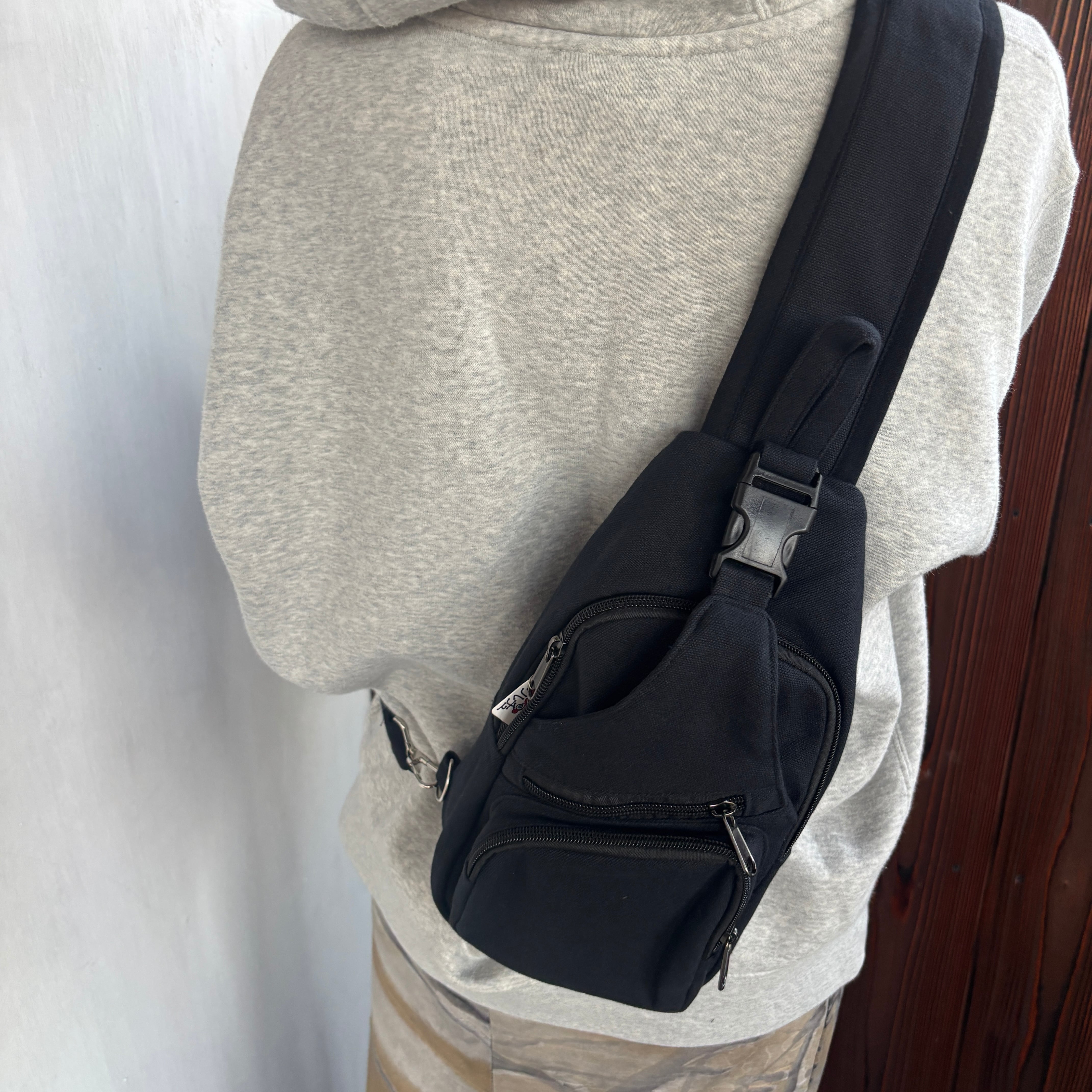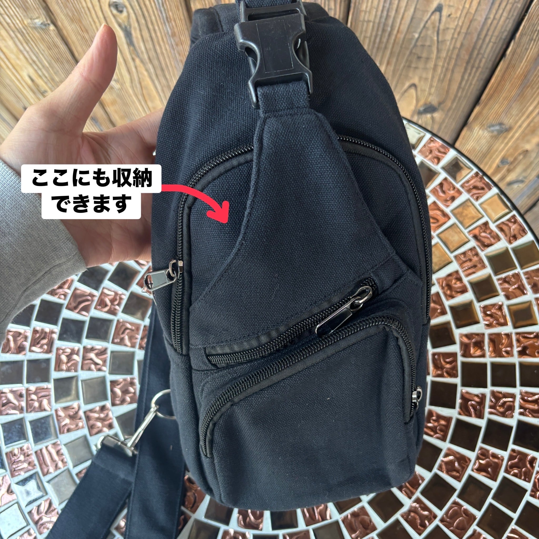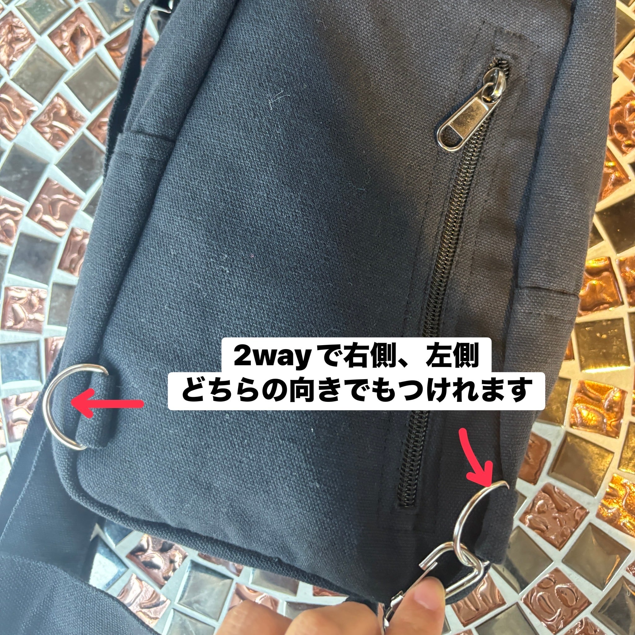 ショルダーバッグとしての斜めがけと、ボディバックとしての2通りの使い方ができ、右側、左側どちらのフックにでも付けれるようになってます。
