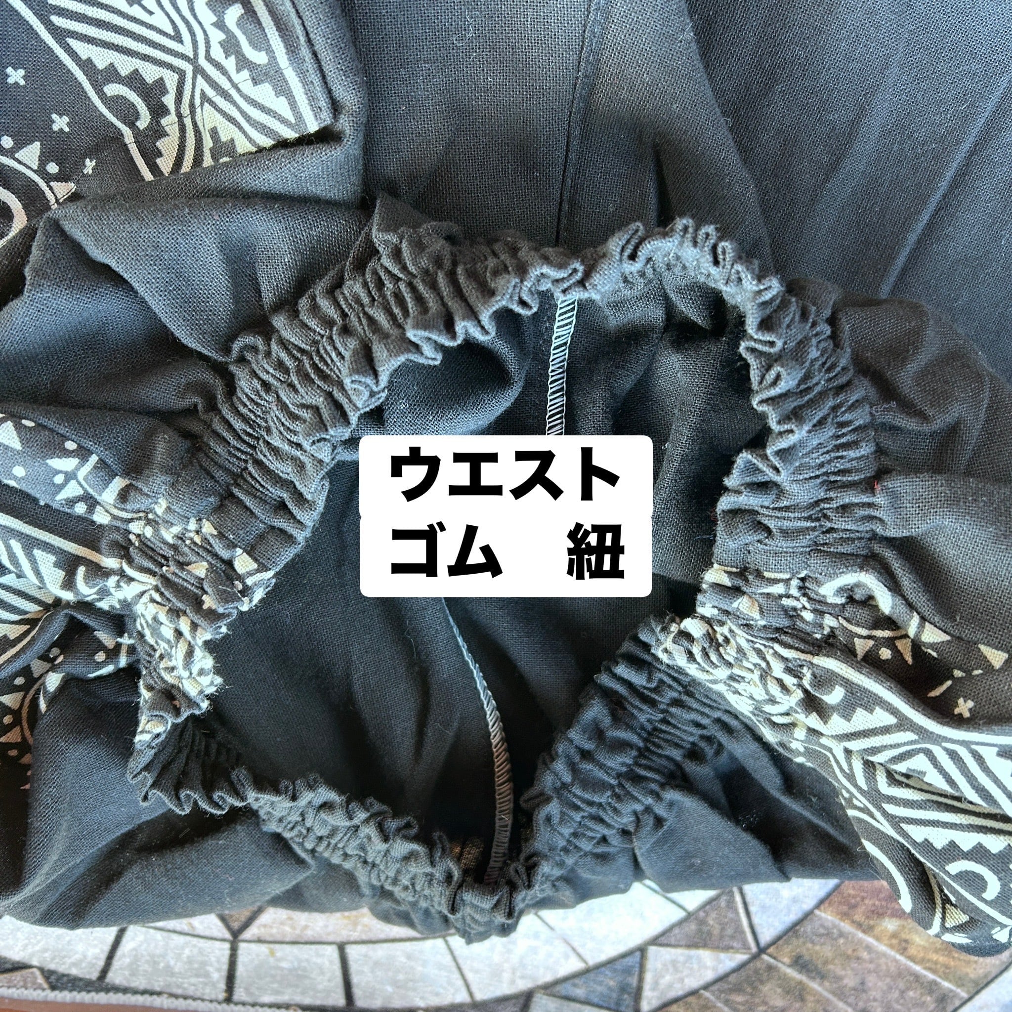 ウエストはゴムと紐で調節可能。