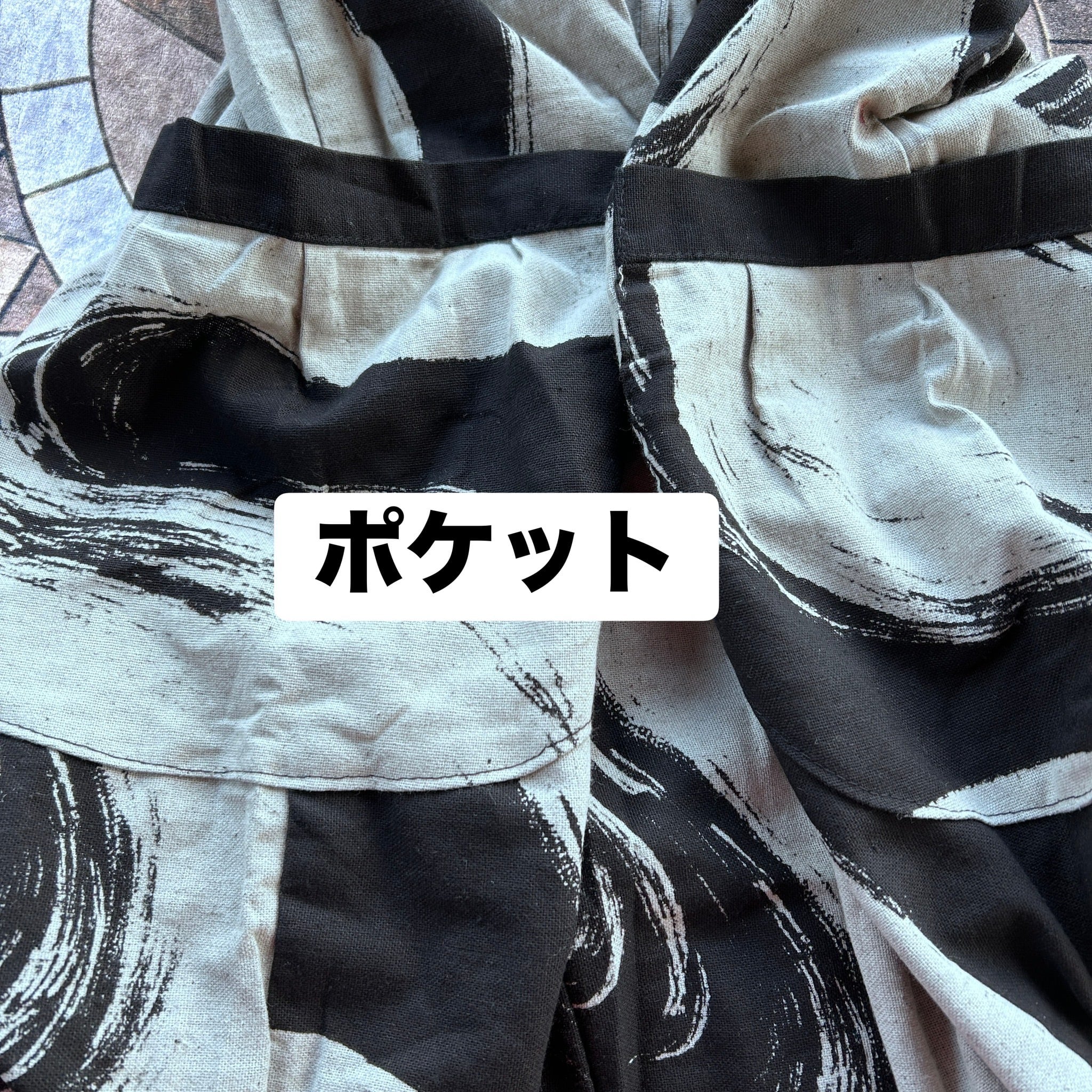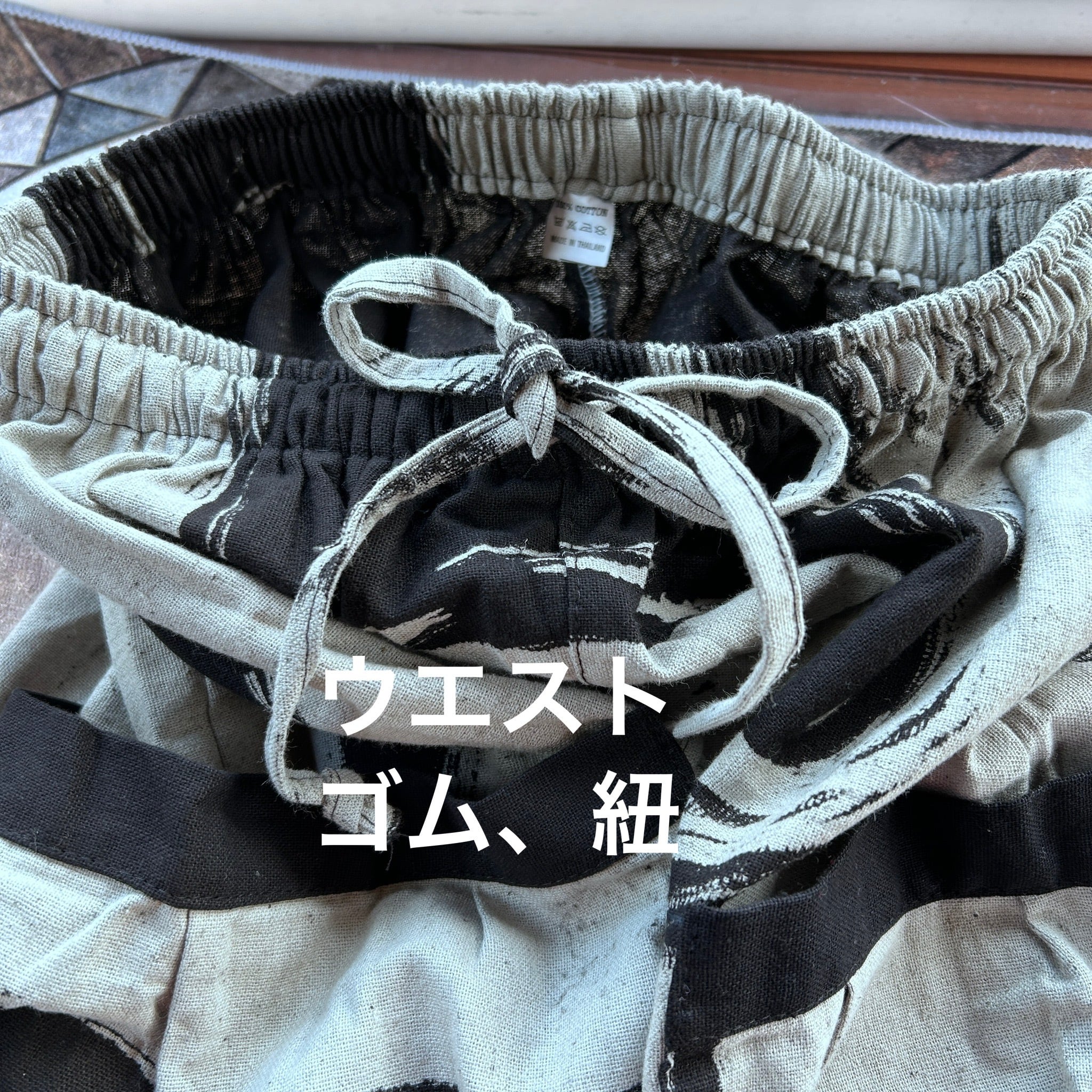 ウエストはゴムと紐で調整可能。