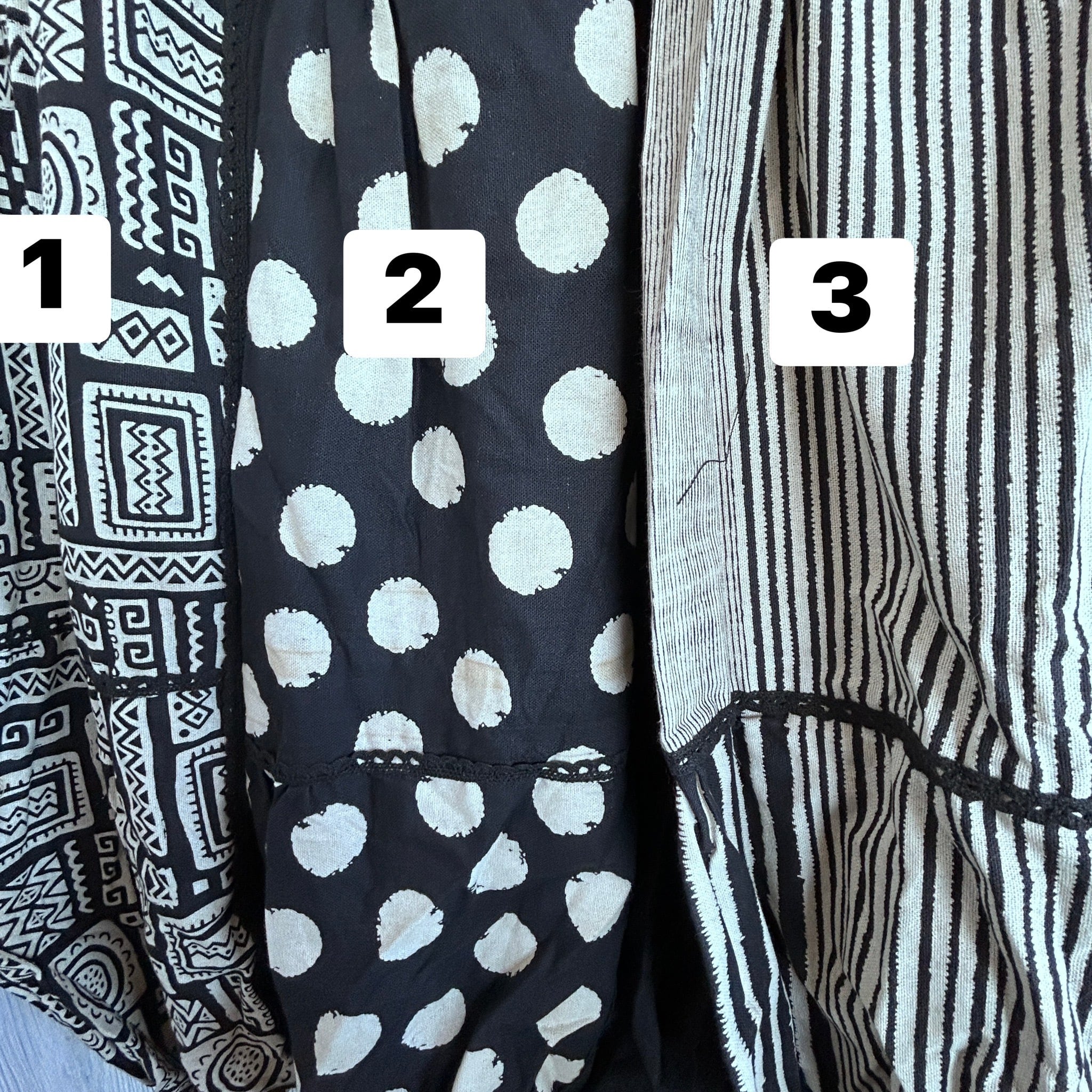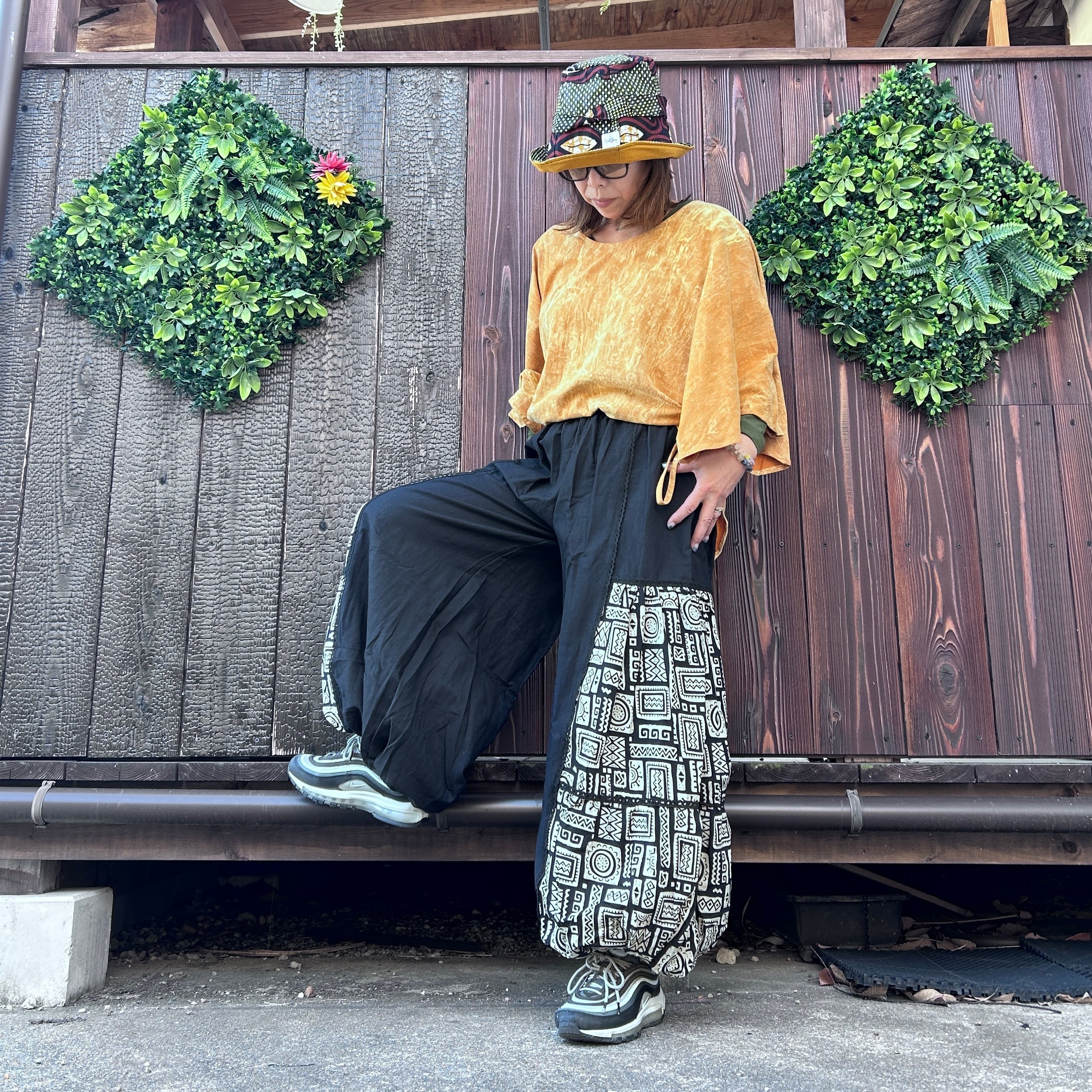 ブラックの無地と柄のコンビネーションが個性的です〜