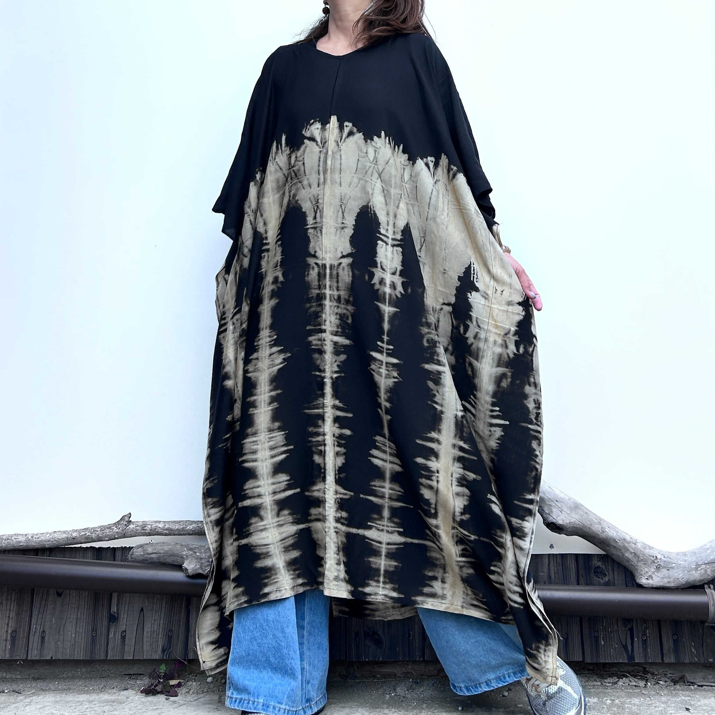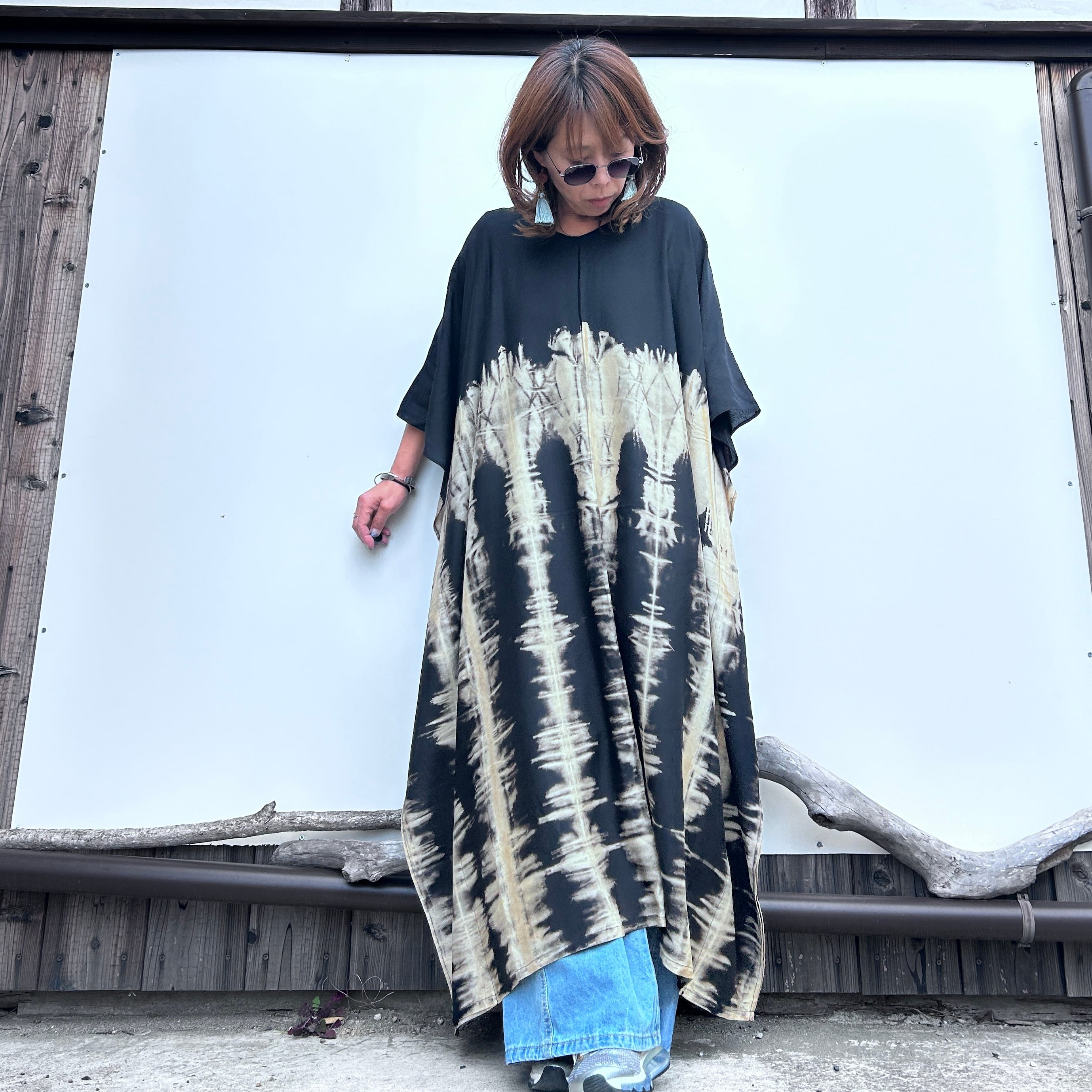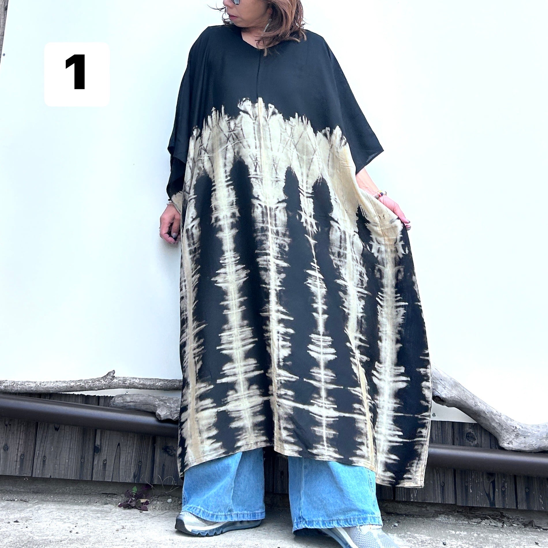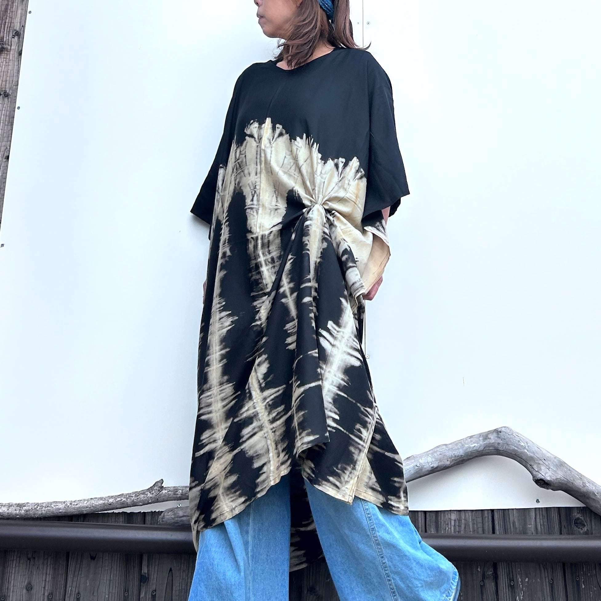 スタイリッシュなタイダイ模様が印象的なモノトーンビッグワンピース。リラックスしたシルエットながらも、個性的で洗練されたデザインが特徴です。そして、さまざまなシーンで大活躍すること間違いなし!