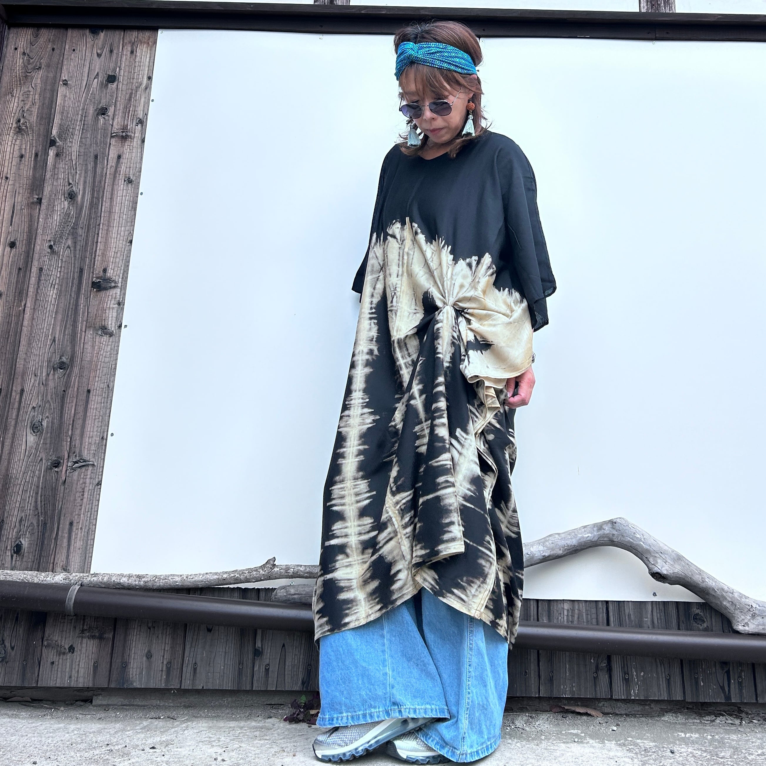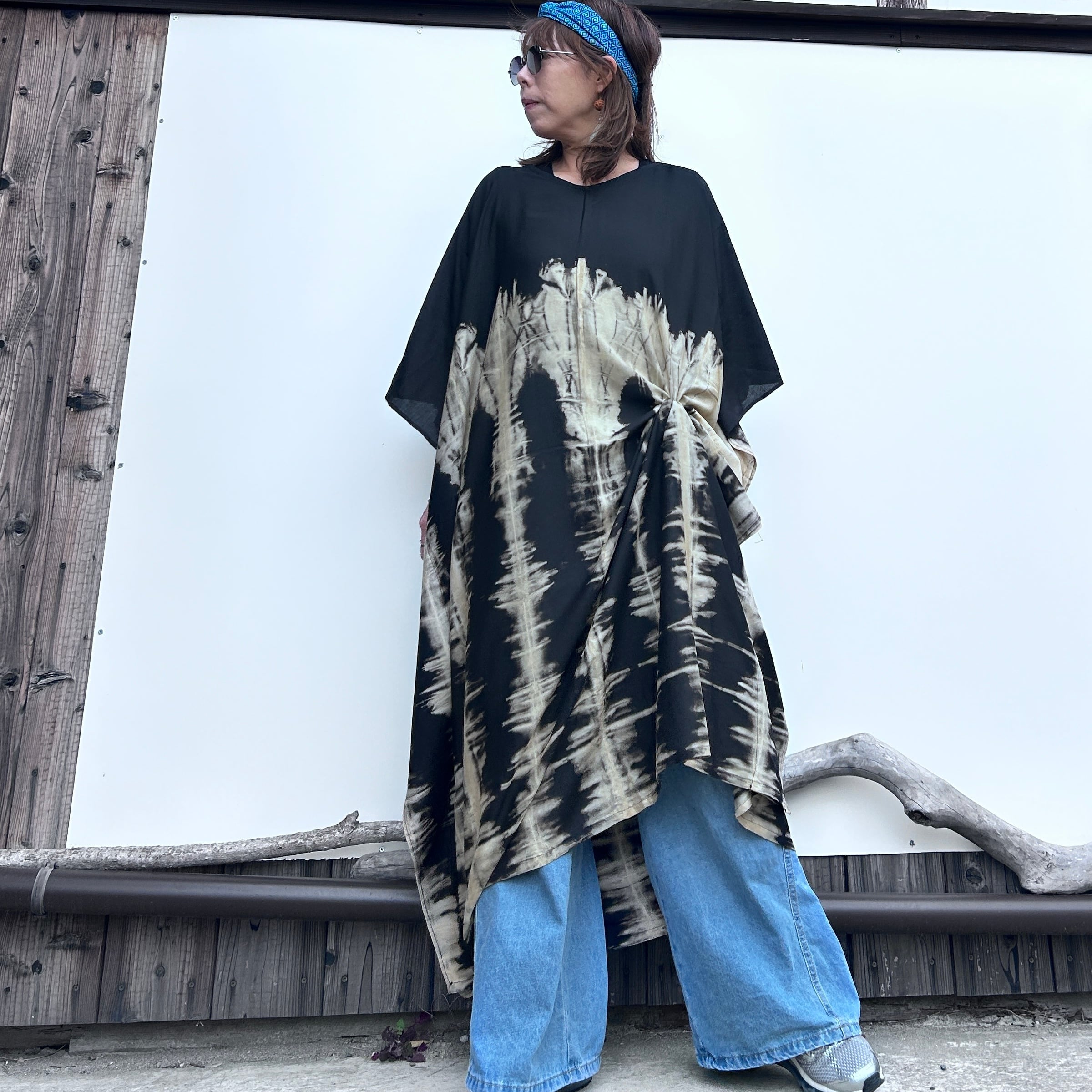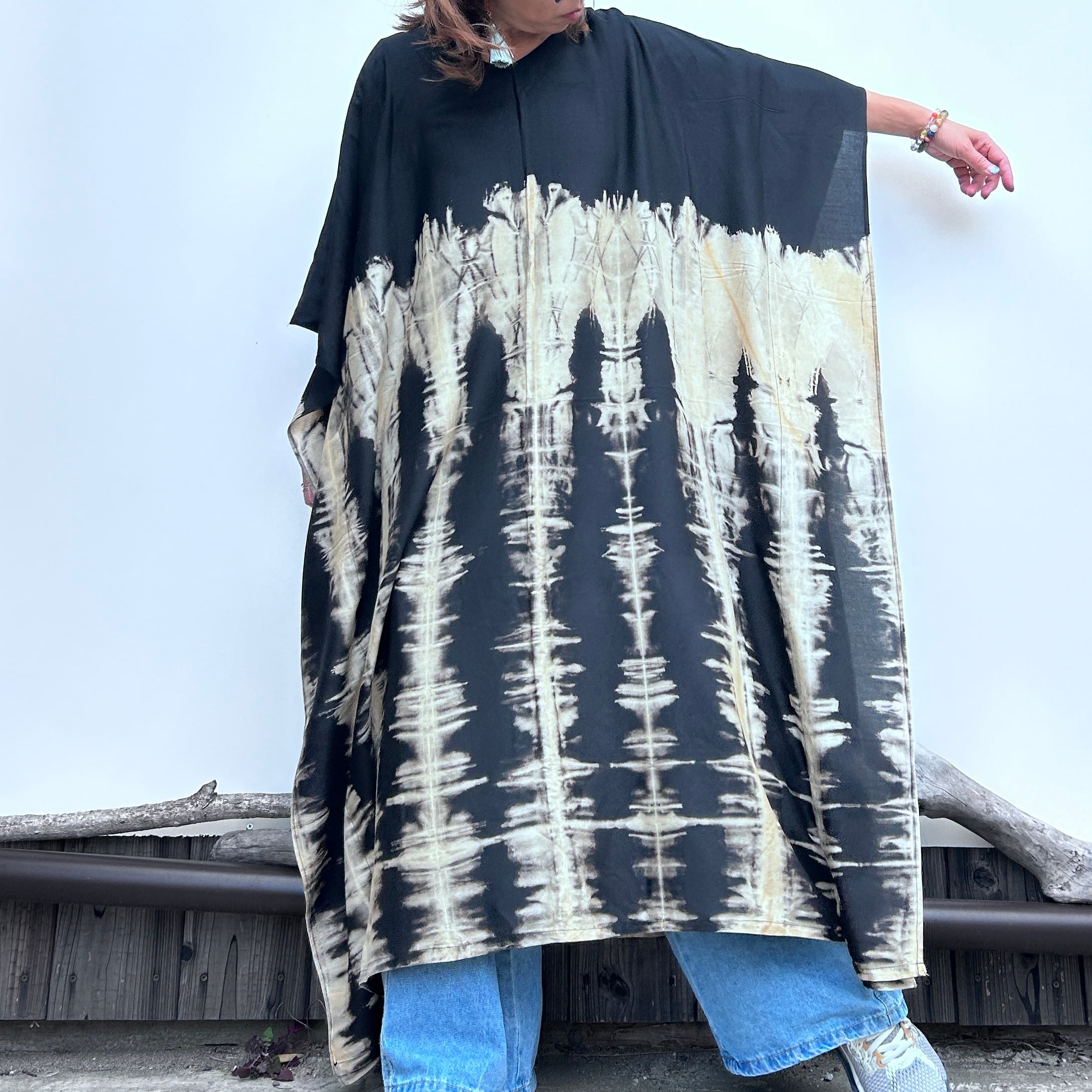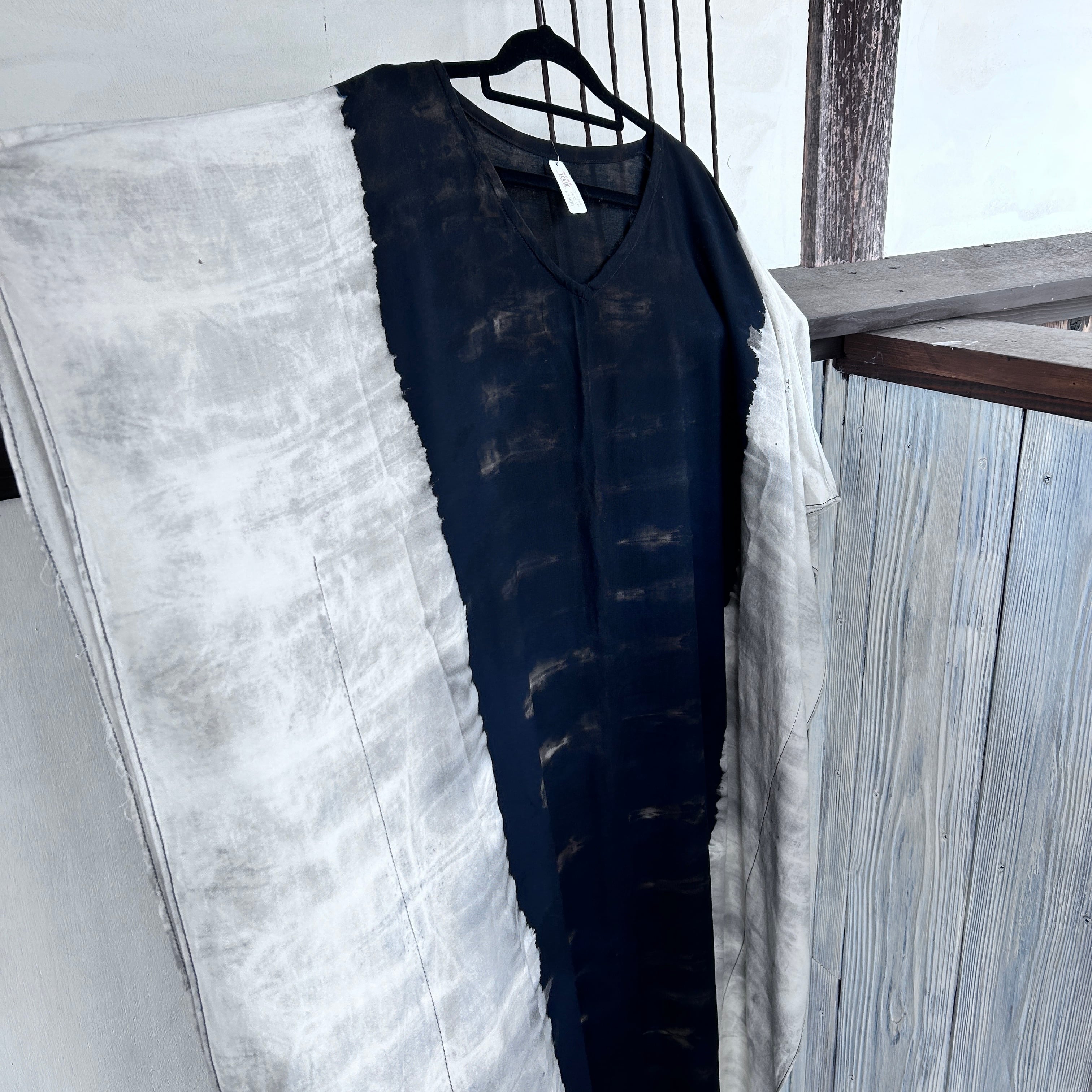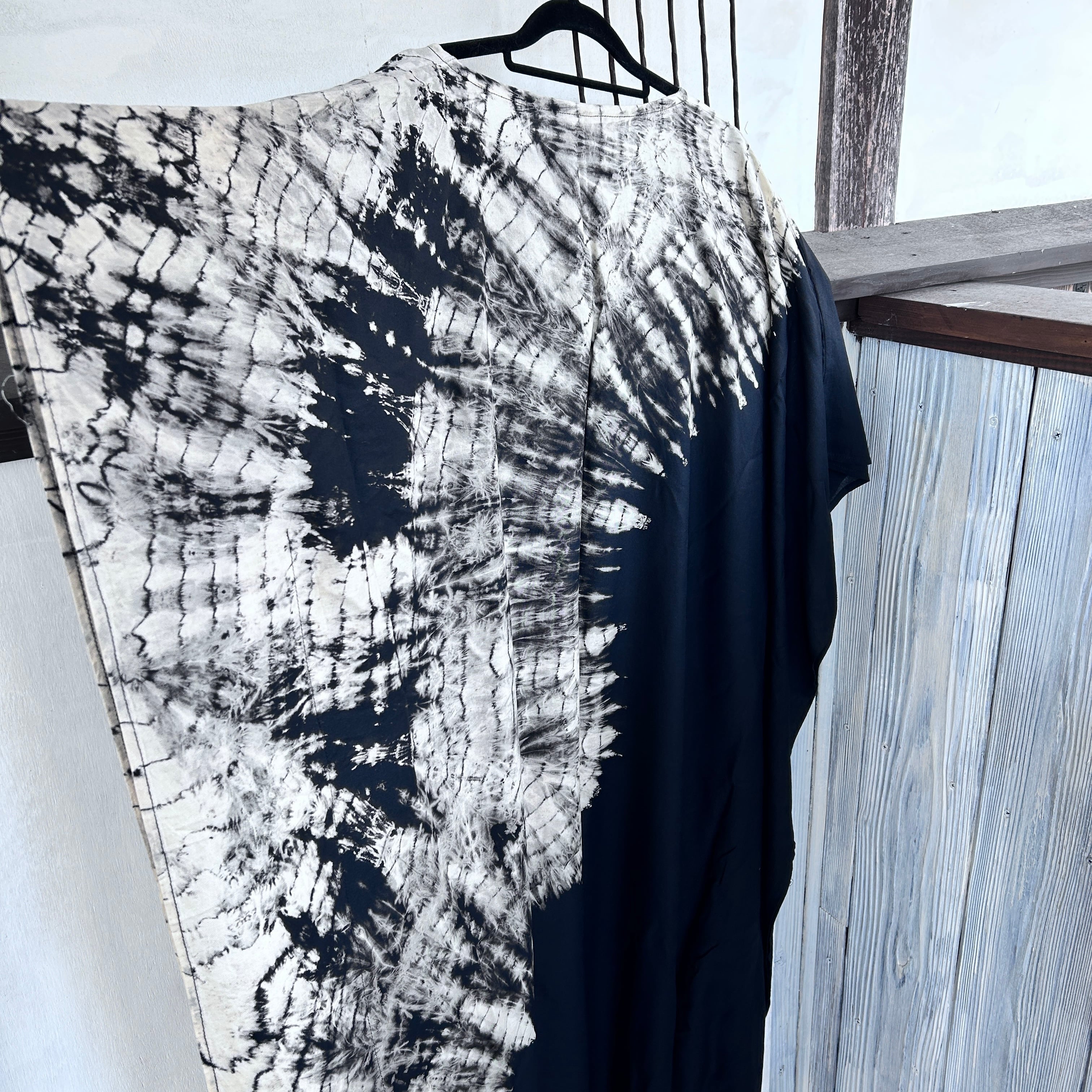 スタイリッシュなタイダイ模様が印象的なモノトーンビッグワンピース。リラックスしたシルエットながらも、個性的で洗練されたデザインが特徴です。そして、さまざまなシーンで大活躍すること間違いなし!