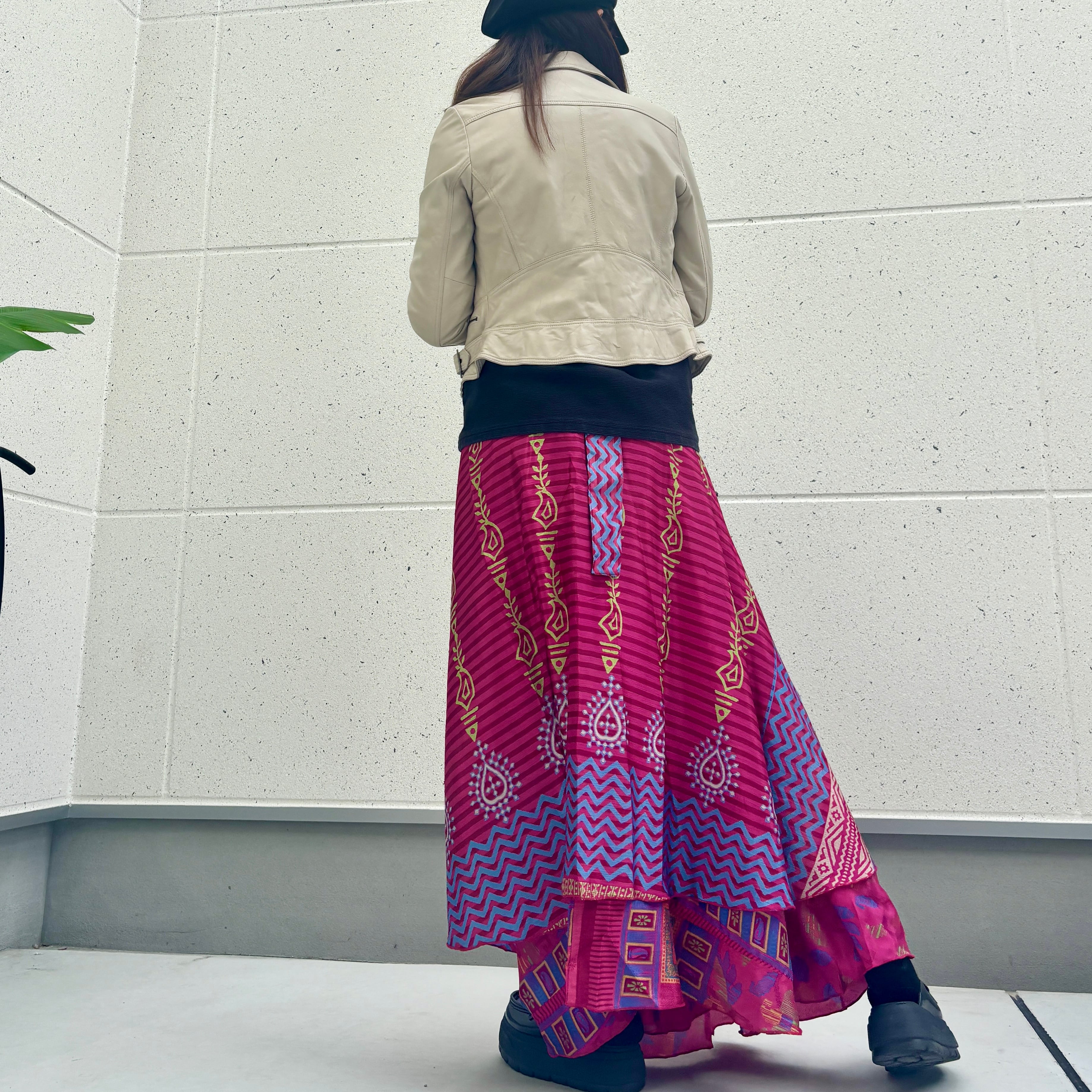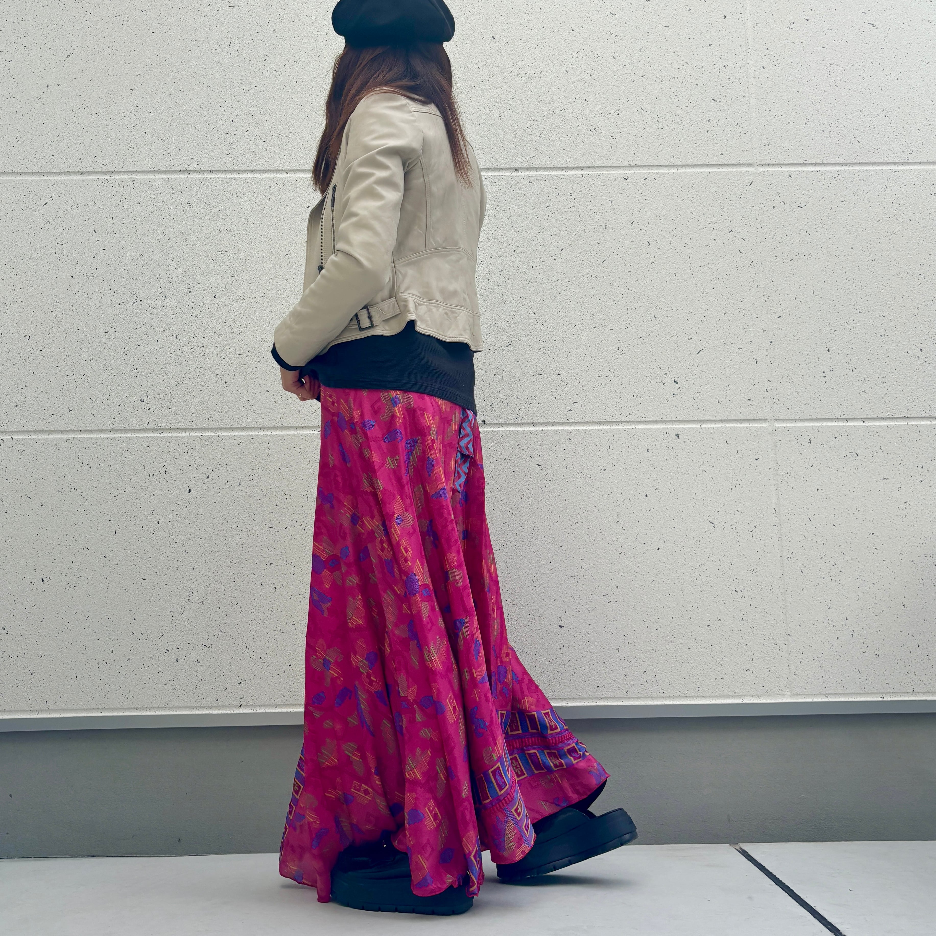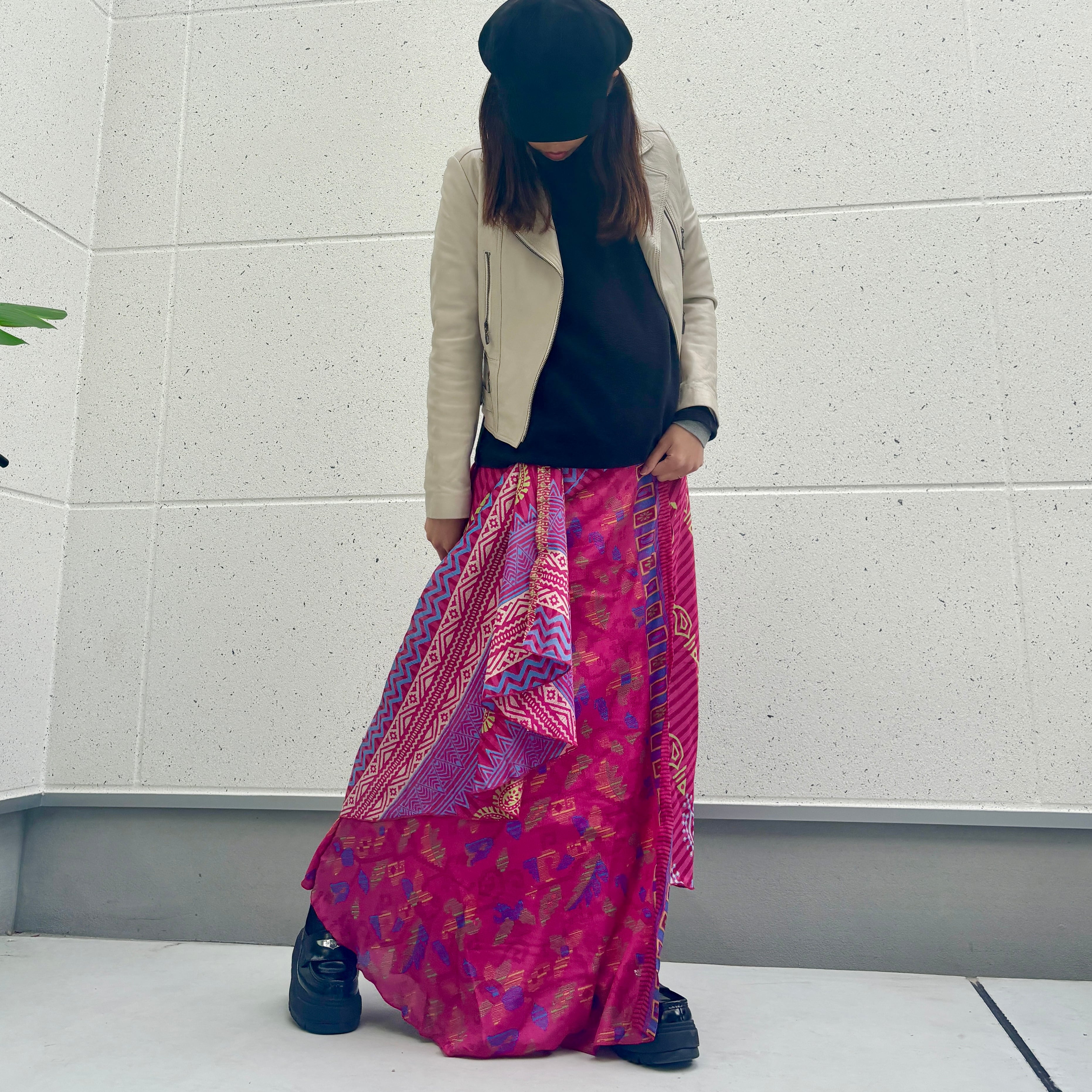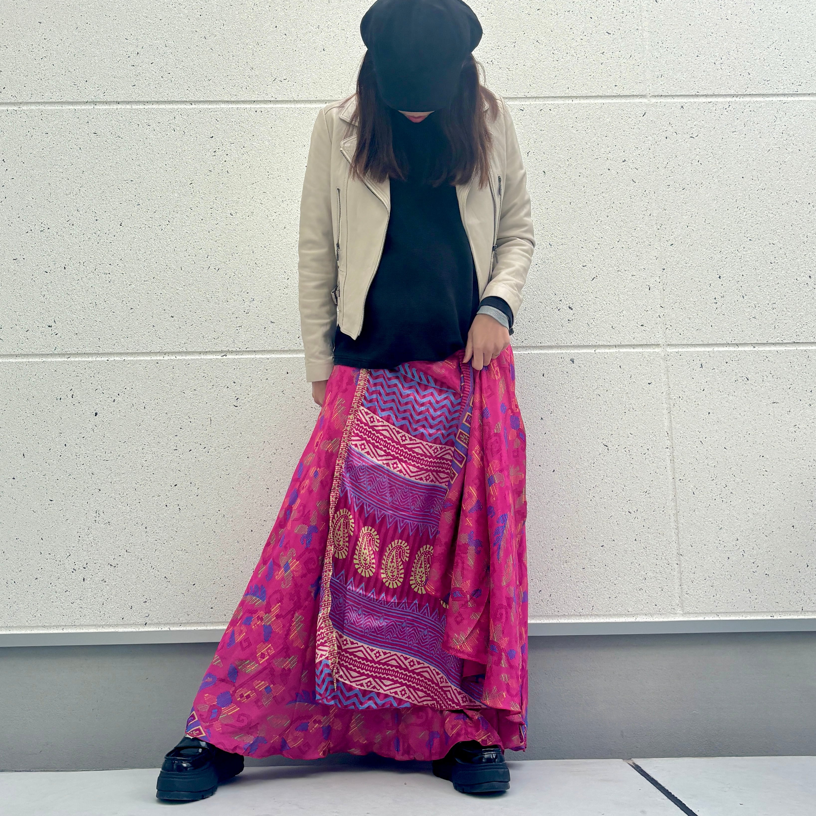 一枚で2通りのコーデが楽しめる、リバーシブルインドサリー巻きスカートです。