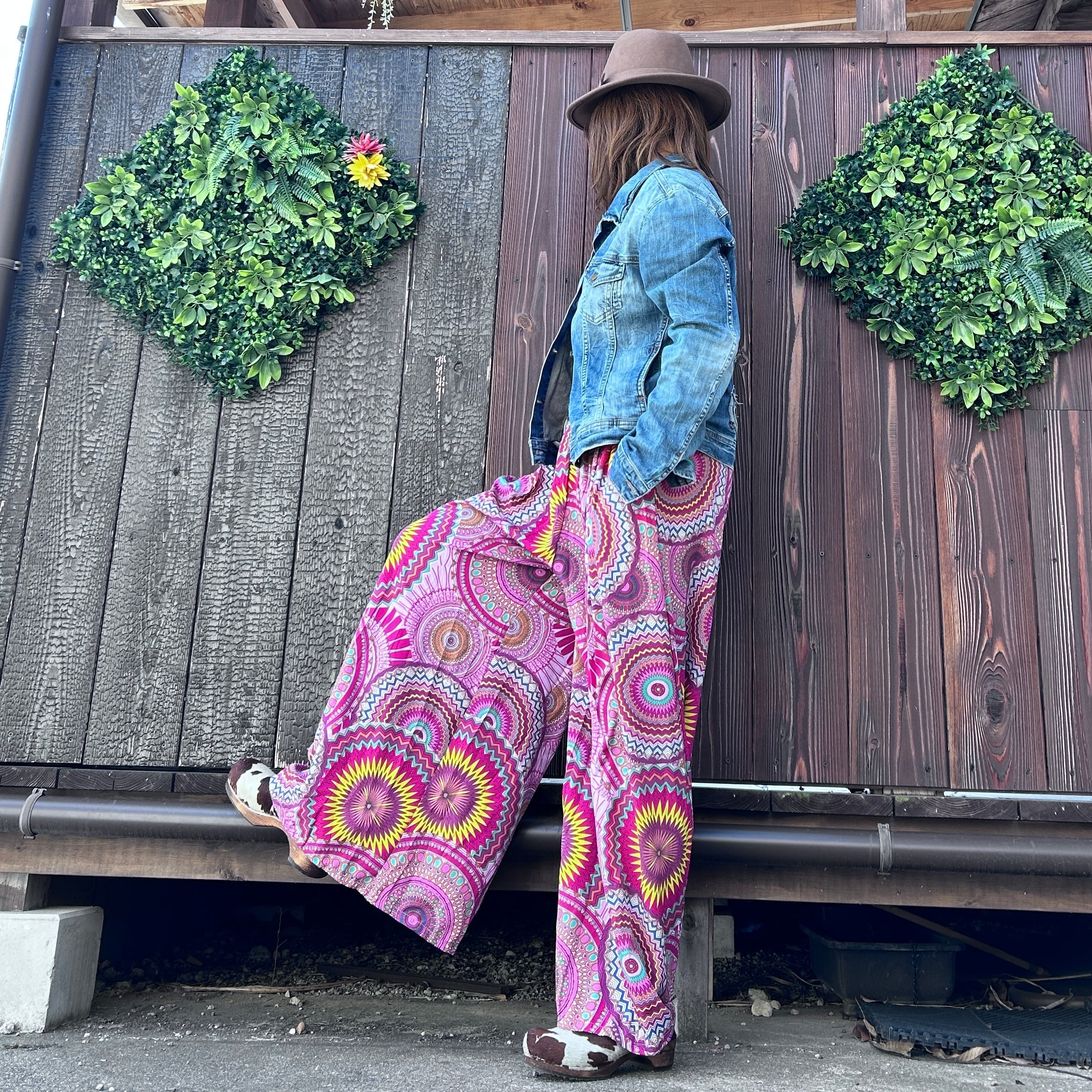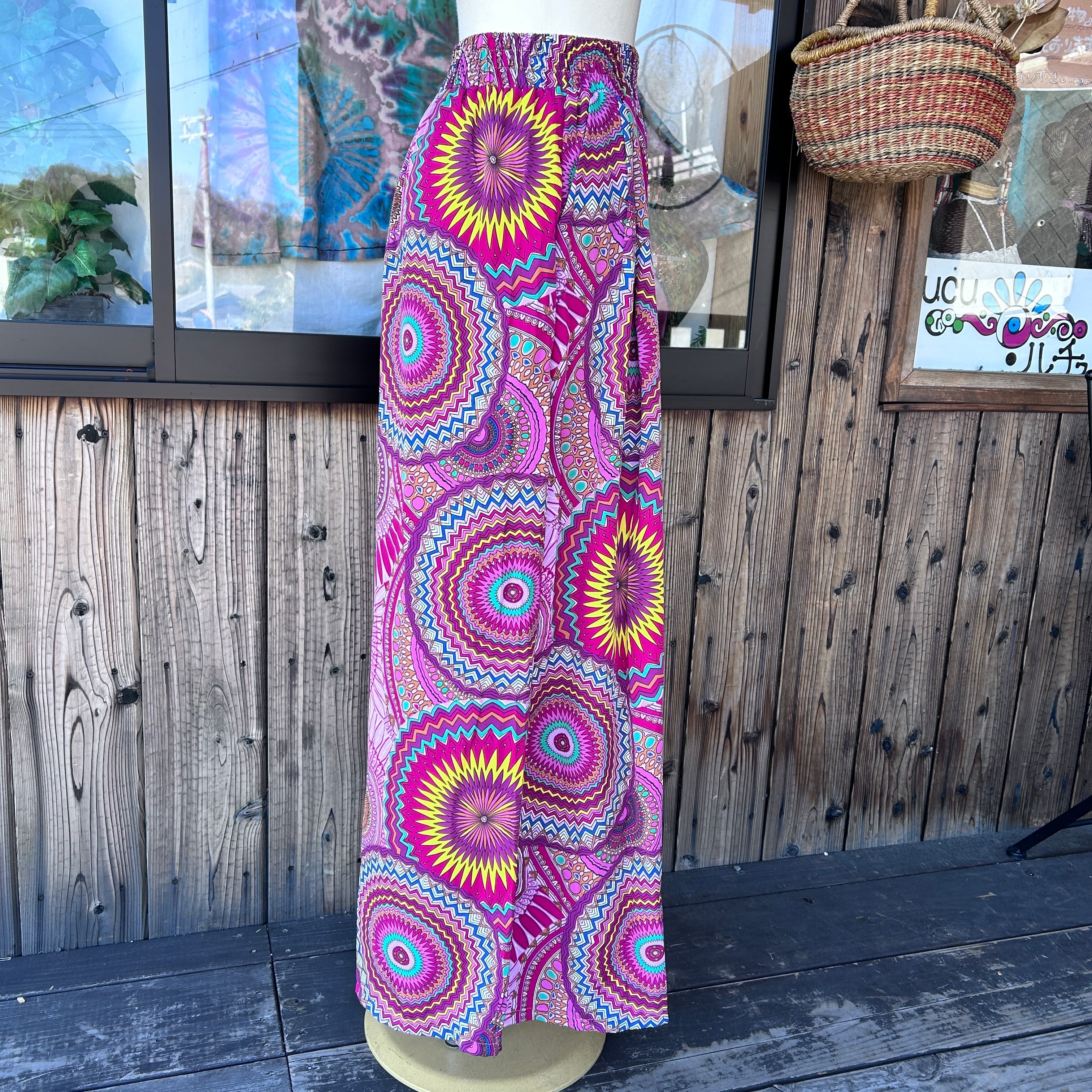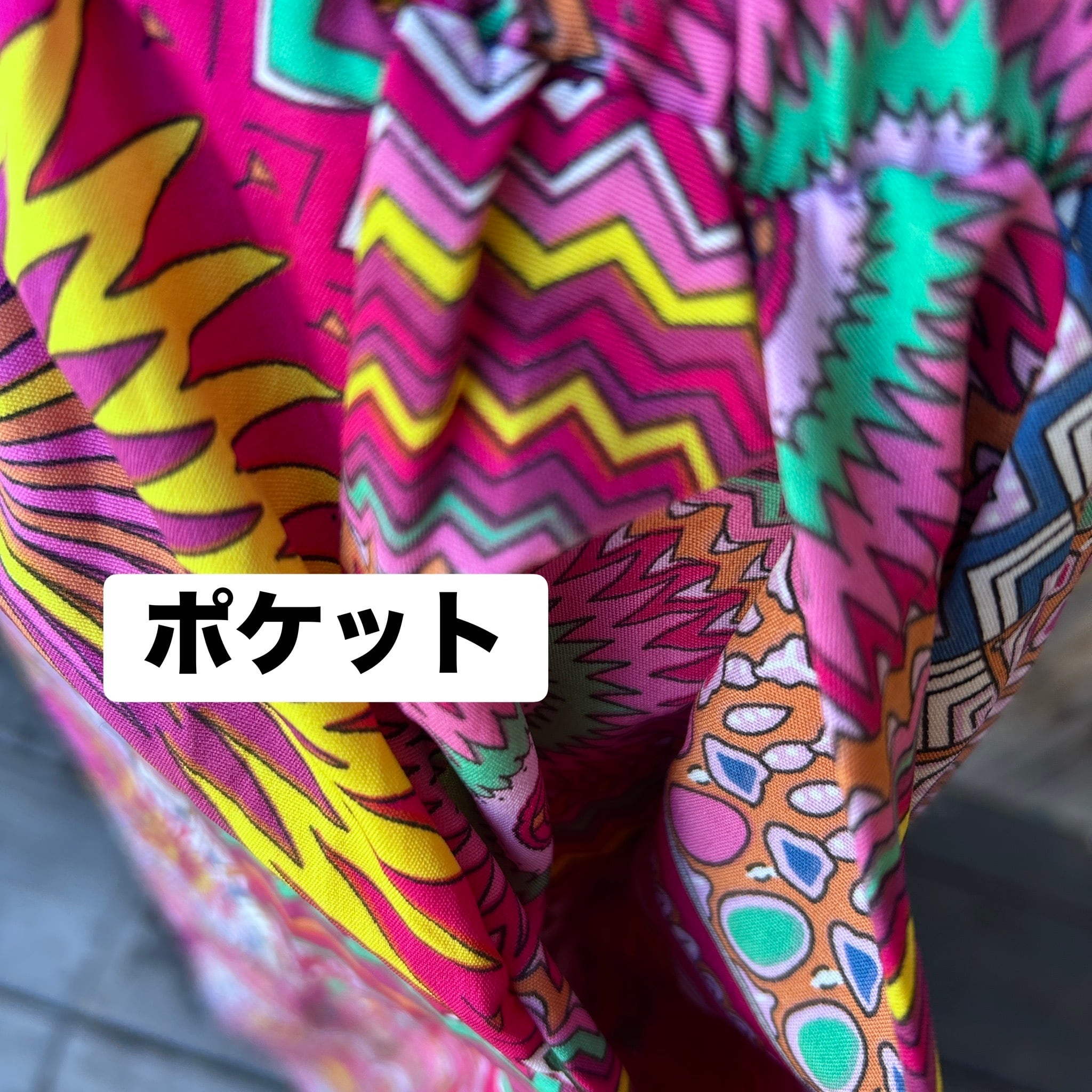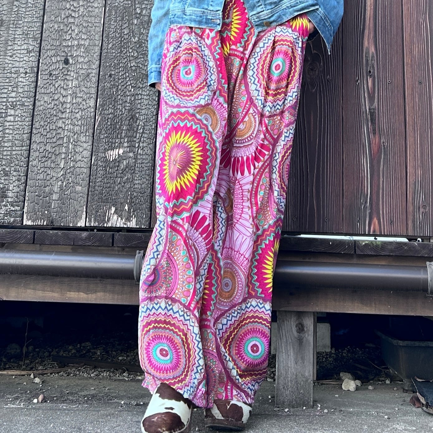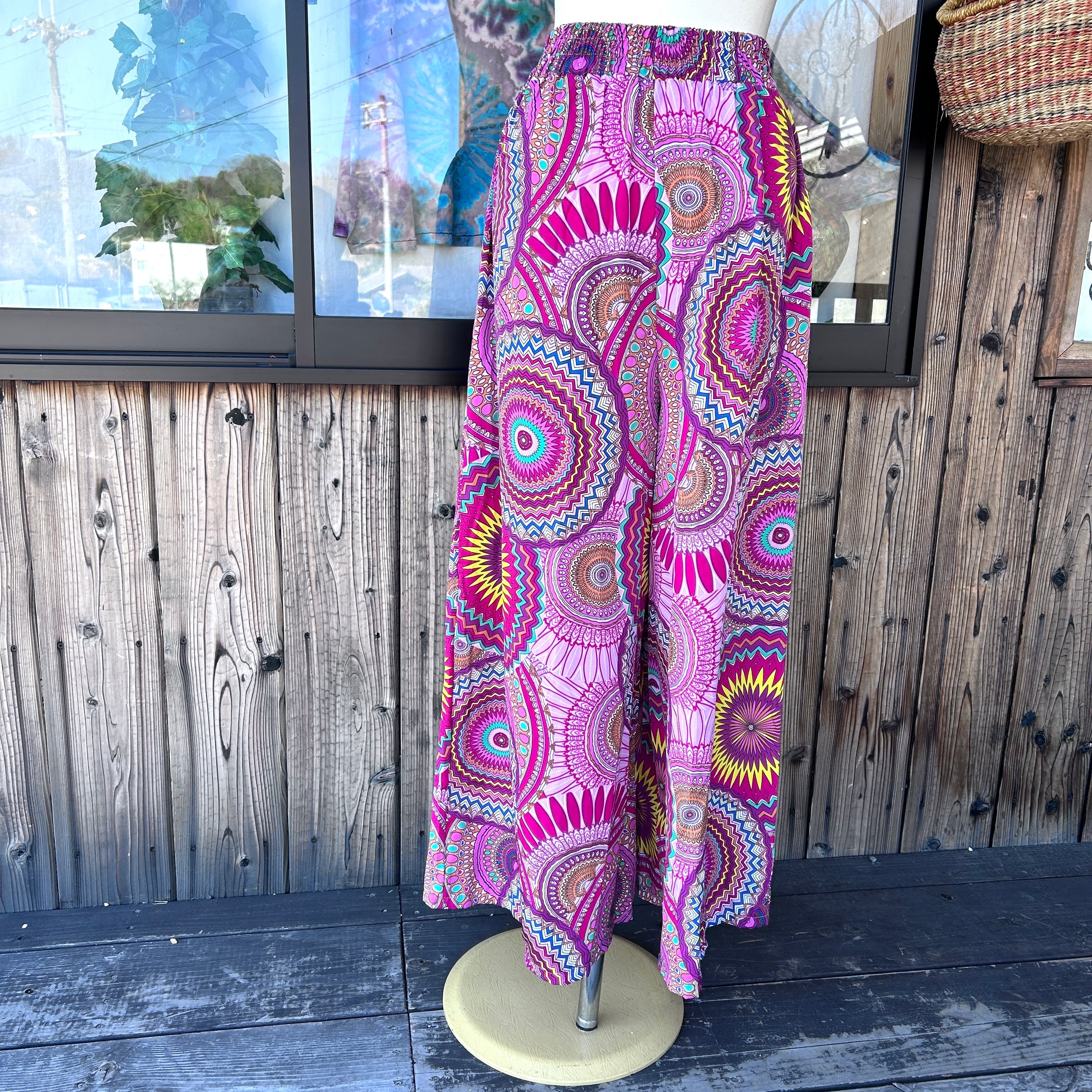 目を惹くカラフルな幾何学柄が印象的なワイドパンツ。