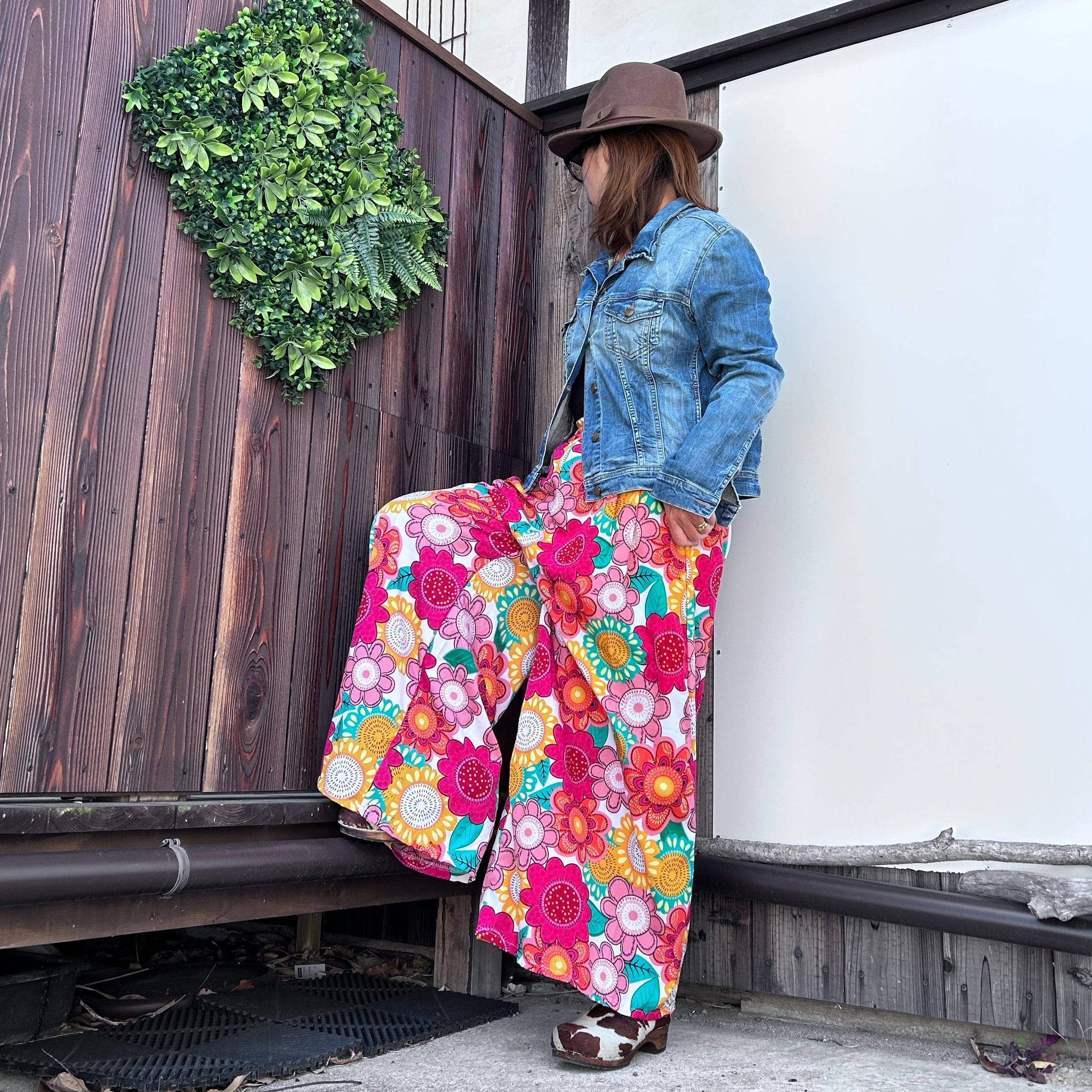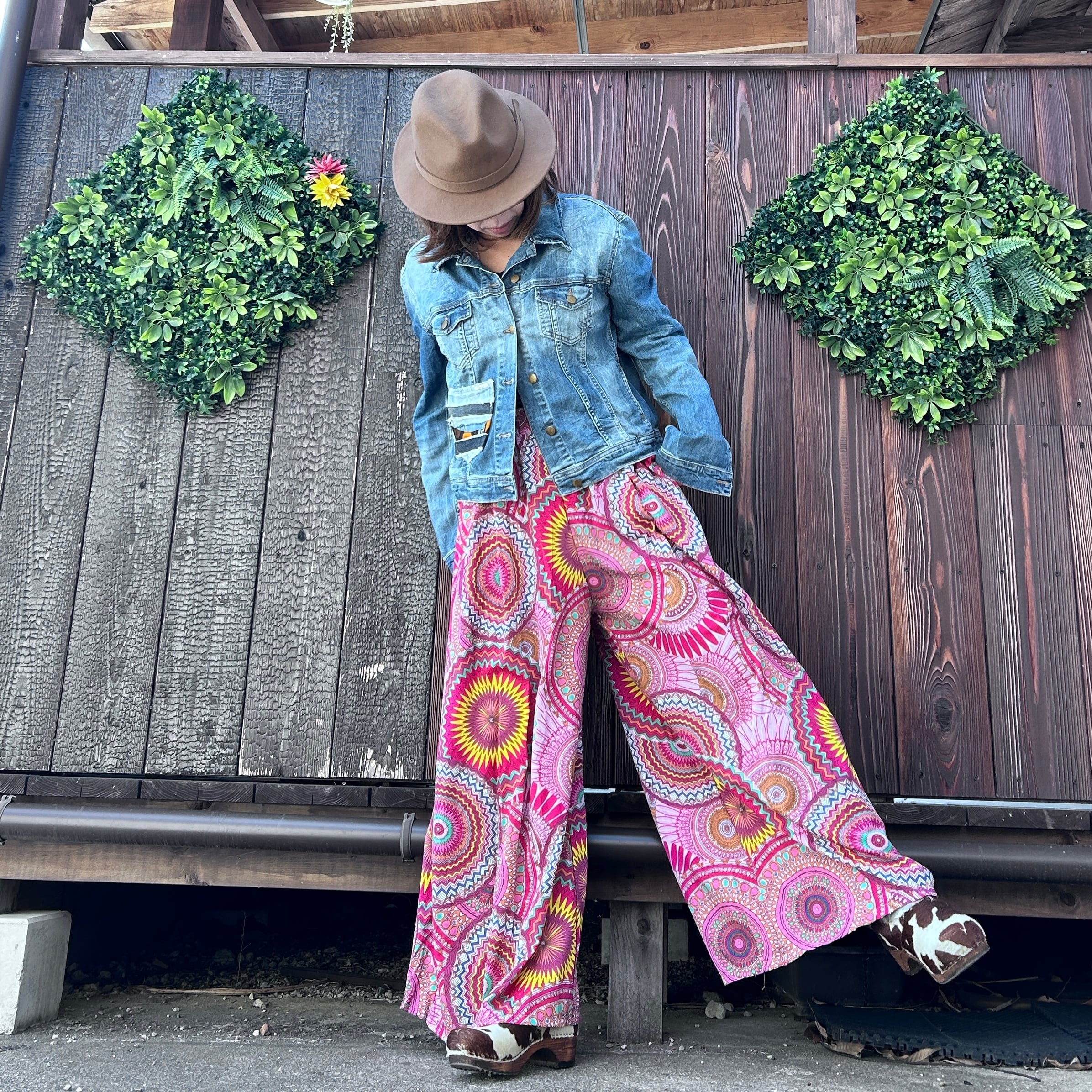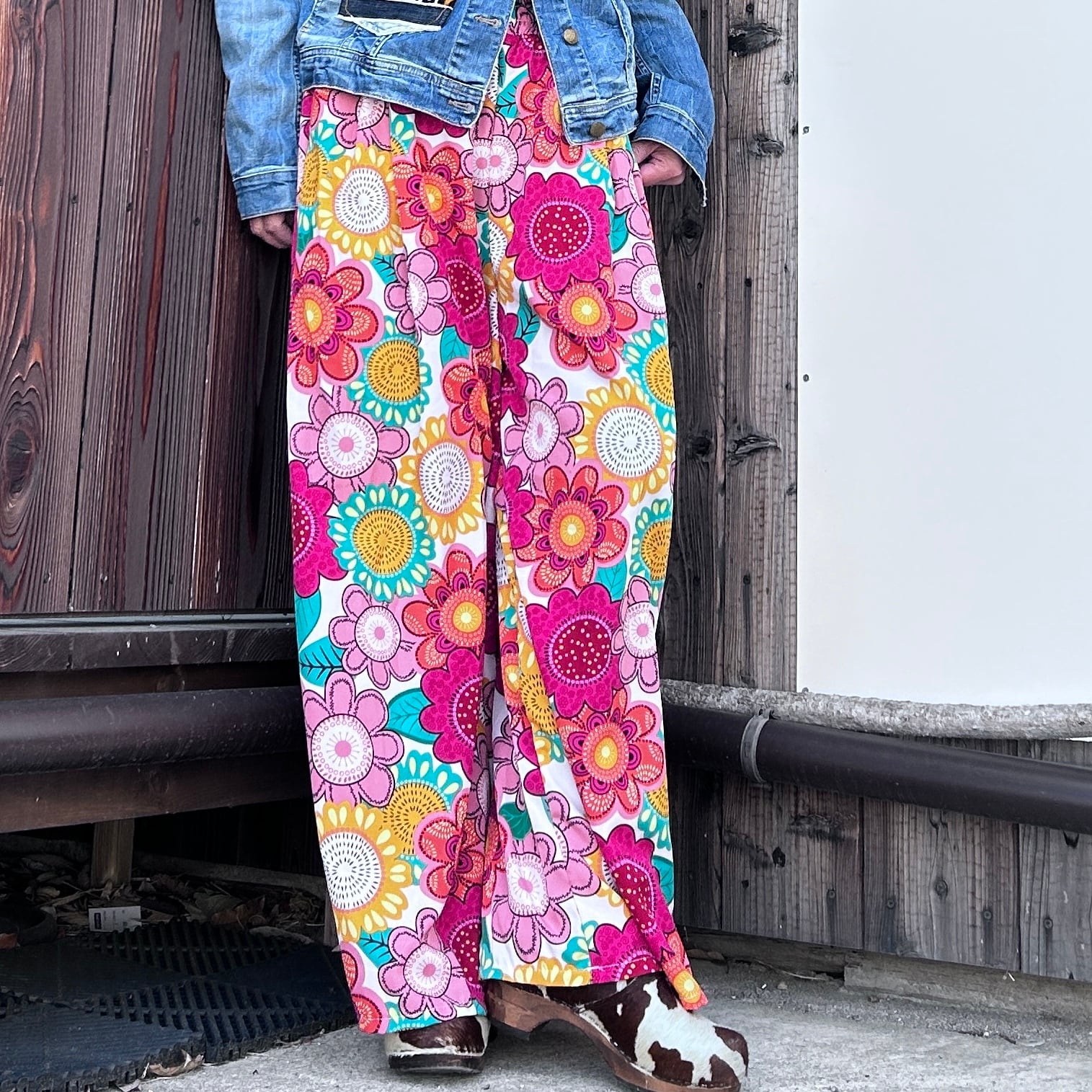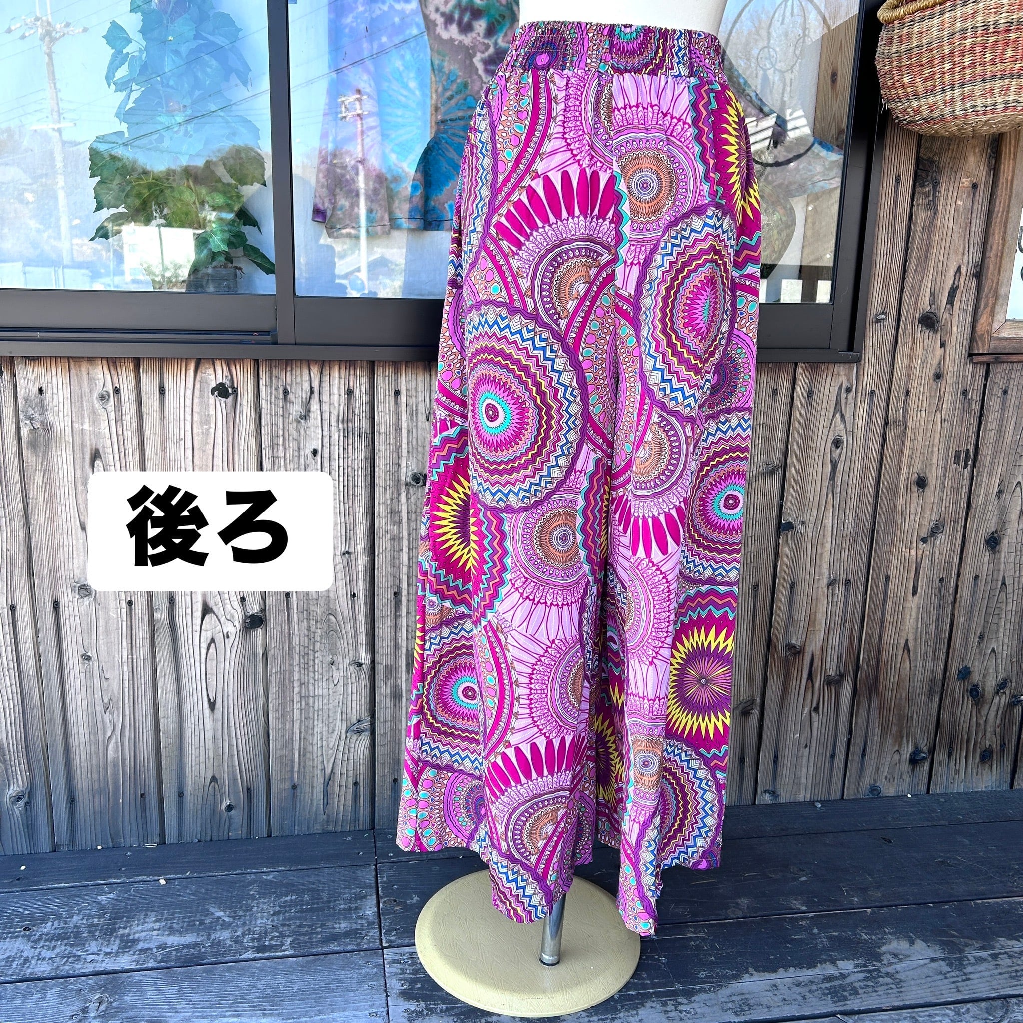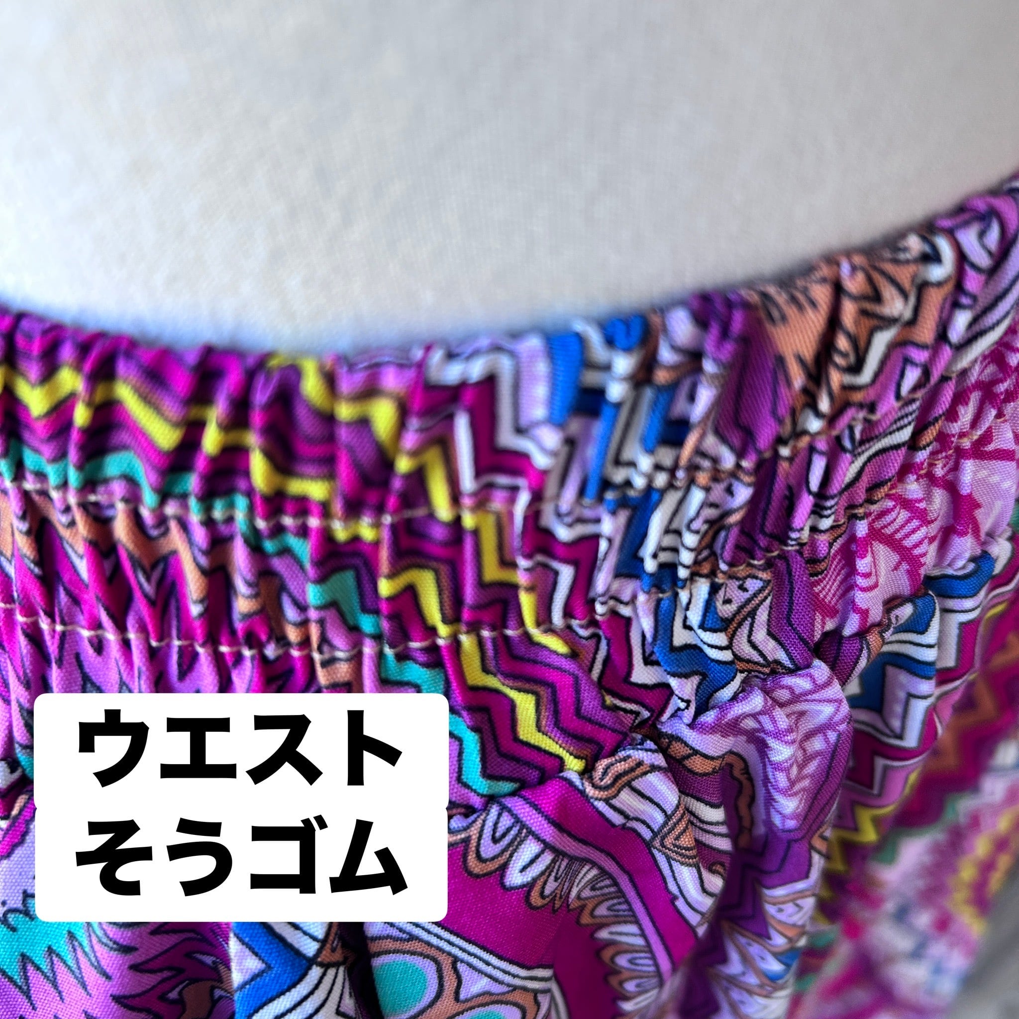 目を惹くカラフルな幾何学柄が印象的なワイドパンツ。