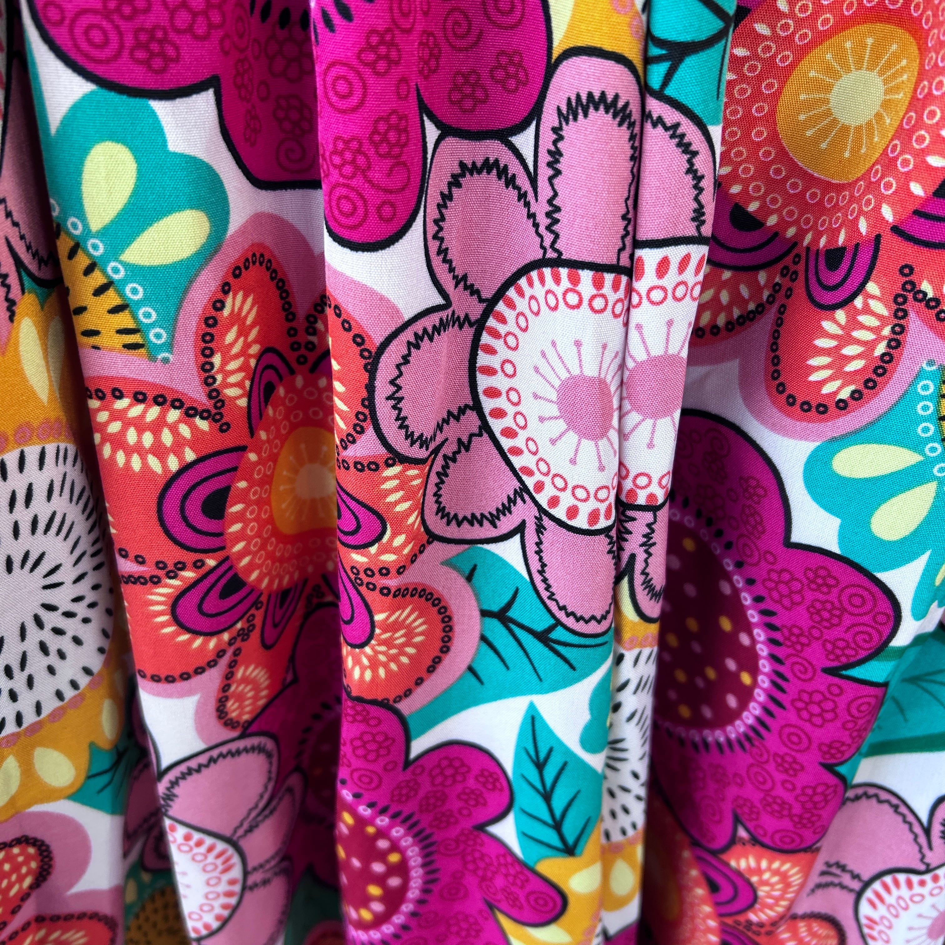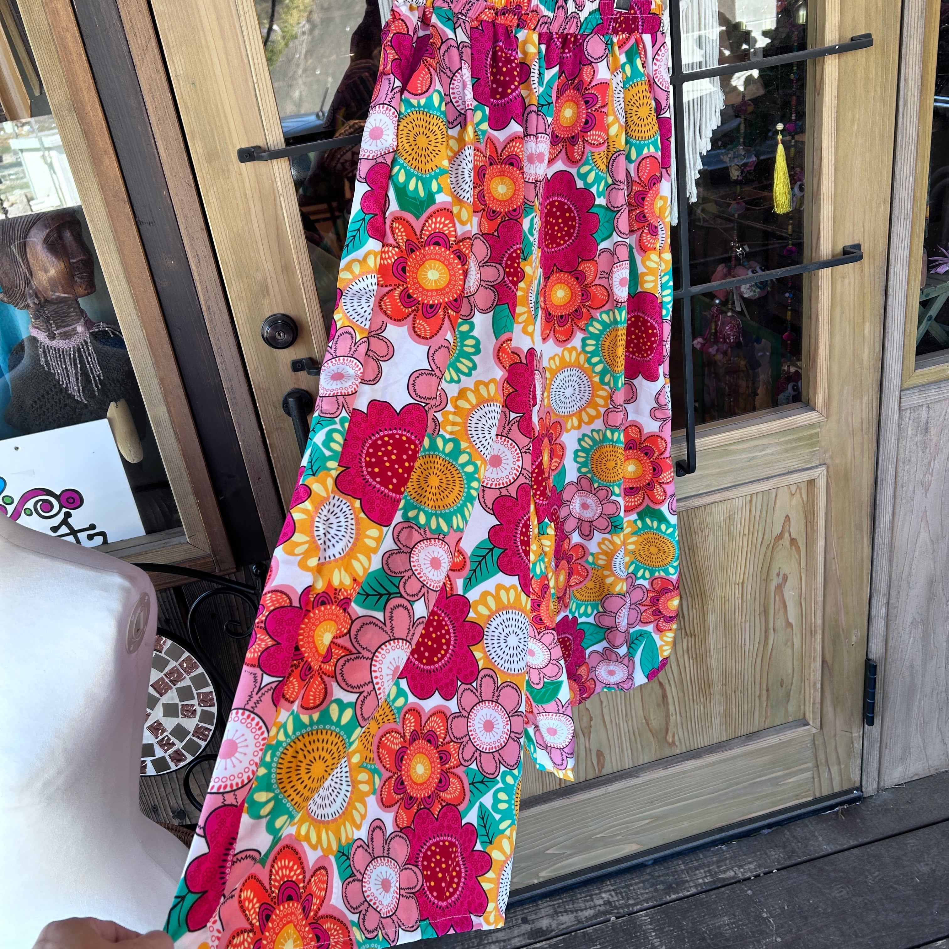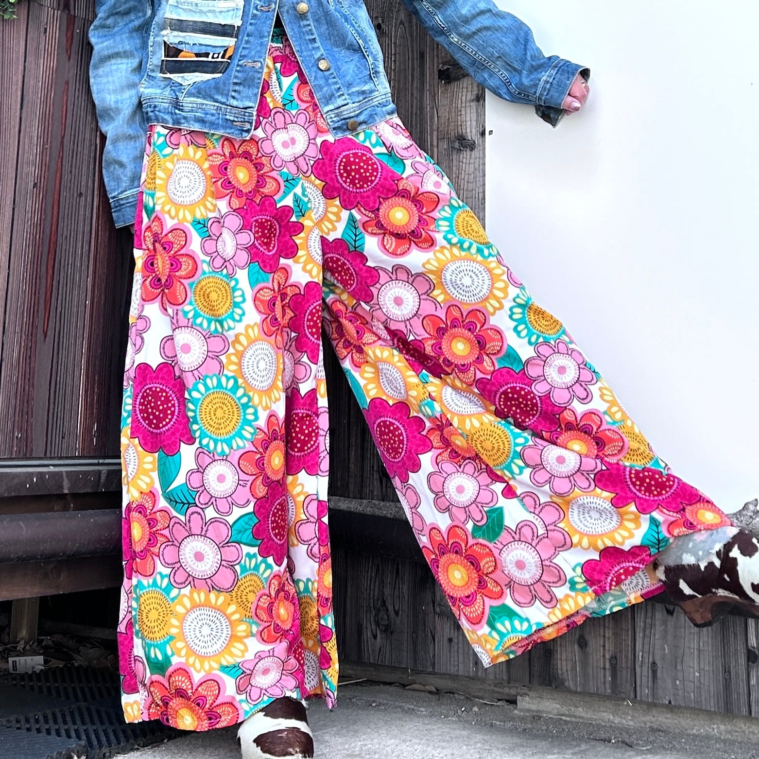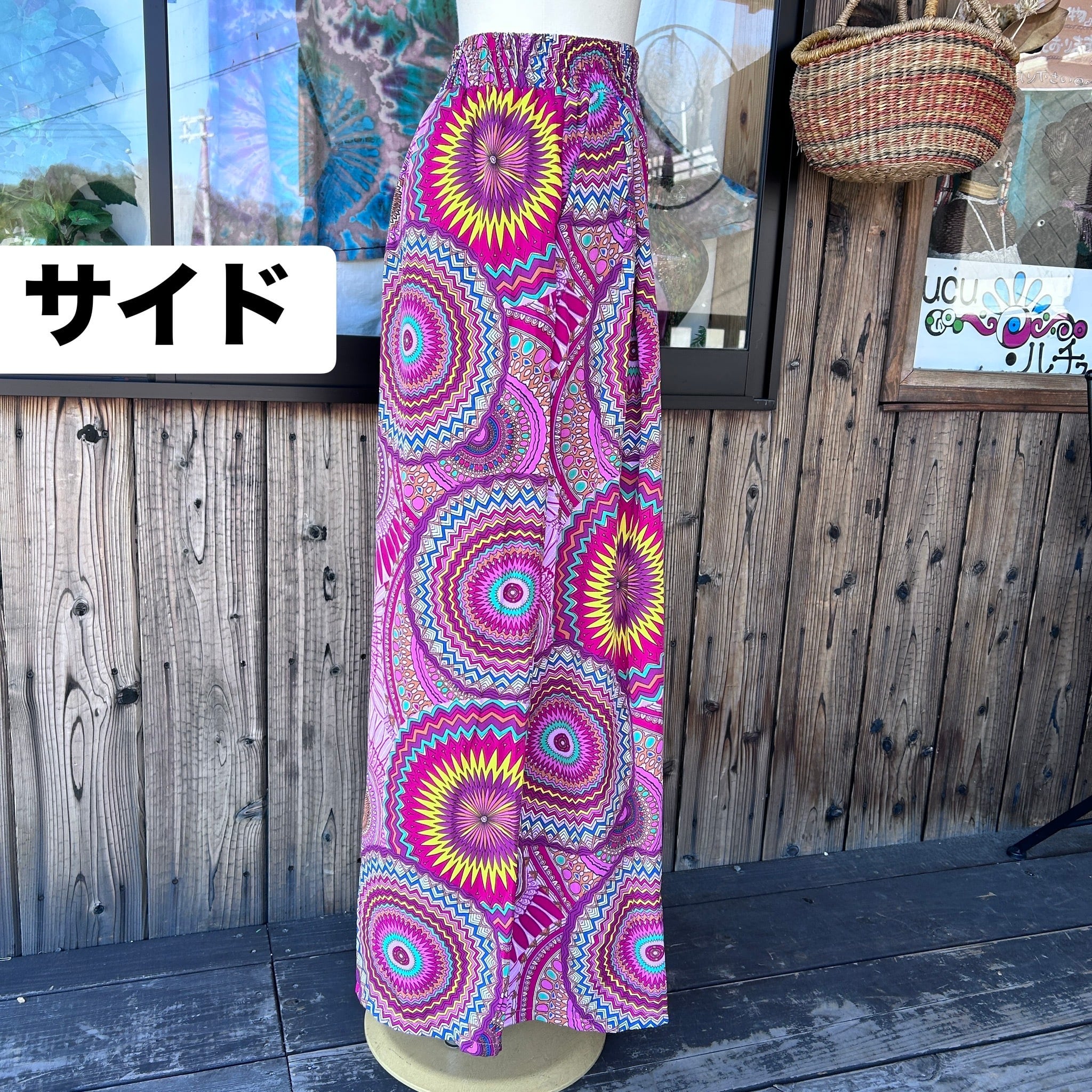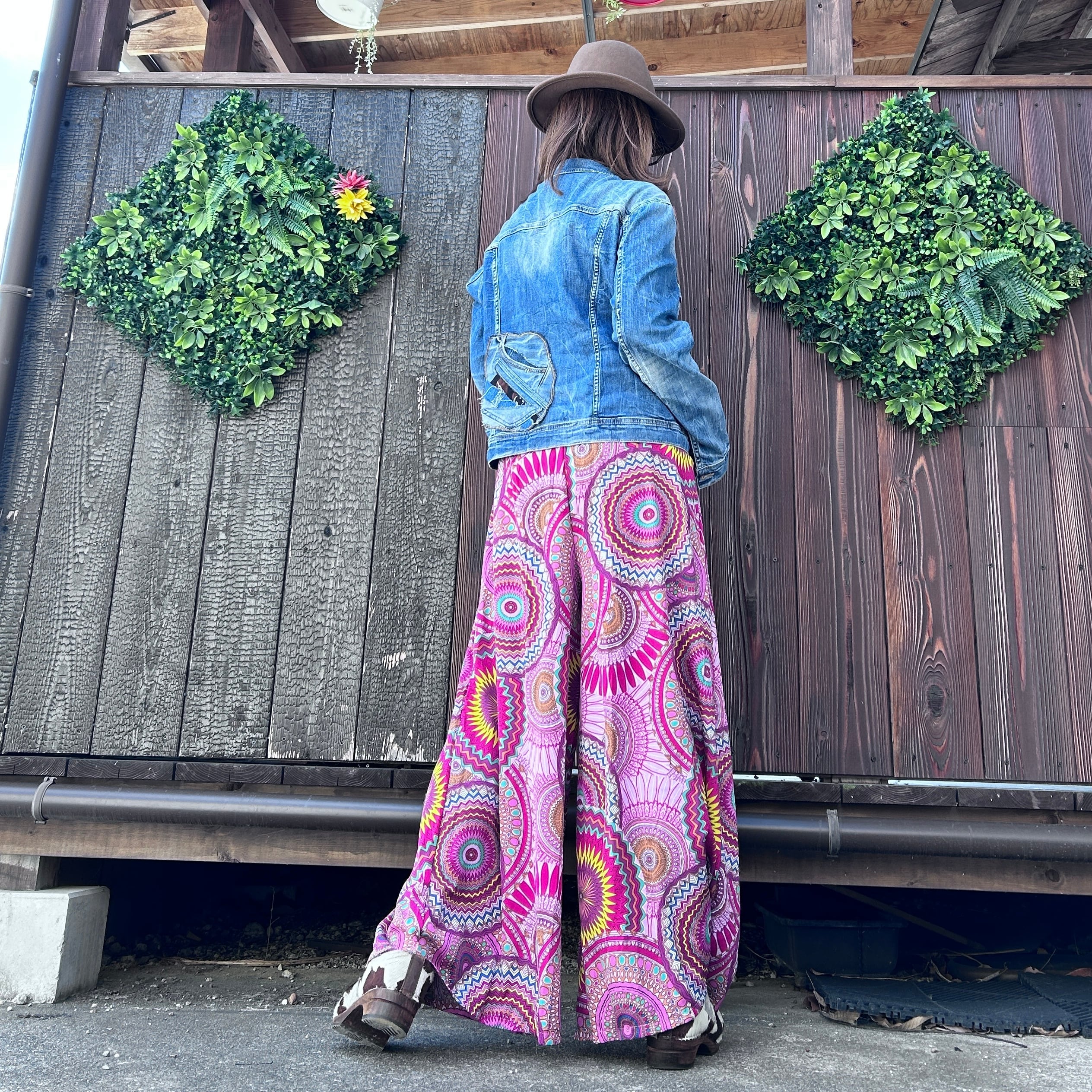目を惹くカラフルな幾何学柄が印象的なワイドパンツ。
