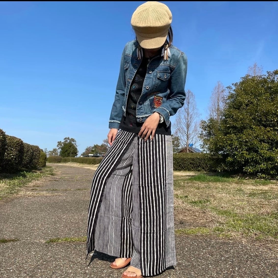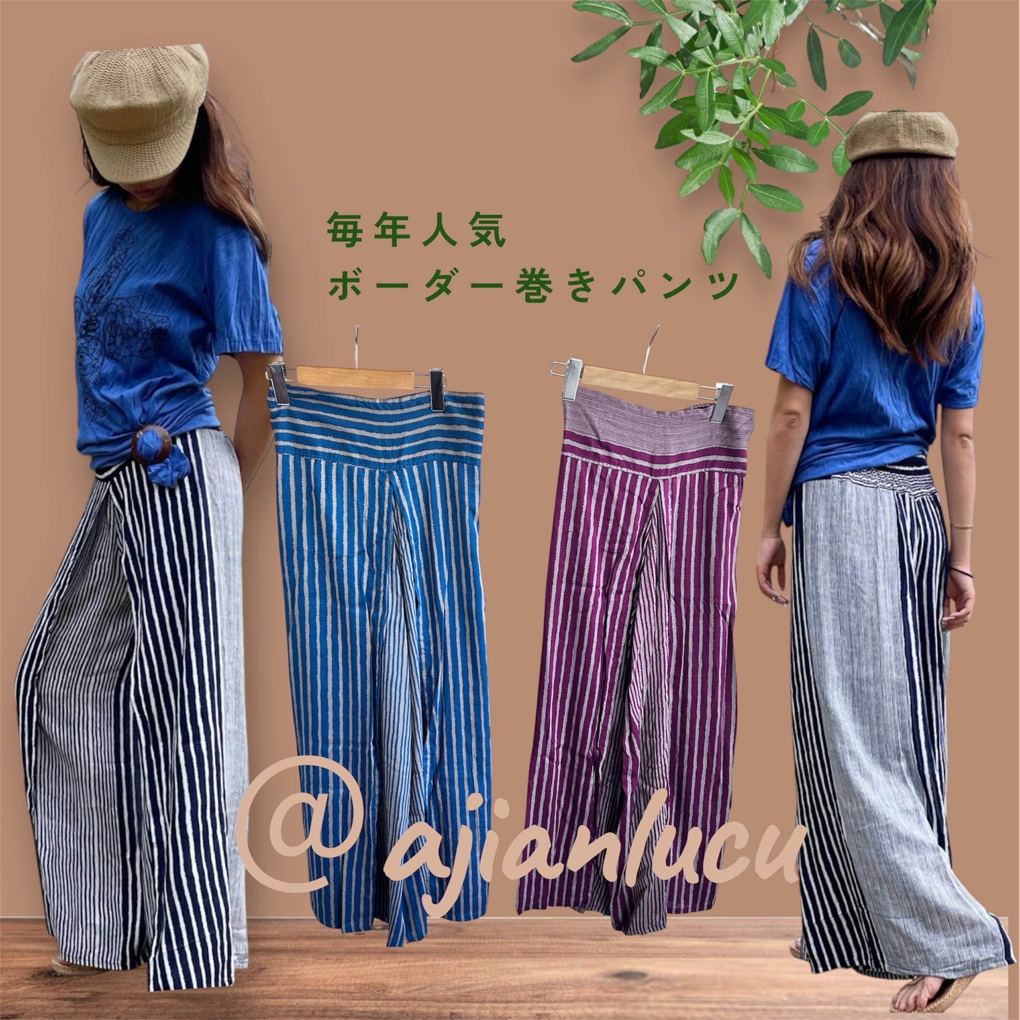 ストライプでエスニックでもカジュアルでも合わせやすいロングラップパンツです。