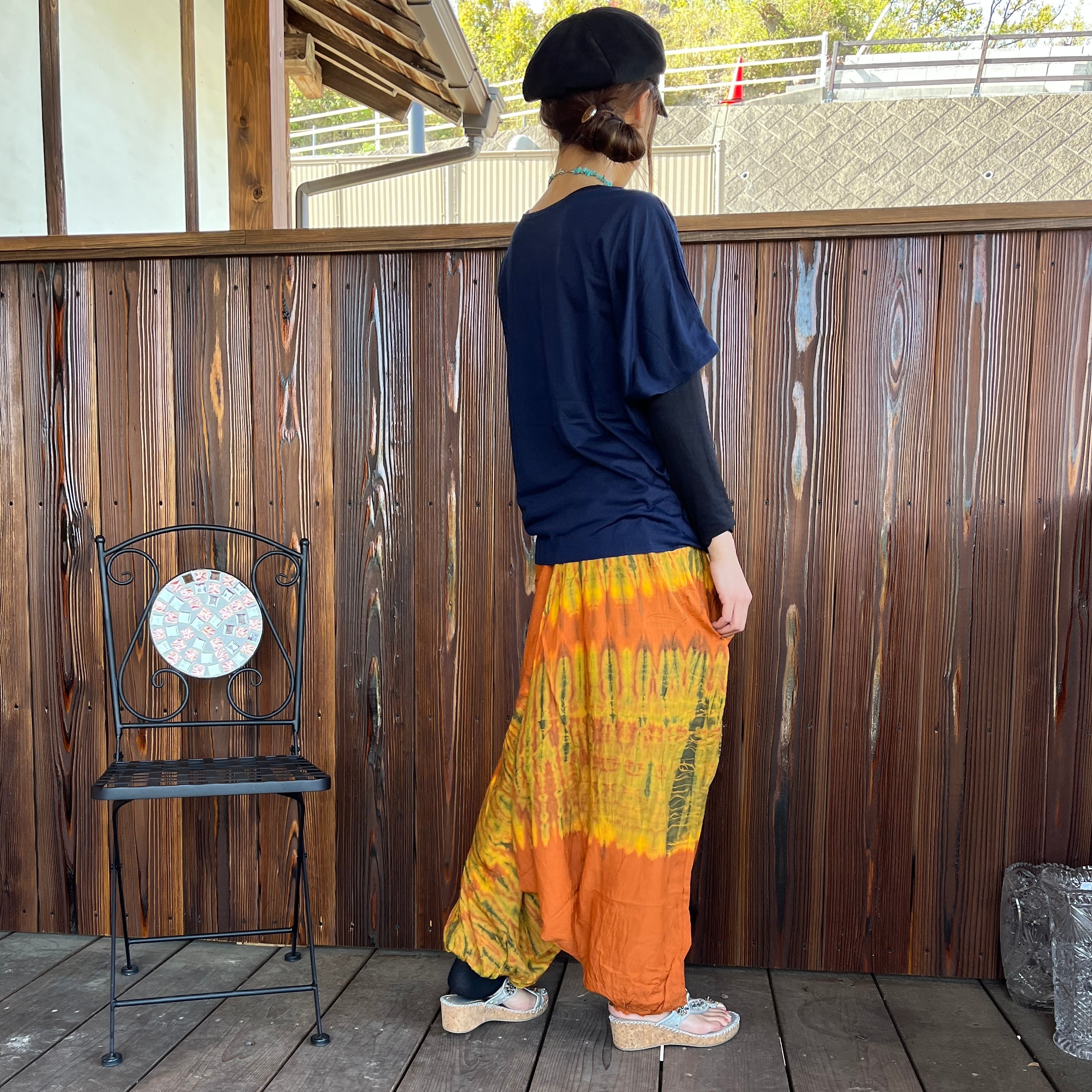 ウエストゴム、下半身はすっぽりカバーでストレスなくエスニックコーデが楽しめます。