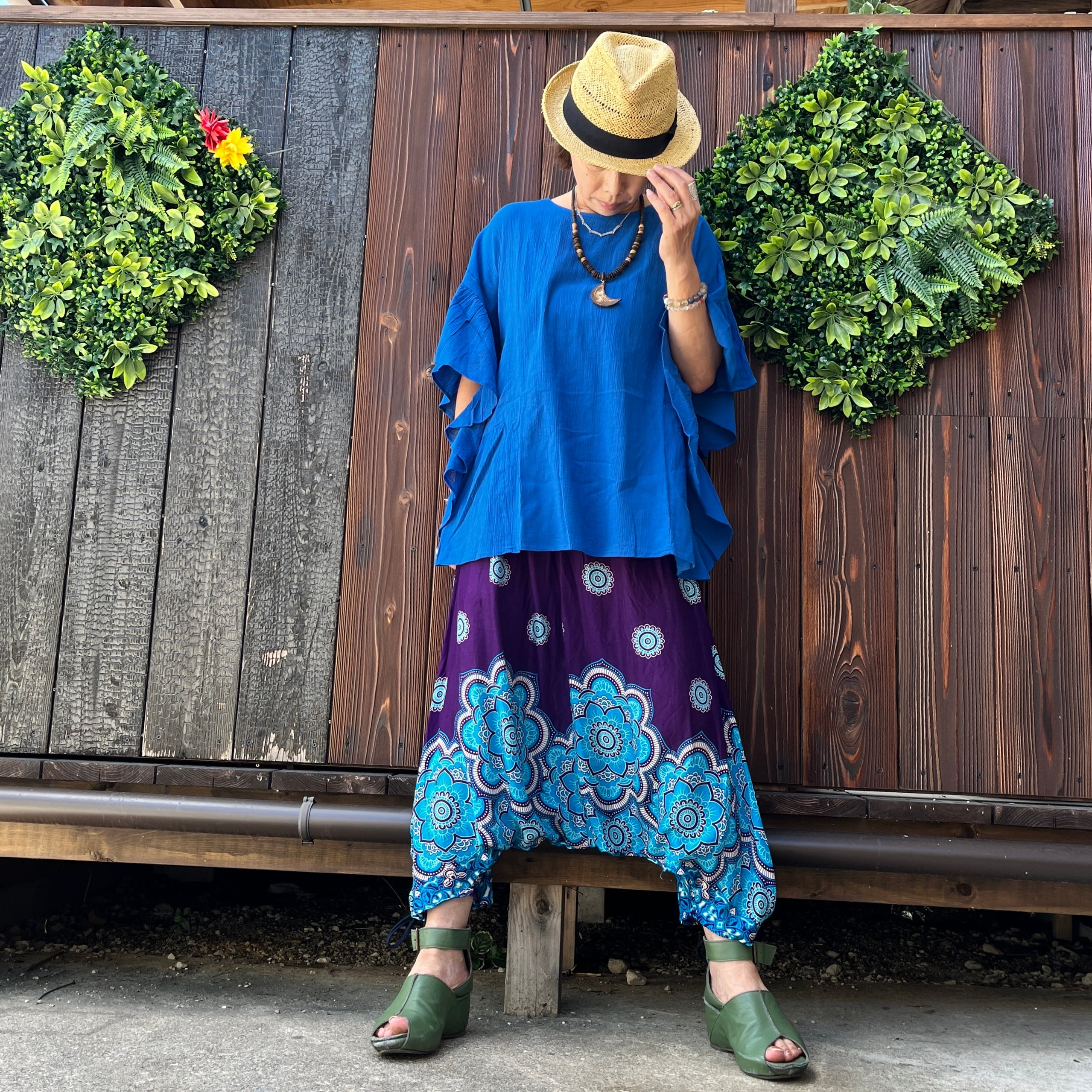 一見バルーンスカートのようなデザインのアラジンパンツ。