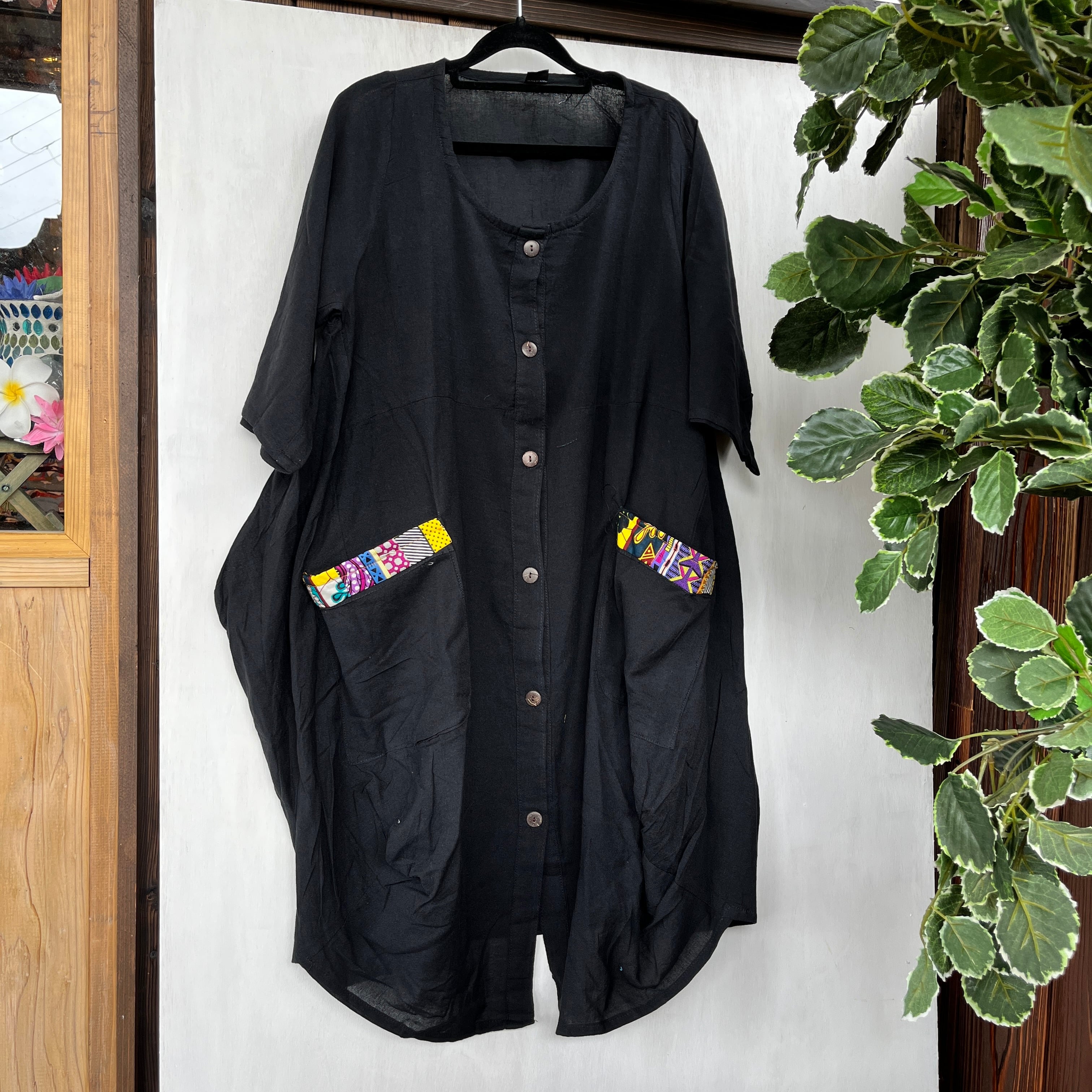 両サイドのぷっくりポケット、カンガ柄のパッチワークが個性的