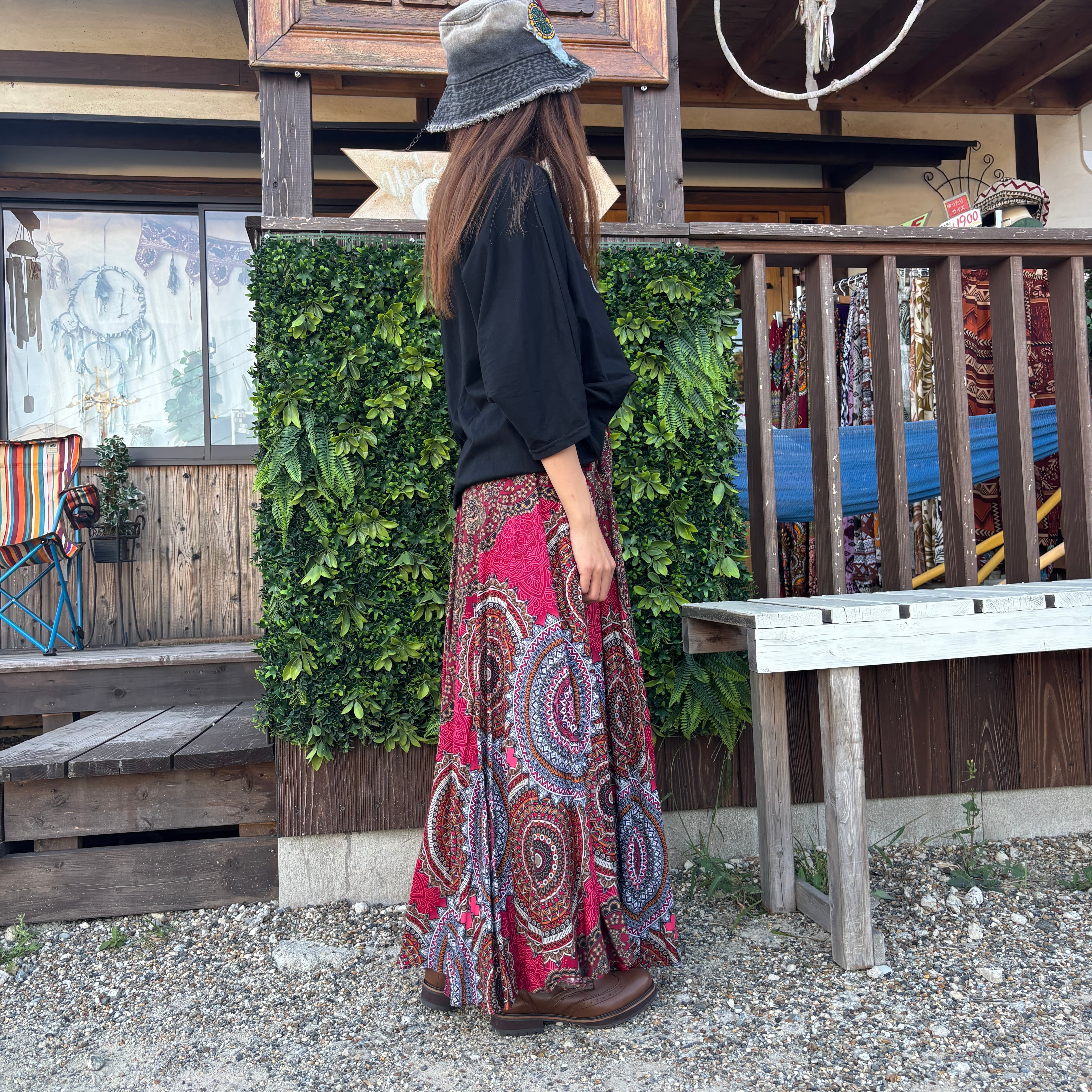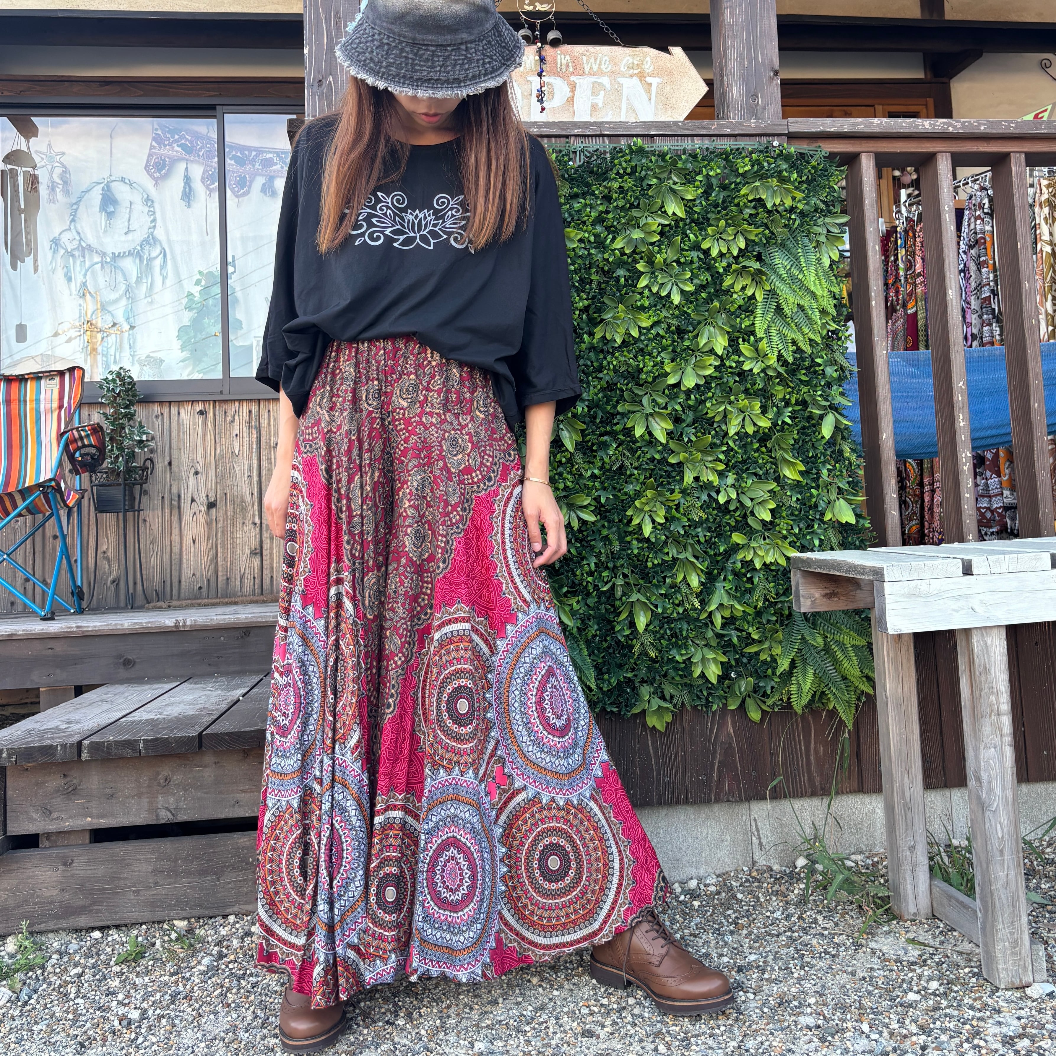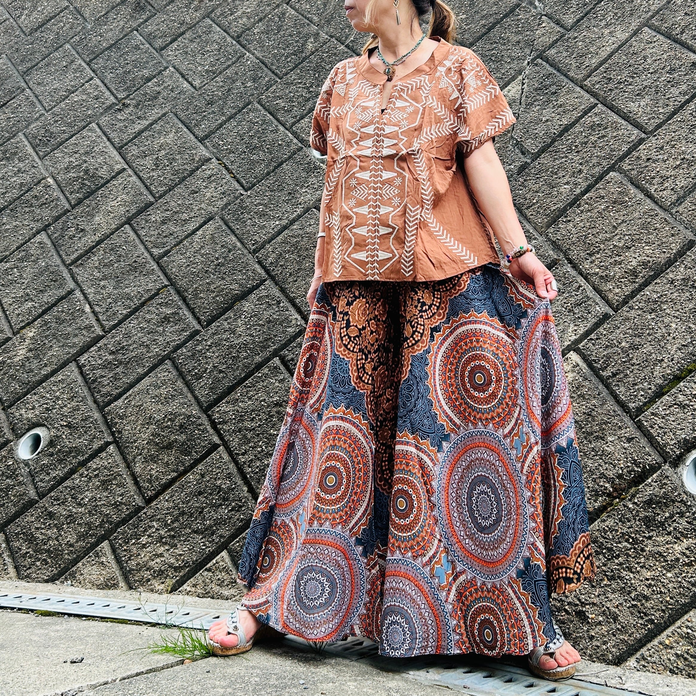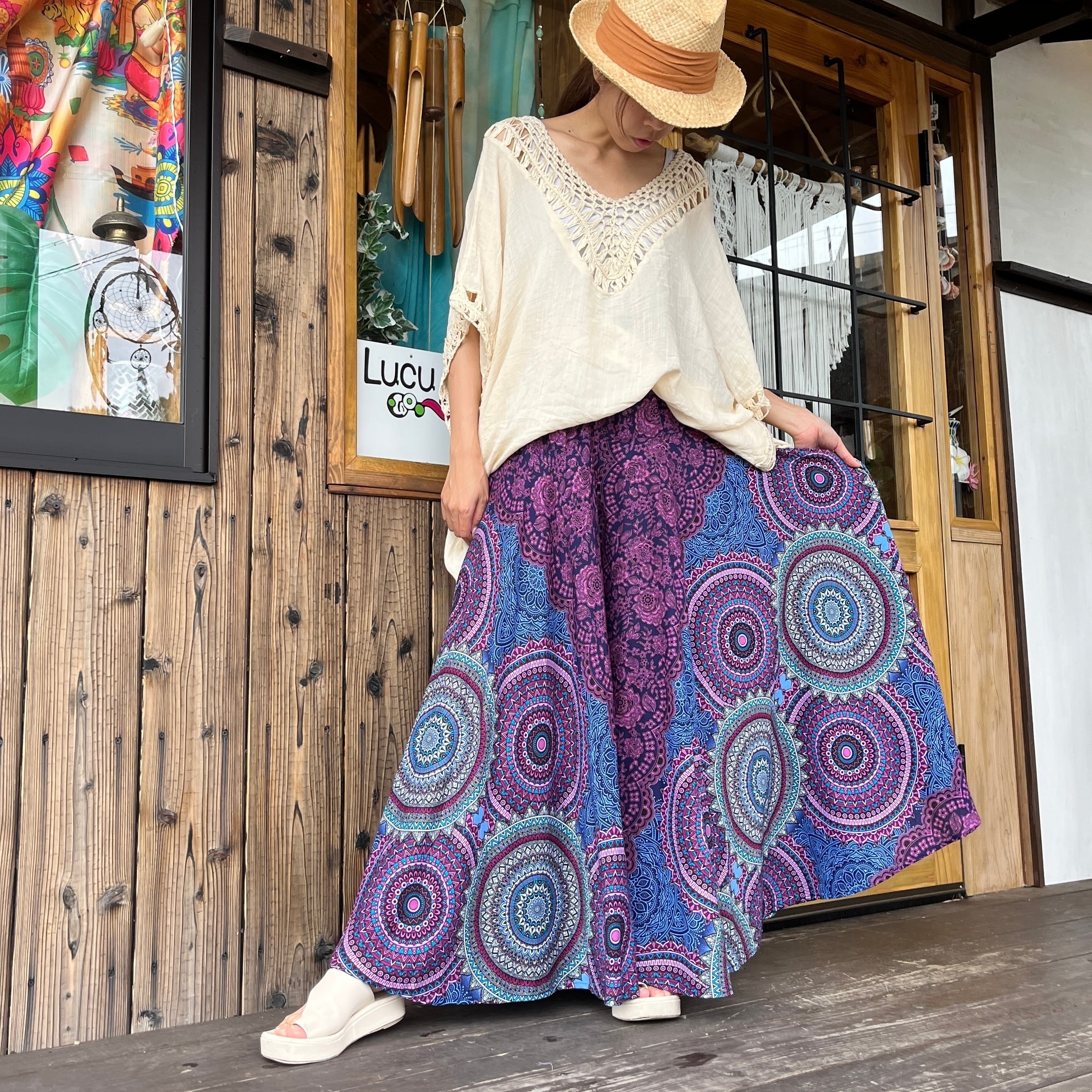 生地をたっぷり使った、ワイドなフレアパンツ。一見スカートに見え、生地も普通のワイドパンツの2倍つかっていますので、涼しくて楽々です。