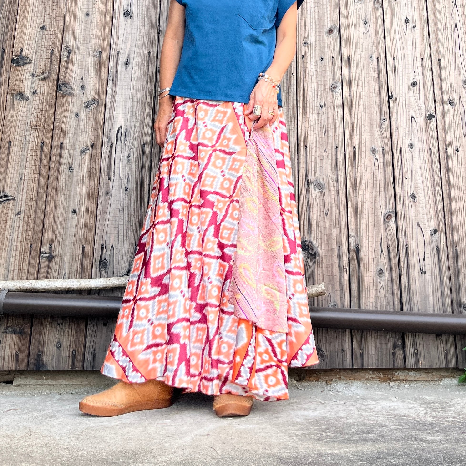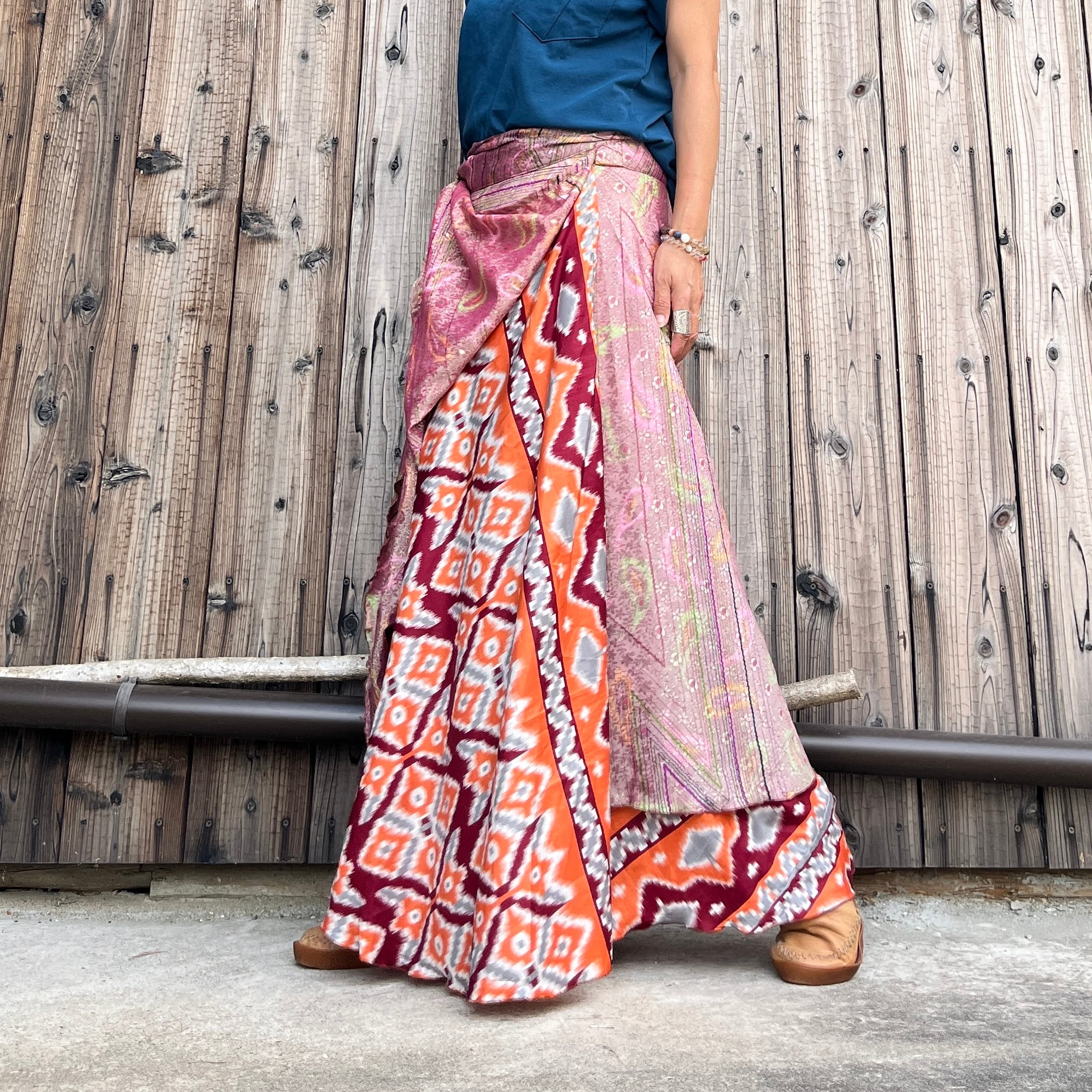 一枚で2通りのコーデが楽しめる、リバーシブルインドサリー巻きスカートです。