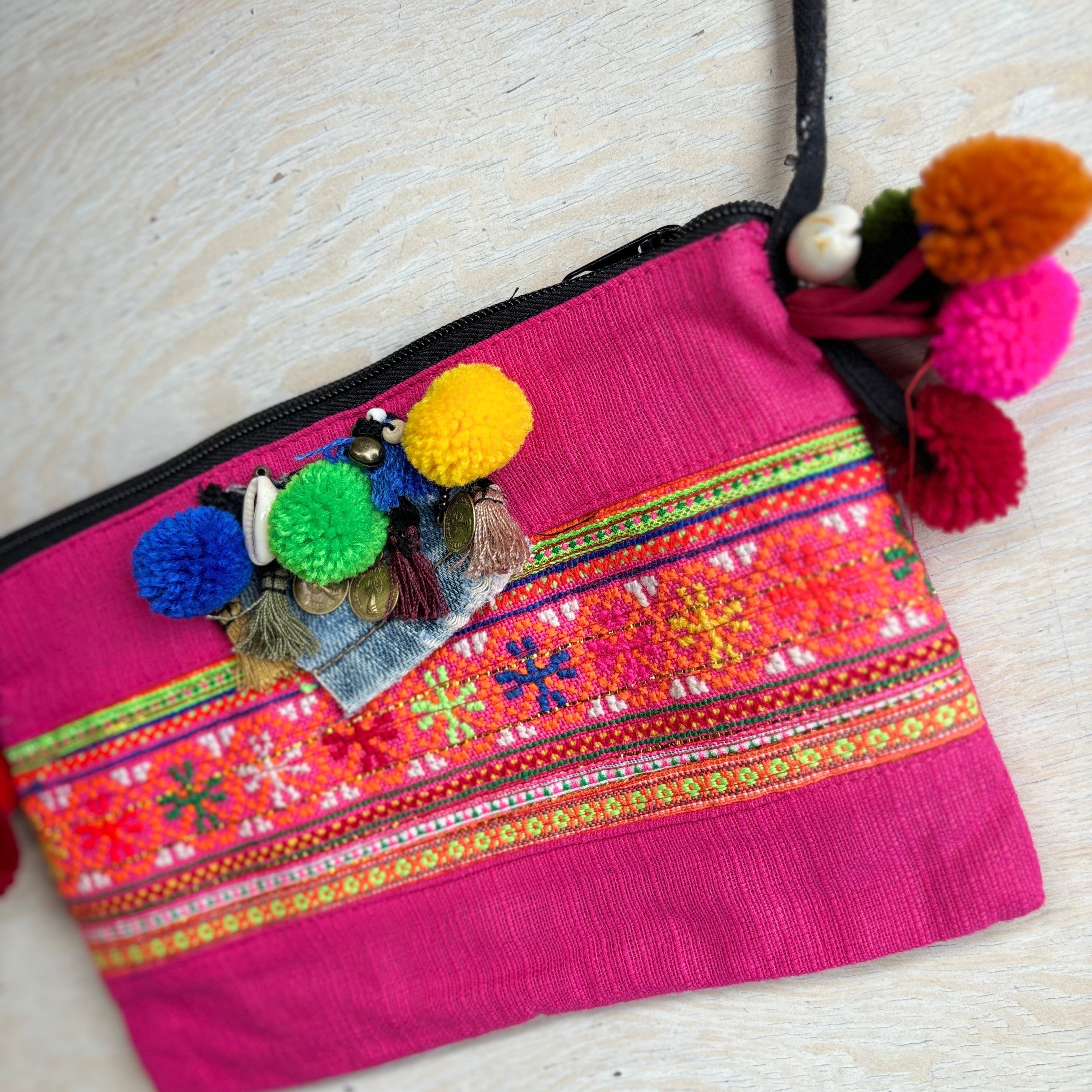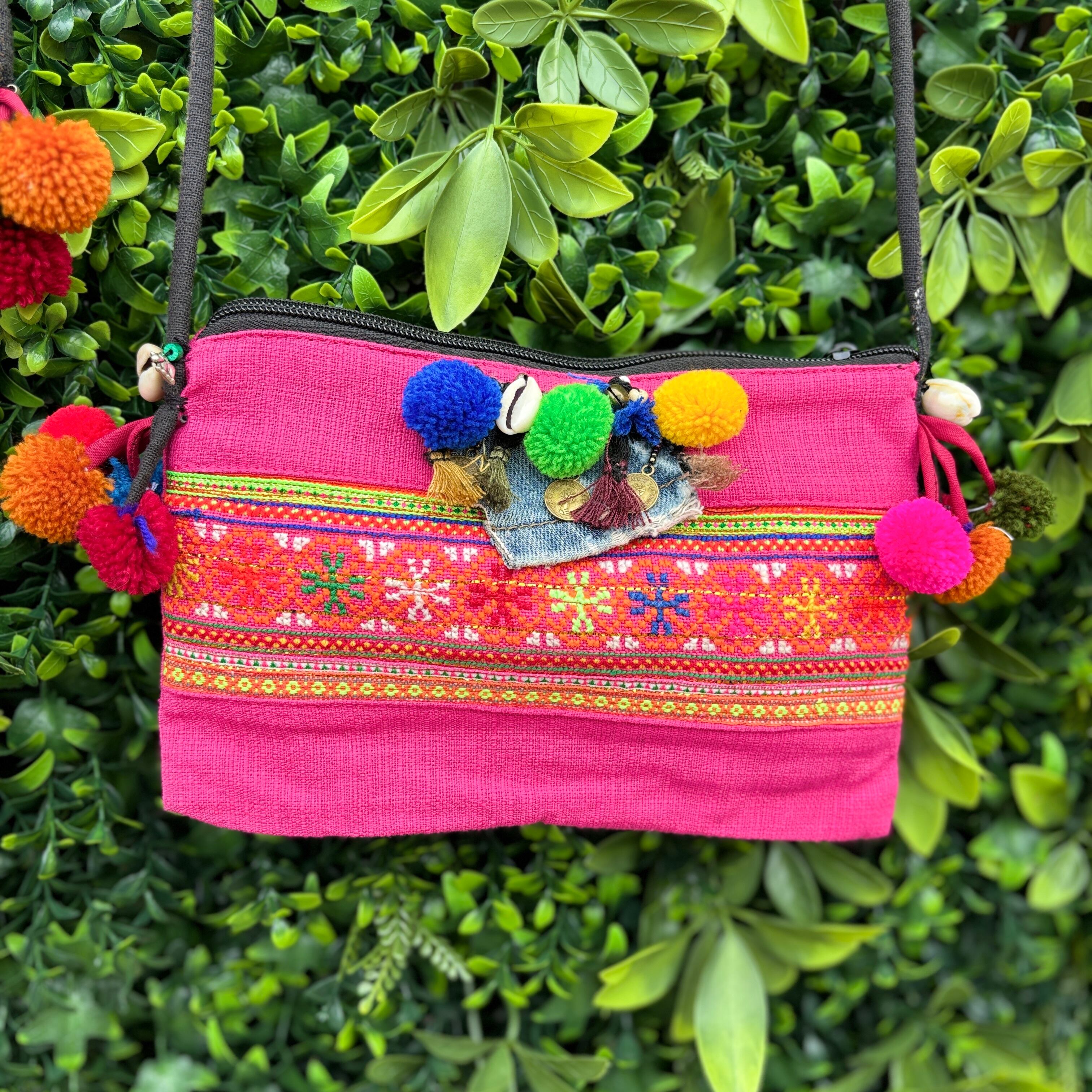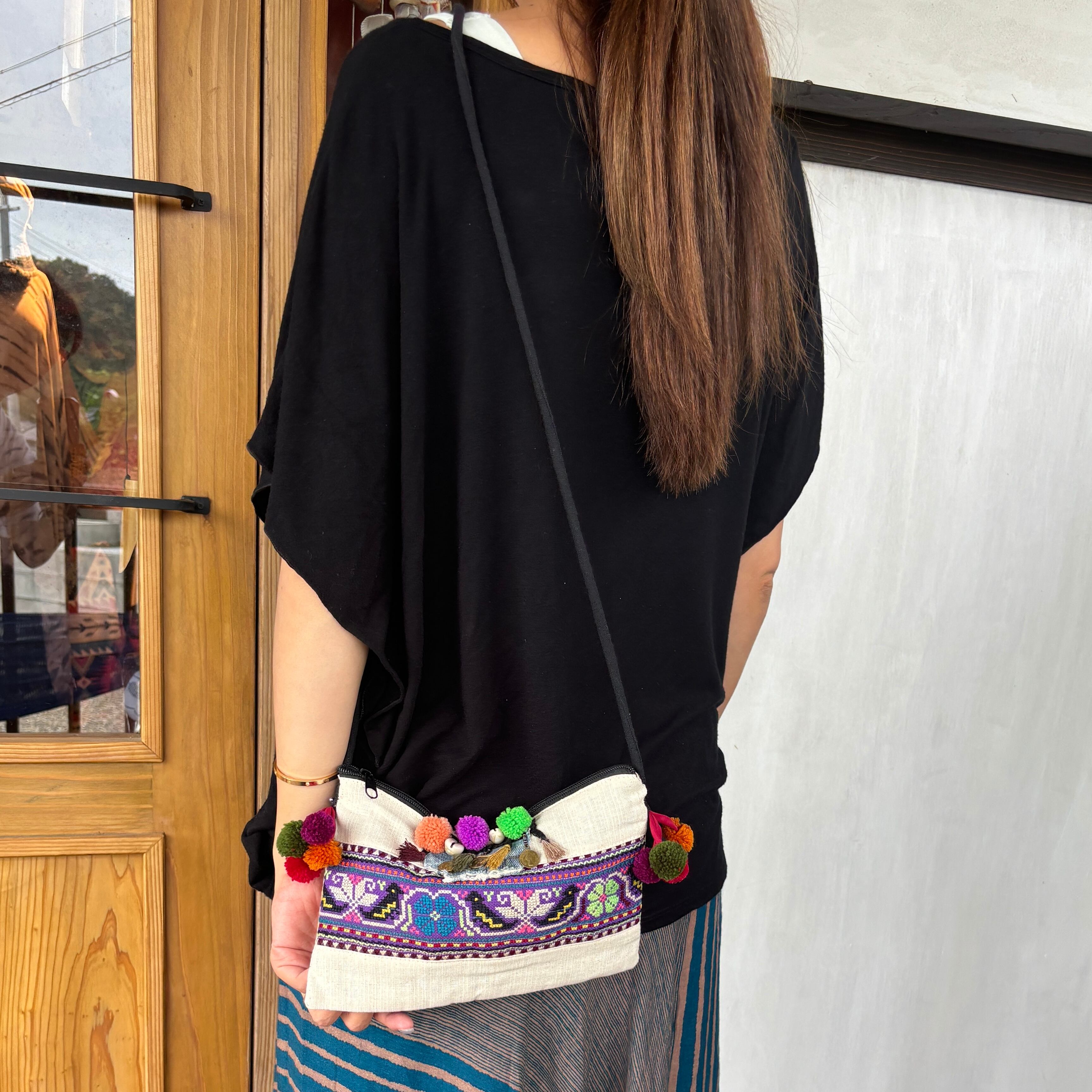 モン族ぽんぽんショルダーバッグは、その可愛らしい色合いと遊び心溢れるぽんぽんデザインが魅力のアイテムです。